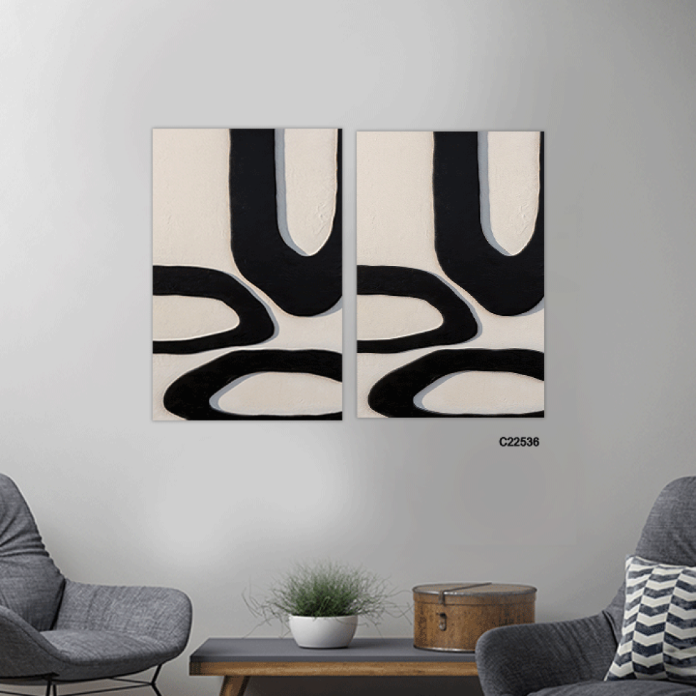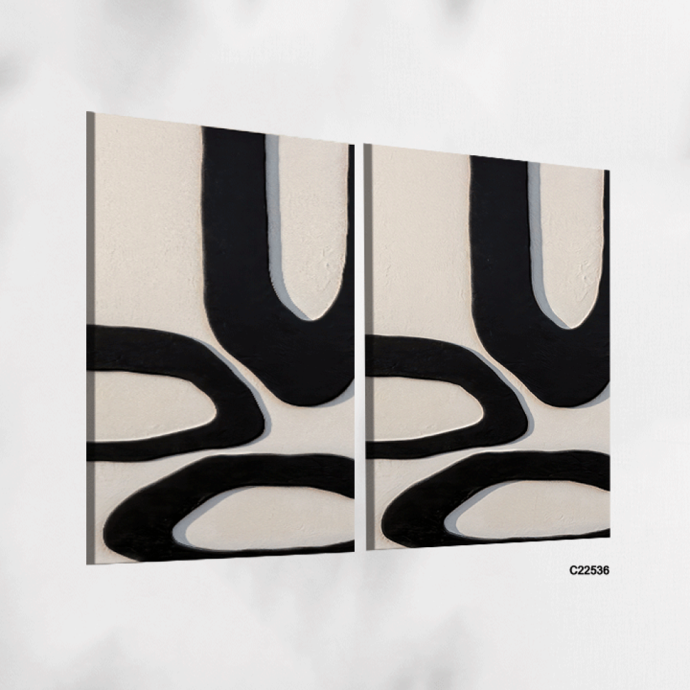 لوحة جدارية كانفس تصور أشكالًا عشوائية بتدرجات الأسود والبيج. تتميز هذه اللوحة بتصميمها العصري الذي يمزج بين البساطة والتعقيد، حيث تتداخل الأشكال العش...