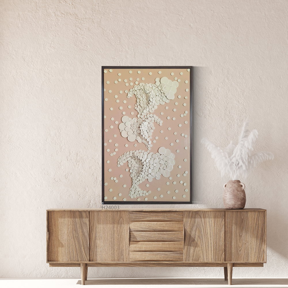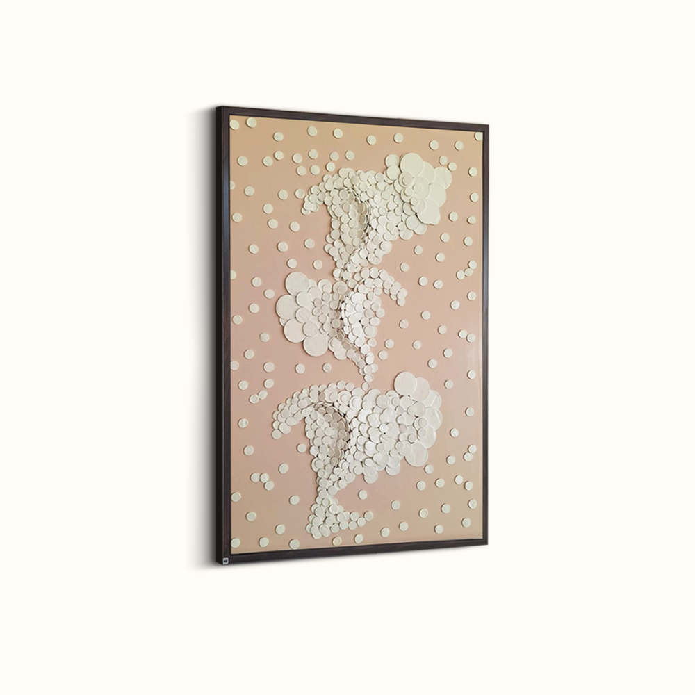 لوحة جبسية صغيرة تتميز بتفاصيل جبسية دائرية صغيرة باللون الأبيض، مع خلفية وردية ناعمة. اللوحة لديها تصميم بسيط وأيضًا أنيق، وتعتبر مميزة بتفاصيلها الم...