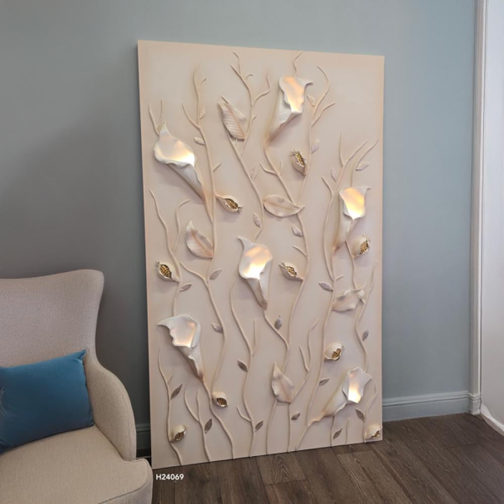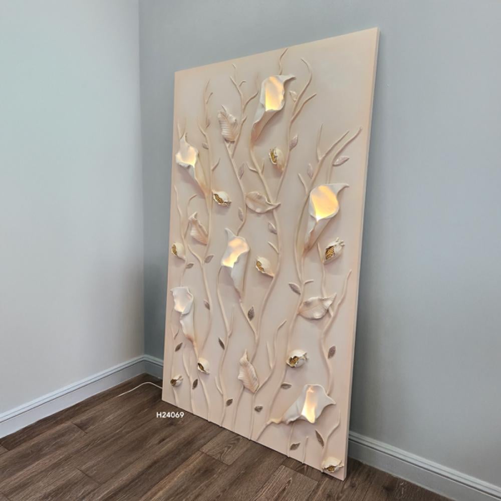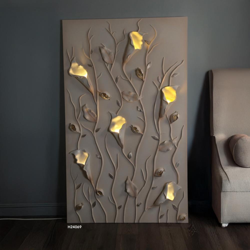 لوحة جبسية مضيئة تُجسد مشهدًا طبيعيًا شاعريًا بتصميم مستوحى من الزهور والسيقان المتسلقة. تتوزع الزهور على سطح اللوحة بأسلوب أنيق، وتنبثق منها إضاءة خا...