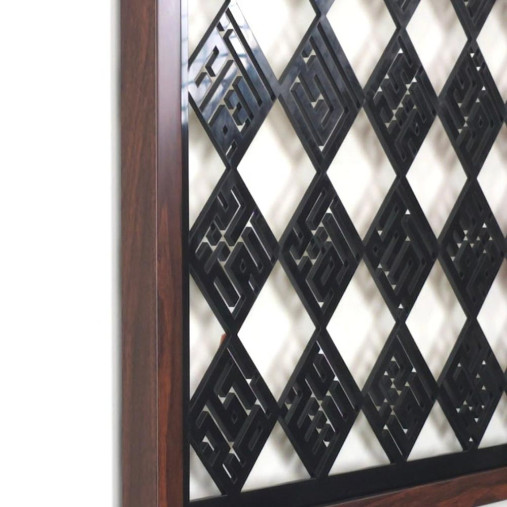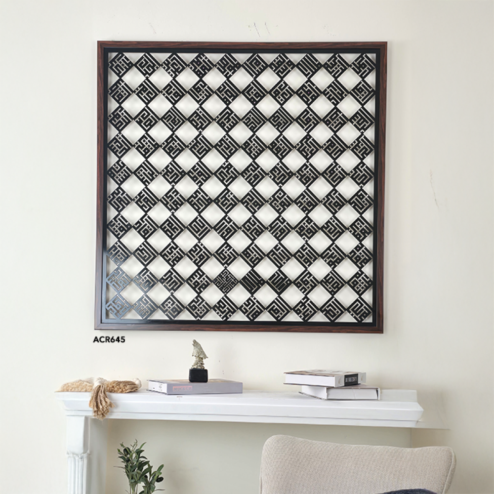 لوحة جدارية اكريليك بتصميم هندسي أنيق لأسماء الله الحسنى مكتوبة بخط كوفي مربع داخل أشكال مربعة مما يخلق تكوين بصري متناقم مؤطرة بإطار خارجي أنيق. لوحة جدارية من الأكريليك مقصوصة بالليزر- كود المنتج : ACR645- سهلة وجاهزة للتركيب لوجود حامل خلفي ومسامير مرفقة.- للتعديل على الألوان أو المقاس يرجى التواصل واتس على 0556823009.