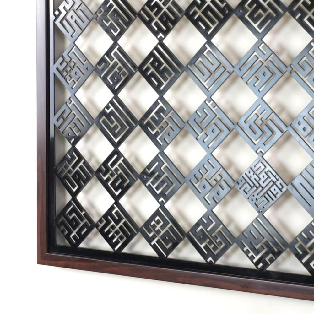 لوحة جدارية اكريليك بتصميم هندسي أنيق لأسماء الله الحسنى مكتوبة بخط كوفي مربع داخل أشكال مربعة مما يخلق تكوين بصري متناقم مؤطرة بإطار خارجي أنيق. لوحة...