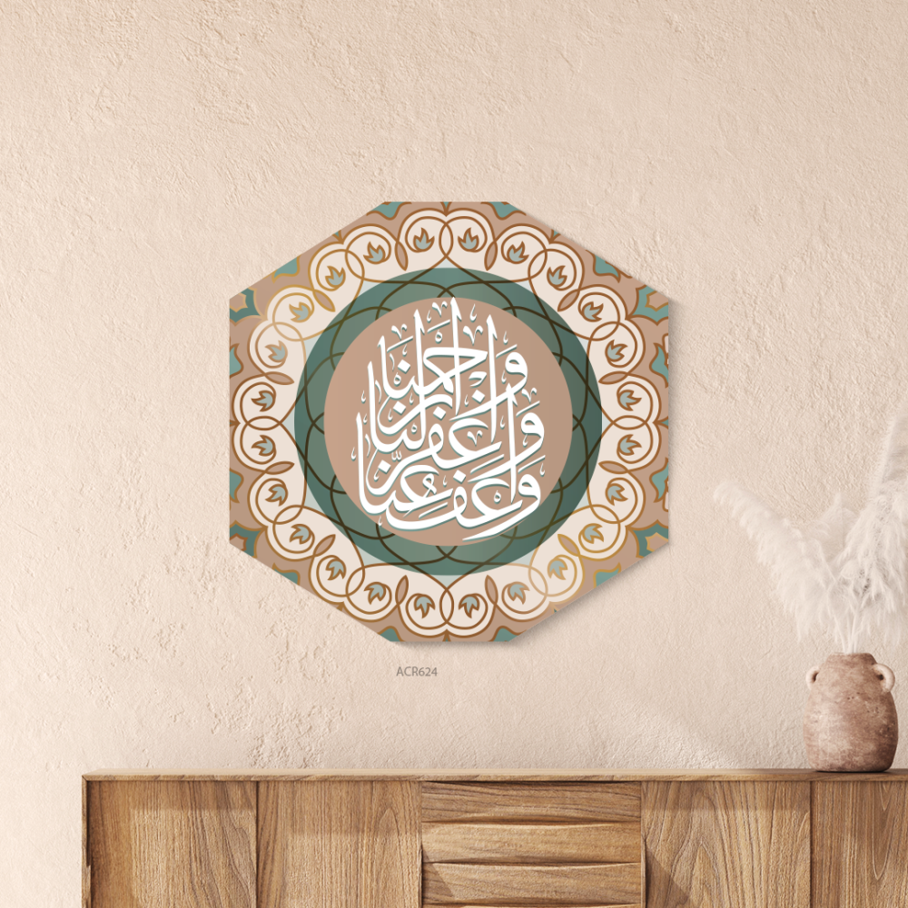 لوحة جدارية مصنوعة من الأكريليك، بتصميم هندسي مميز يتخذ شكلًا ثمانيًا. تزين اللوحة آية قرآنية كريمة مكتوبة بخط عربي أنيق، محاطة بزخارف إسلامية دقيقة و...