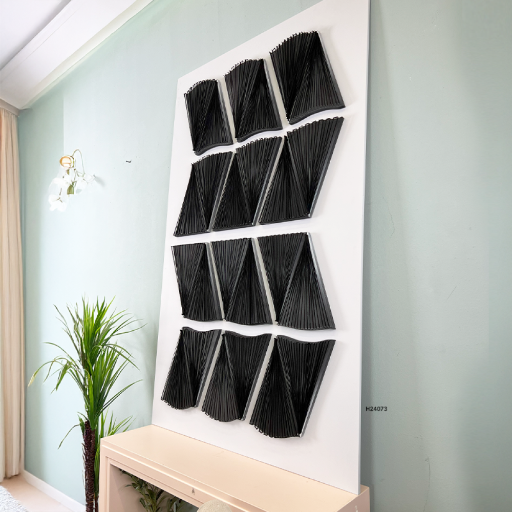 لوحة جدارية بتصميم هندسي لمثلثات من خيوط ومسامير مرتبة على لوحة خلفية بيضاء بتنسيق شبكي أنيقتُبرز الخطوط المنحنية والزوايا الحادة تباينًا بصريًا جذابًا، يجمع بين الانسيابية والدقة، مما يضفي طابعًا معاصرًا وجريئًا على المساحة- كود المنتج : H24073- سهلة التركيب لوجود حامل خلفي .- جاهزة للتركيب (يوجد مسامير او لاصق مرفقة مع الطلب) .-.- يمكن اختيار نوع وشكل الاطار حسب الطلب.- للتعديل على الألوان او المقاسيرجى التواصل واتس على 0556823009 .