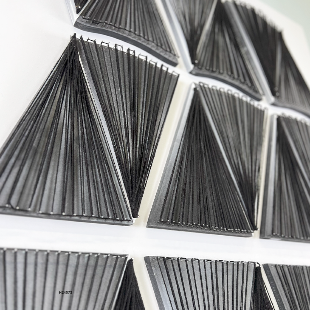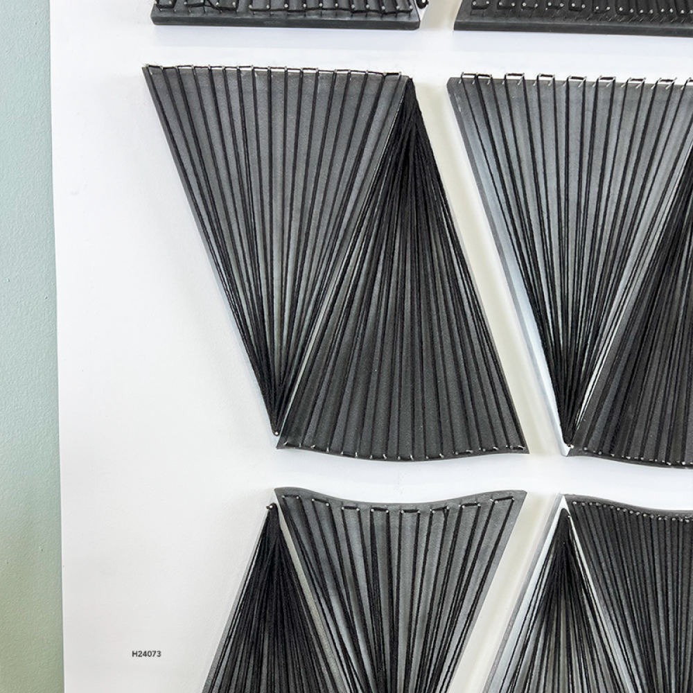 لوحة جدارية بتصميم هندسي لمثلثات من خيوط ومسامير مرتبة على لوحة خلفية بيضاء بتنسيق شبكي أنيقتُبرز الخطوط المنحنية والزوايا الحادة تباينًا بصريًا جذابً...