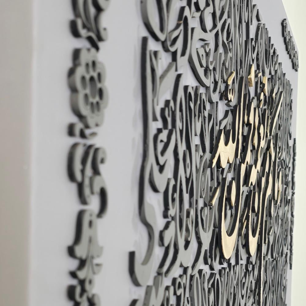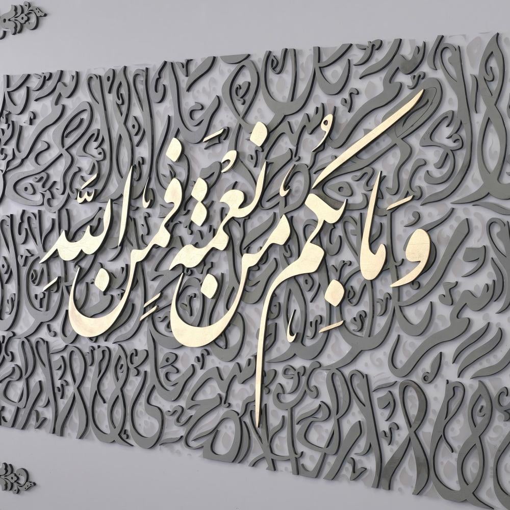 لوحة جدارية  فنية بخلفية من الحروف العربية واية قرانية( ومابكم من نعمة فمن الله ) من الخشب