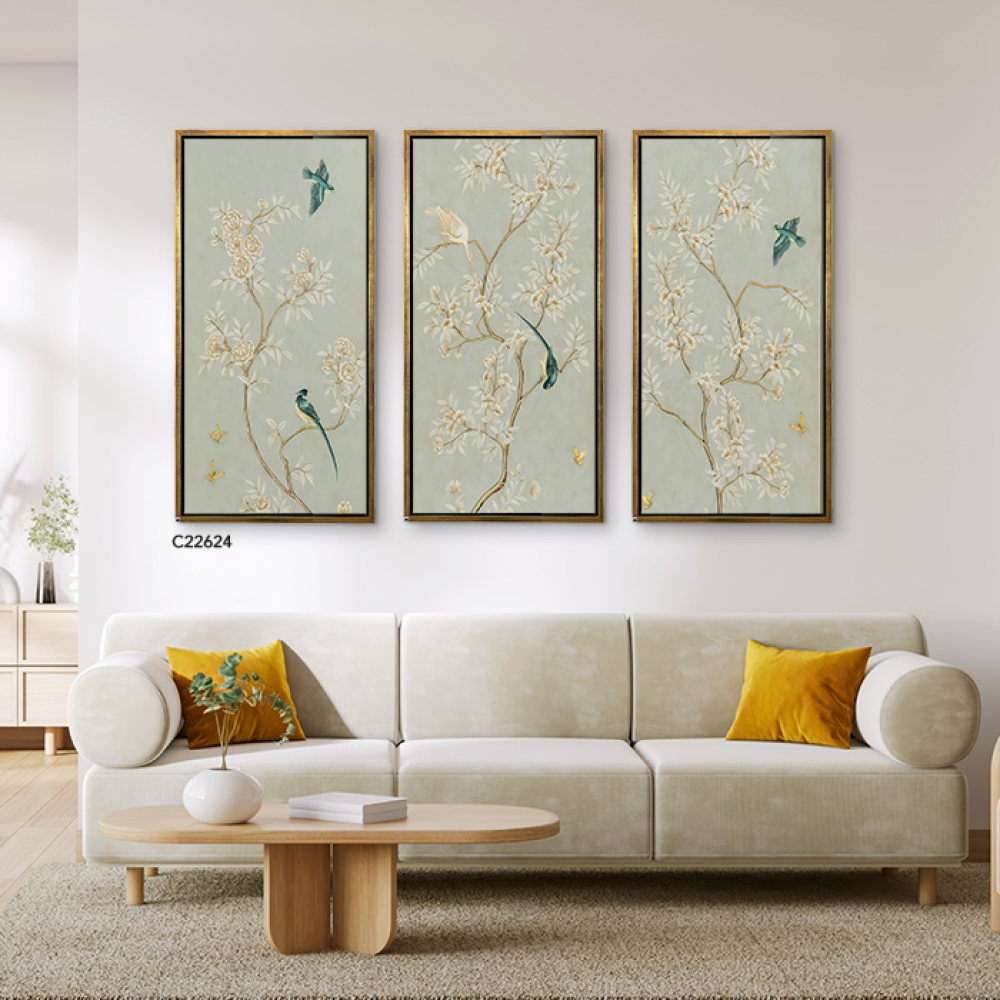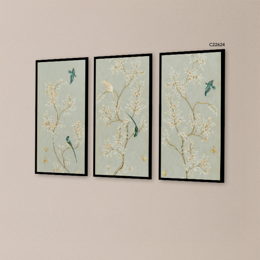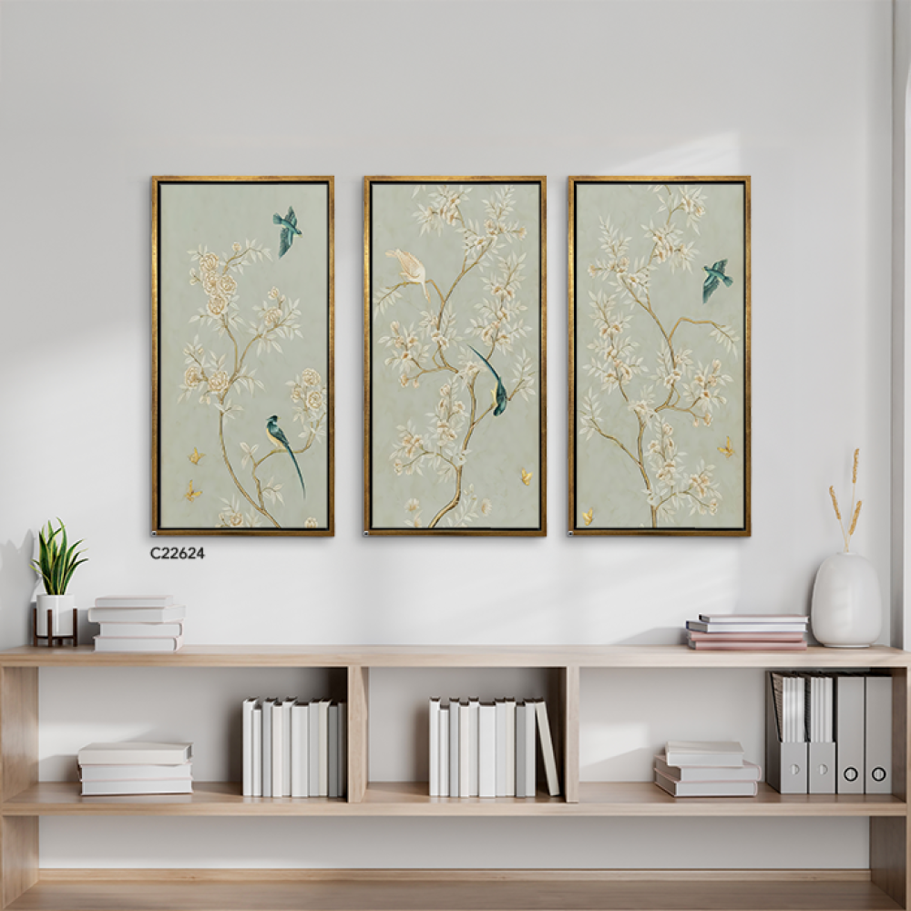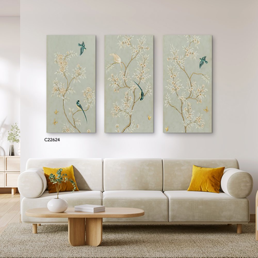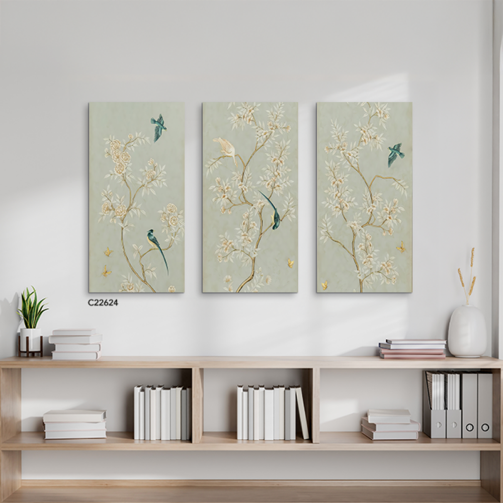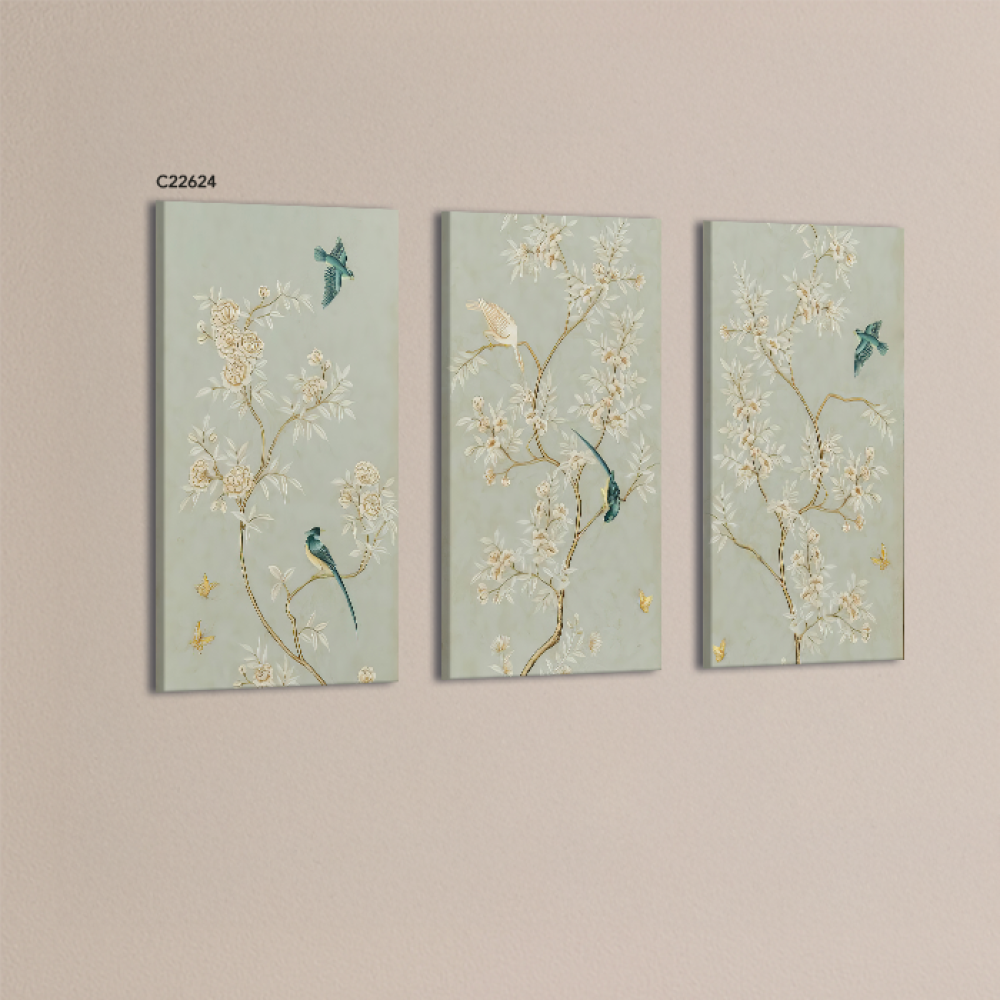 لوحة جدارية تتميز بخلفية باللون الأخضر الفاتح وتحتوي على رسومات فنية دقيقة لأغصان مزهرة بألوان هادئة مثل الذهبي والبيج. على الأغصان، توجد طيور ملونة ب...