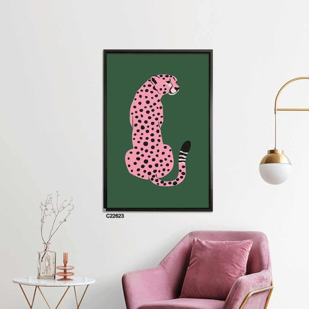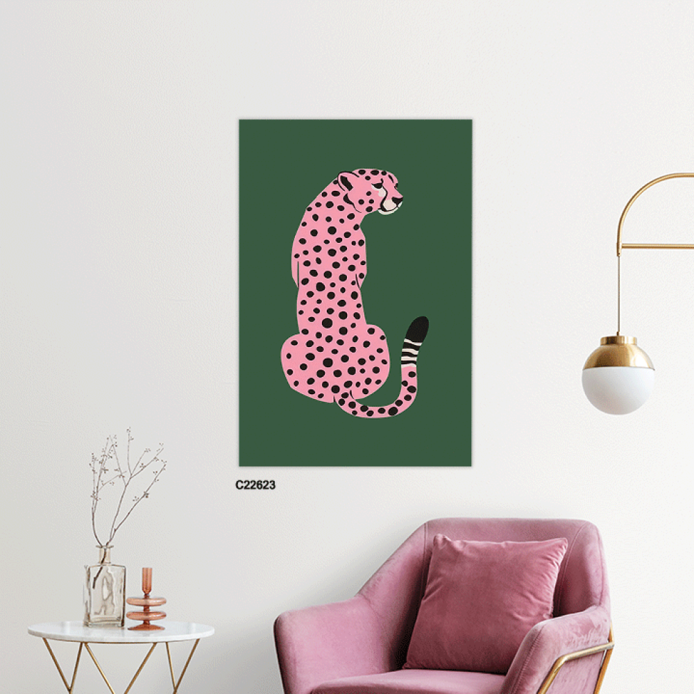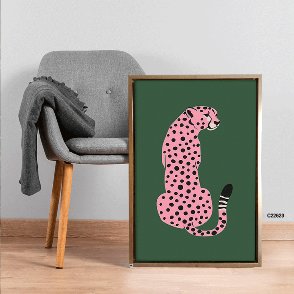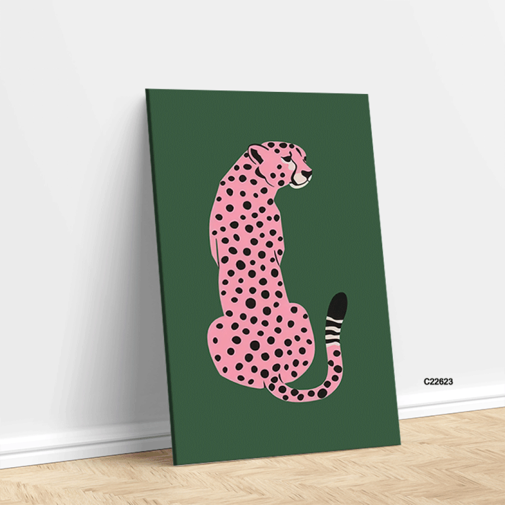 لوحة جدارية تصور فهداً مميزاً باللون الوردي، مما يمنحه طابعاً فريداً الخلفية باللون الأخضر تضيف تبايناً جريئاً ومشعاً، مما يجعل الفهد الوردي يبرز بشكل...