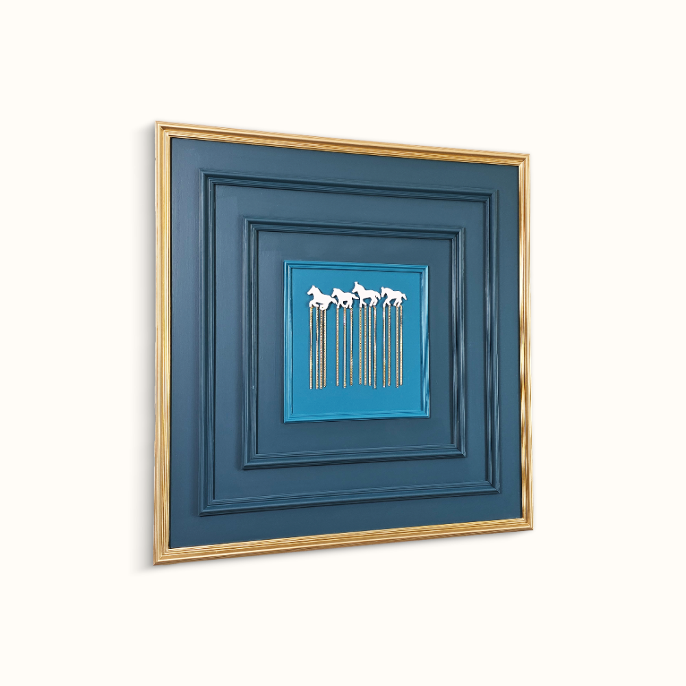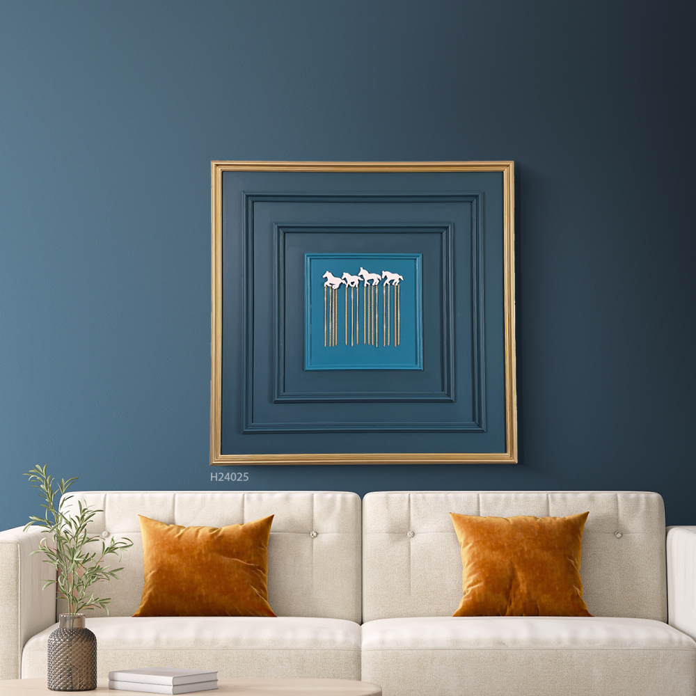 لوحة جدارية زرقاء تجمع بين الحداثة والأناقة، تتميز بإطار عميق ومقاطع من الخيول البيضاء في المنتصف على خلفية زرقاء داكنة مائلة إلى الكحلي. الإطار الذهب...