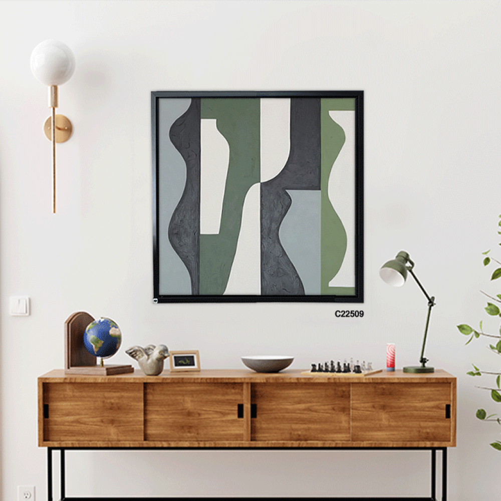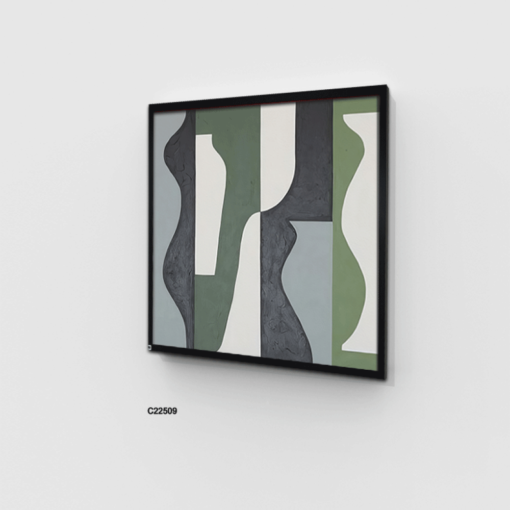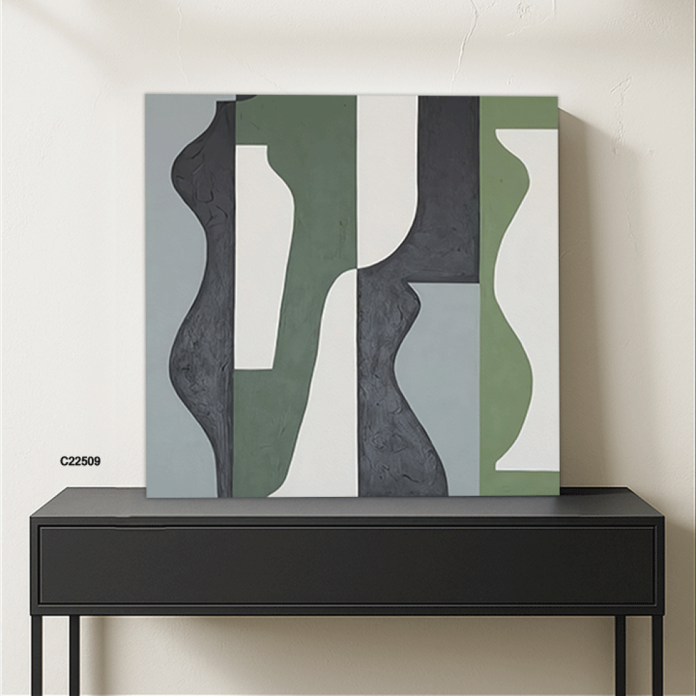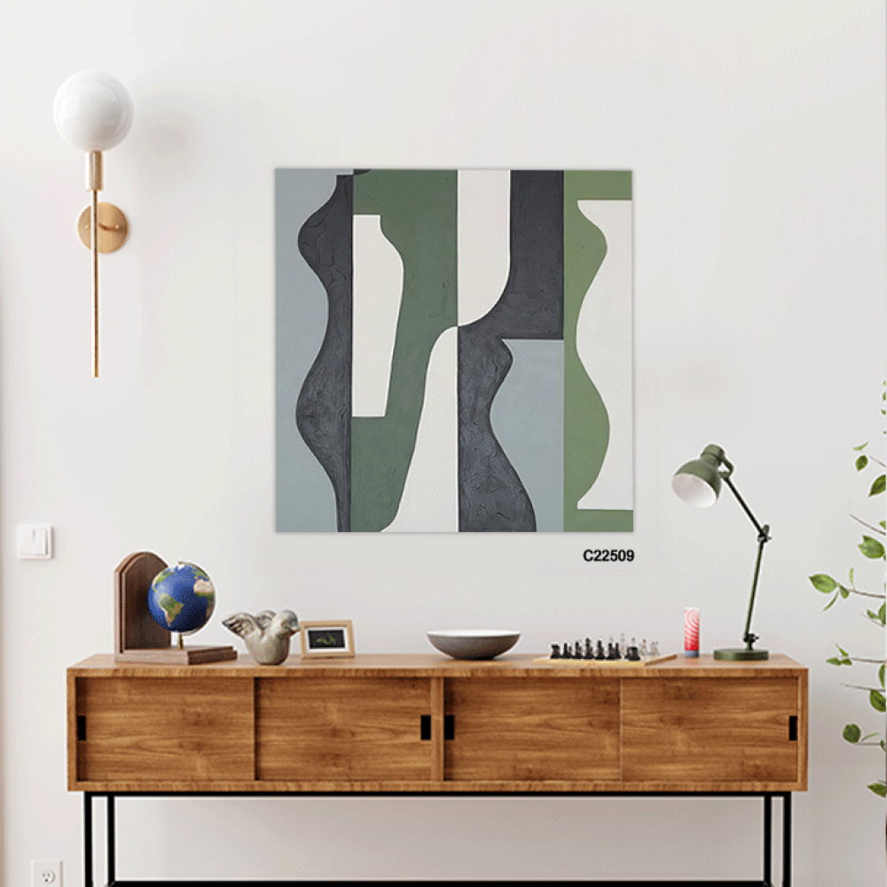 لوحة جدارية فنية تشكيلية تدرجات الازرق والاخضر والرمادي تعتمد على الأسلوب التشكيلية، حيث تتداخل الألوان وتندمج بانسيابية، مما يخلق تأثيرات بصرية جذابة ، يضفي اللون الازرق على اللوحة شعوراً بالهدوء والسكينة وتندمج تدرجات الاخضر لتضفي طاقة وحيوية حيث تتناغم الألوان معاً لتشكل مشهداً يبعث على الراحة والتأمل ، تتنوع الانماط بين الأشكال الهندسية البسيطة والخطوط الحرة التي تتماوج بشكل طبيعي، مما يخلق توازناً بين الهيكل والفوضى المنظمة. هذه اللوحة اضافة مثالية للمجالس وغرف المعيشة