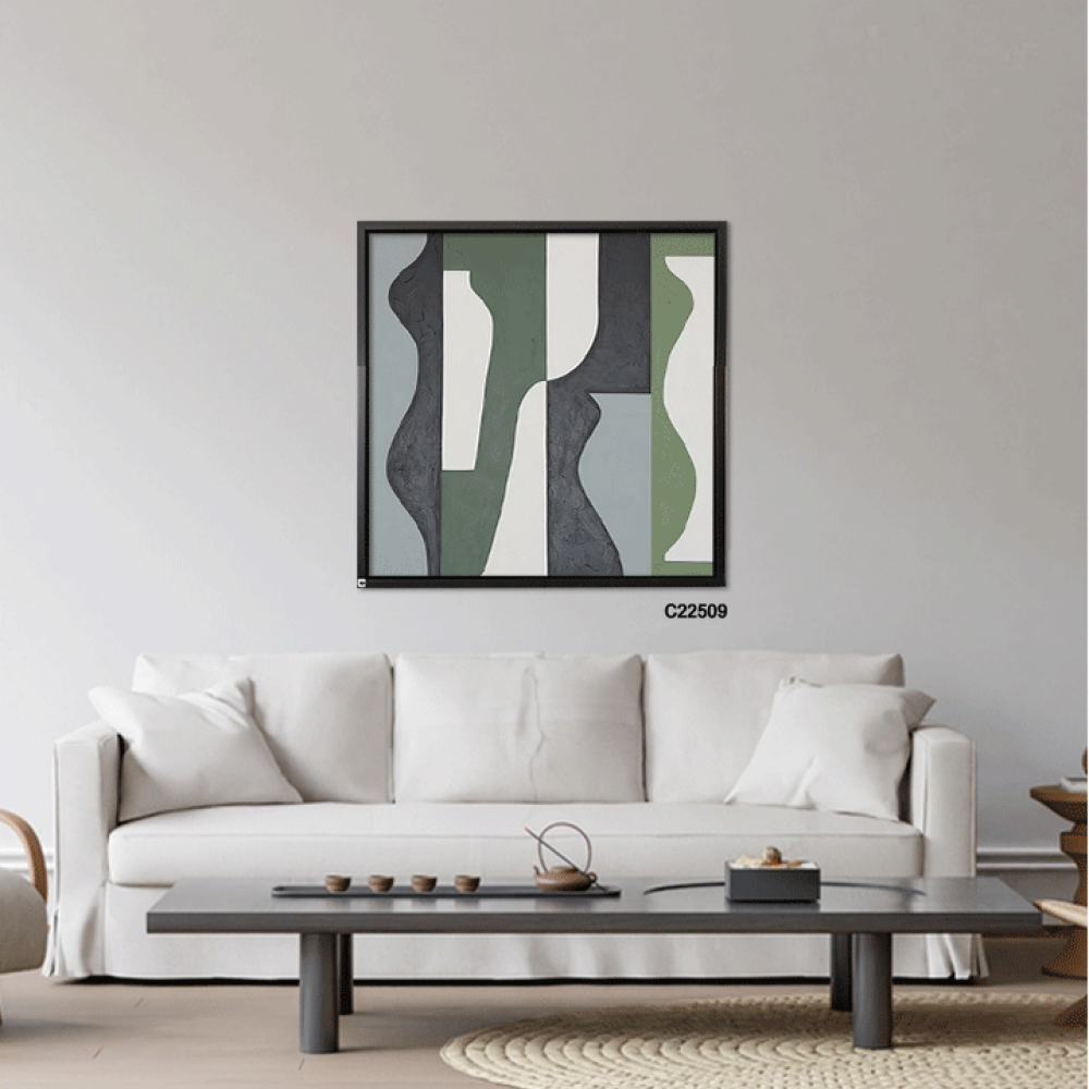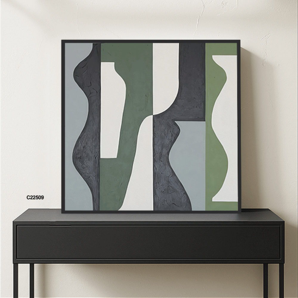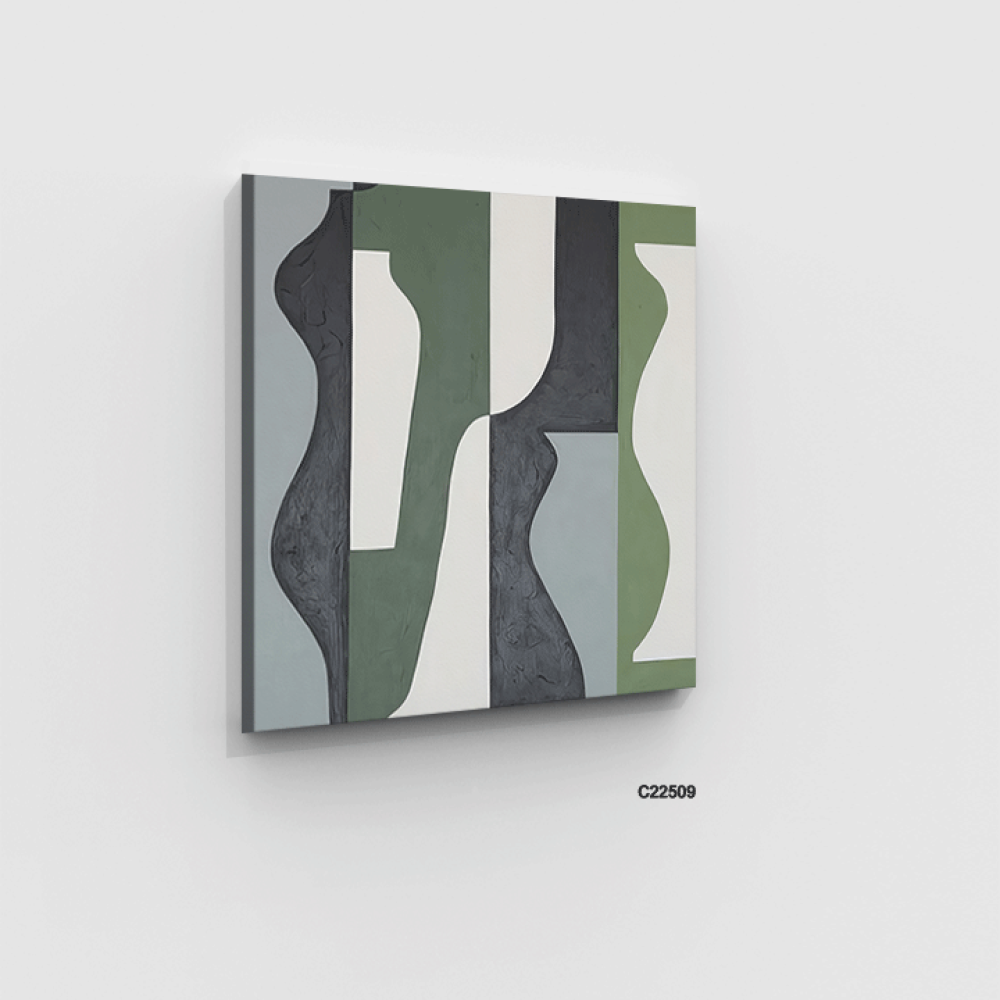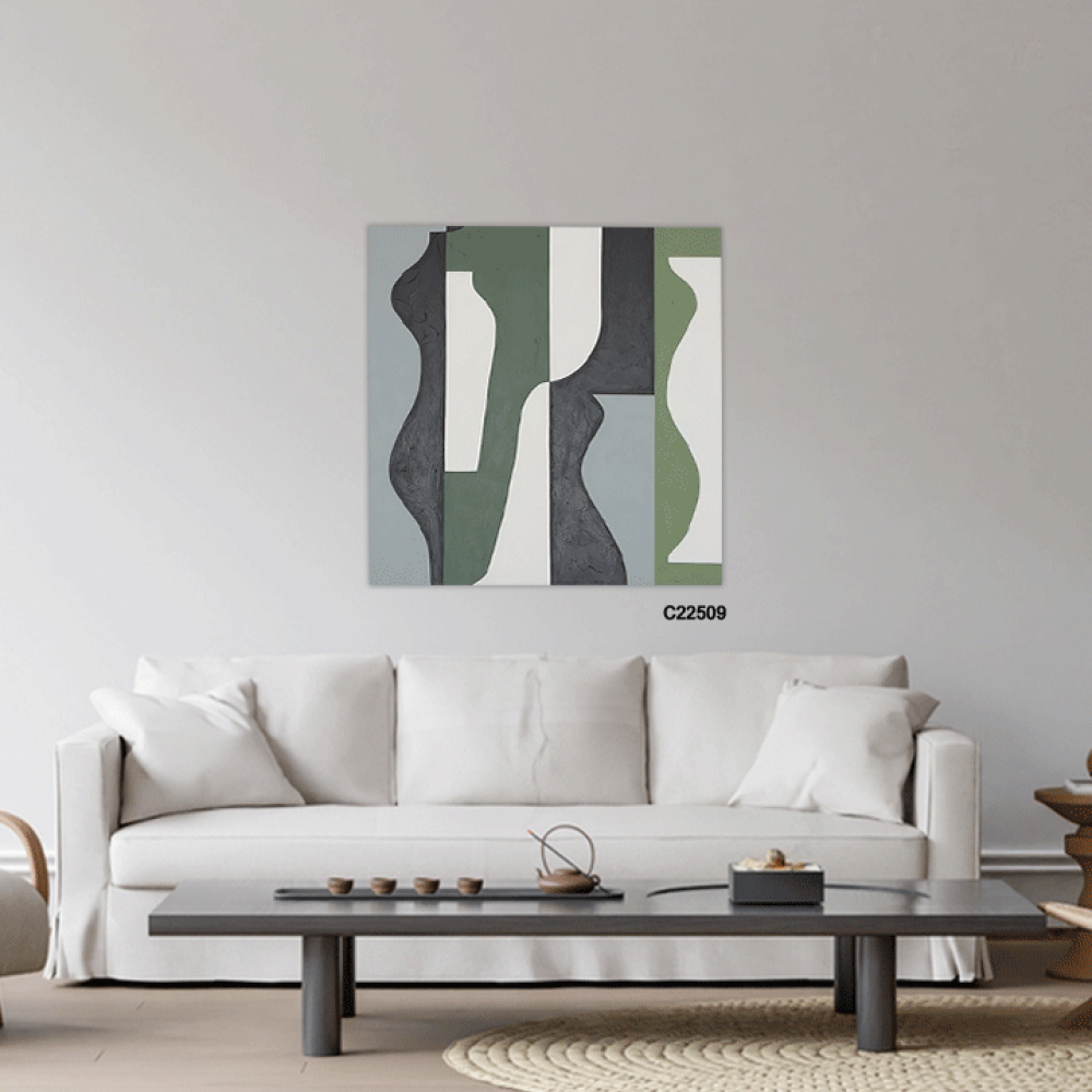 لوحة جدارية فنية تشكيلية تدرجات الازرق والاخضر والرمادي تعتمد على الأسلوب التشكيلية، حيث تتداخل الألوان وتندمج بانسيابية، مما يخلق تأثيرات بصرية جذابة ، يضفي اللون الازرق على اللوحة شعوراً بالهدوء والسكينة وتندمج تدرجات الاخضر لتضفي طاقة وحيوية حيث تتناغم الألوان معاً لتشكل مشهداً يبعث على الراحة والتأمل ، تتنوع الانماط بين الأشكال الهندسية البسيطة والخطوط الحرة التي تتماوج بشكل طبيعي، مما يخلق توازناً بين الهيكل والفوضى المنظمة. هذه اللوحة اضافة مثالية للمجالس وغرف المعيشة