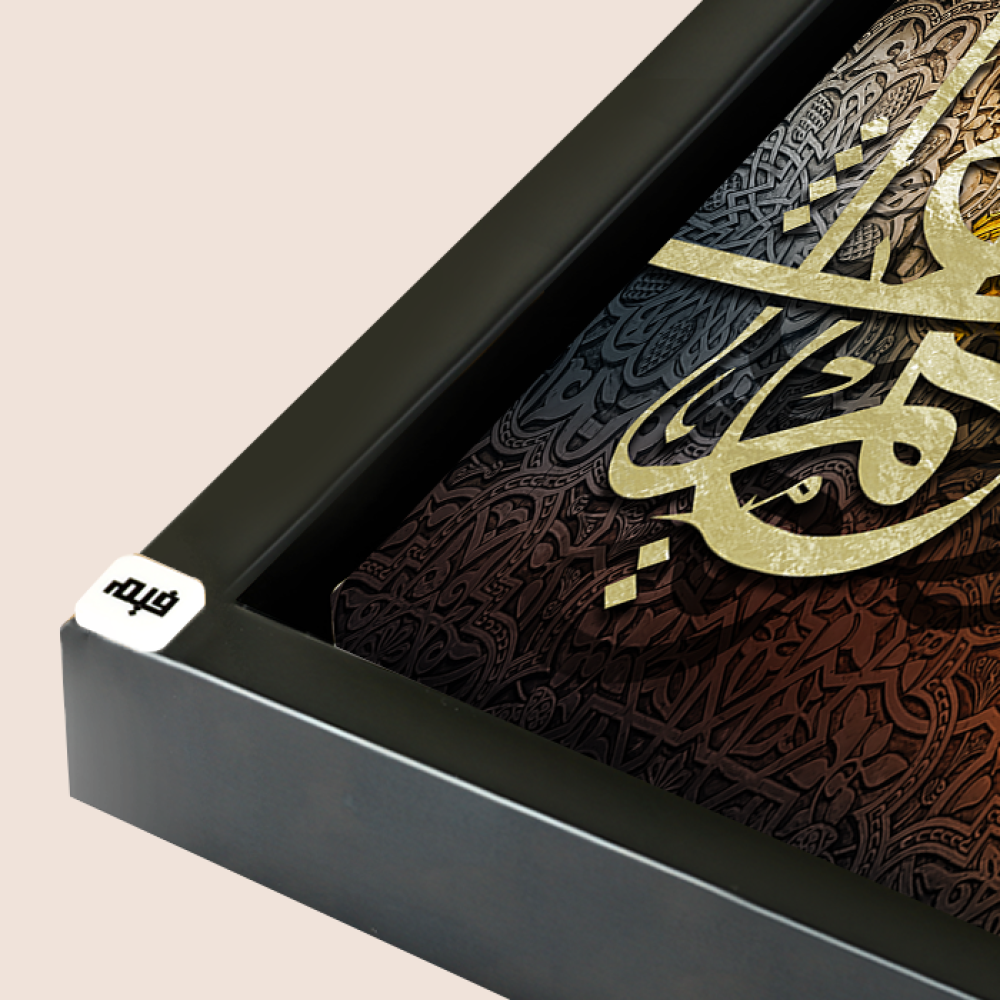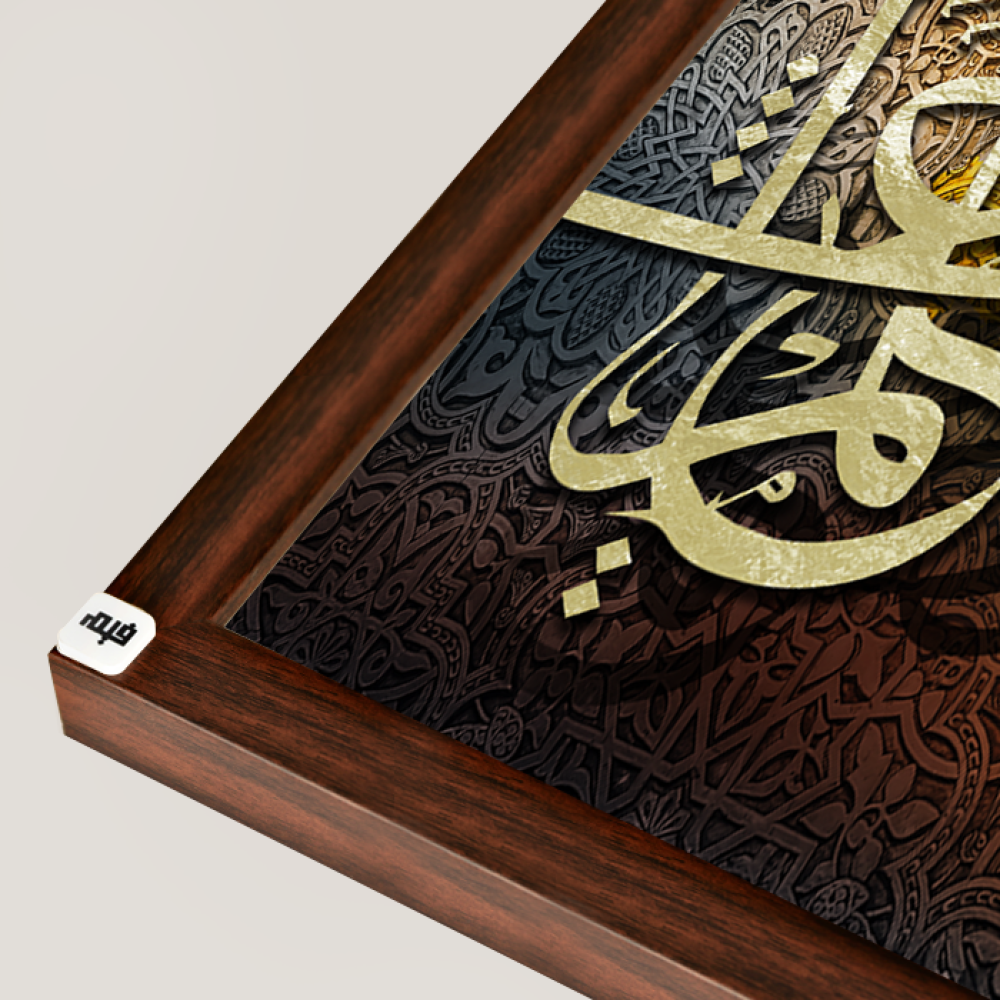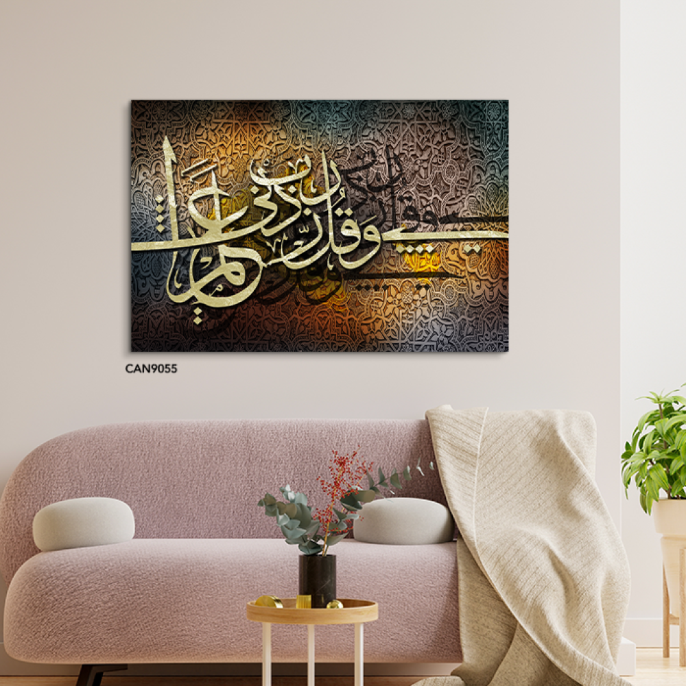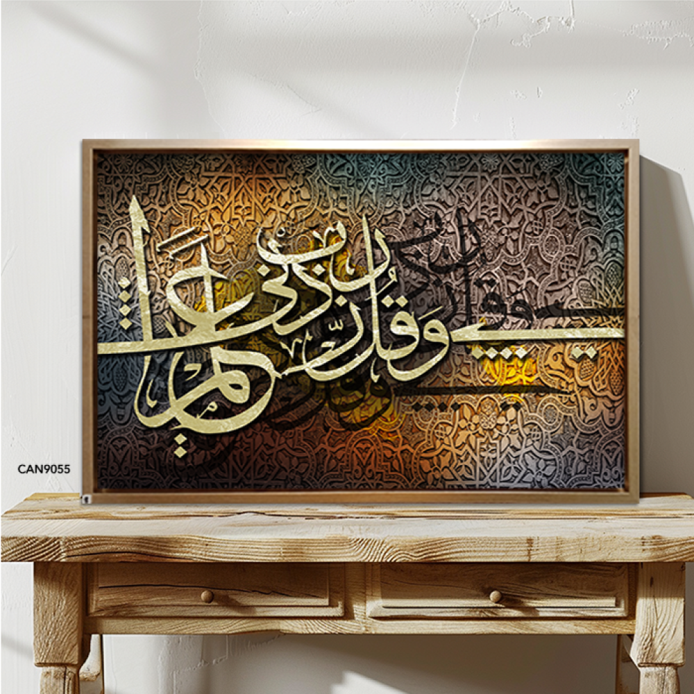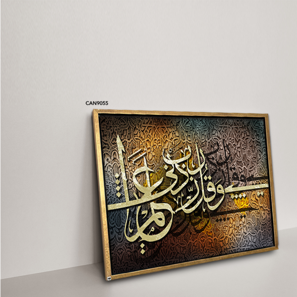 لوحة جدارية كانفس ، آية قرأنية ( وقل ربي زدني علما ) - درجات البني والذهبي مع الأخضر والأصفر - خط عربي ونقوش