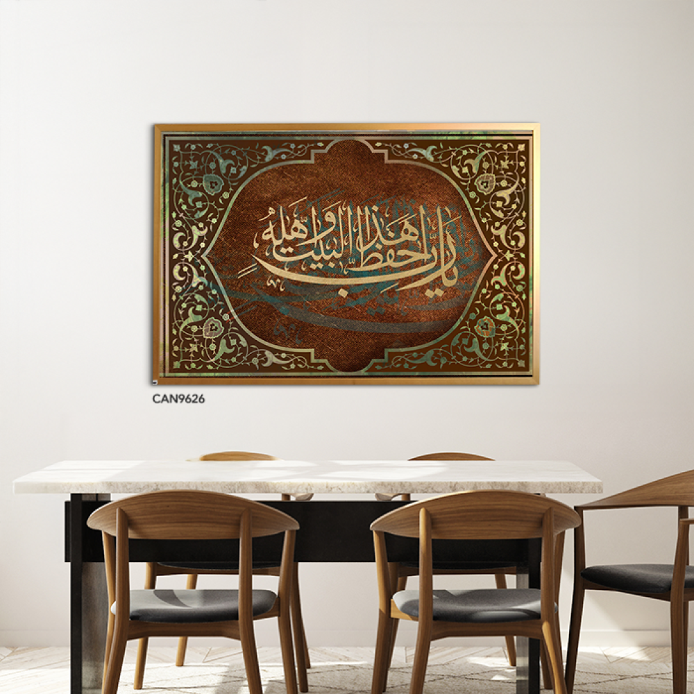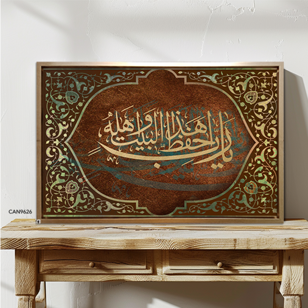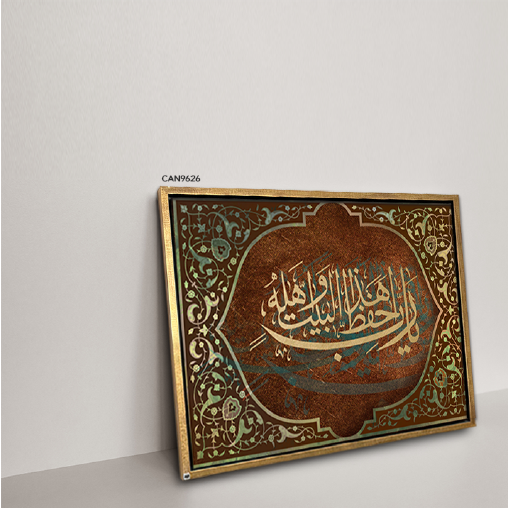 لوحة جدارية كانفس ، دعاء ( يارب احفظ هذا البيت وأهله ) - درجات الذهبي والبني مع البيج