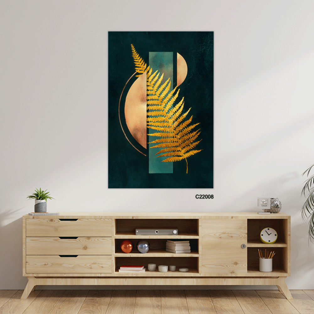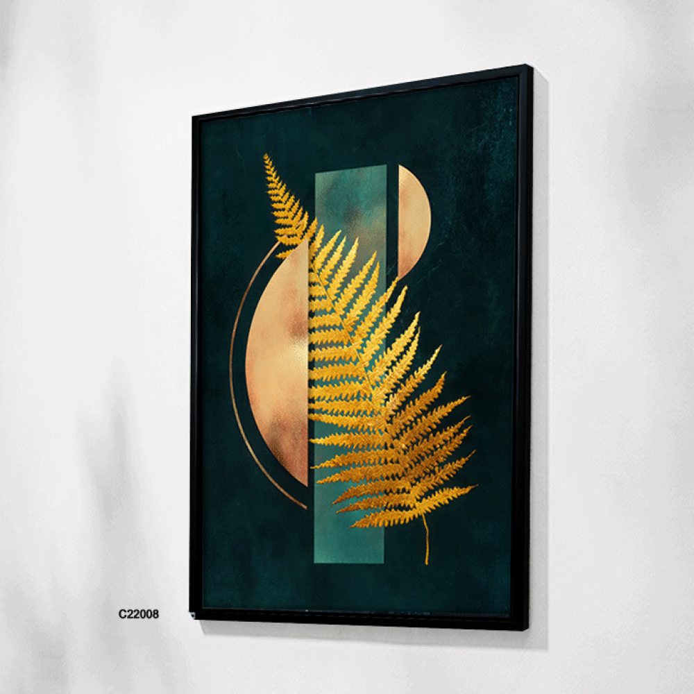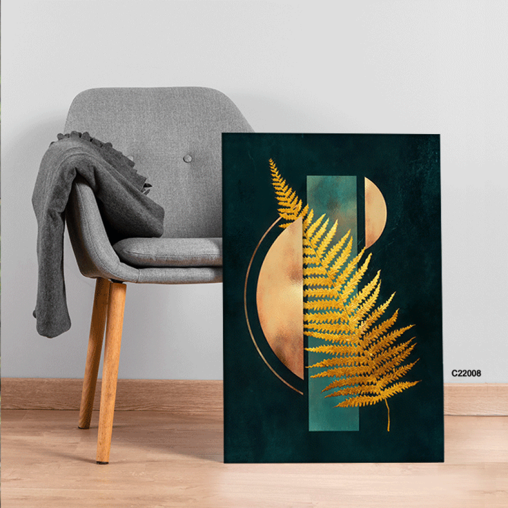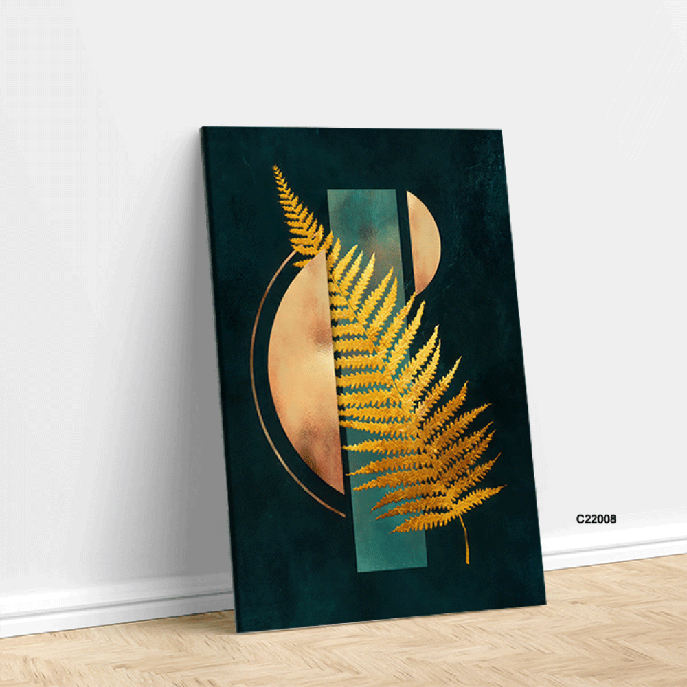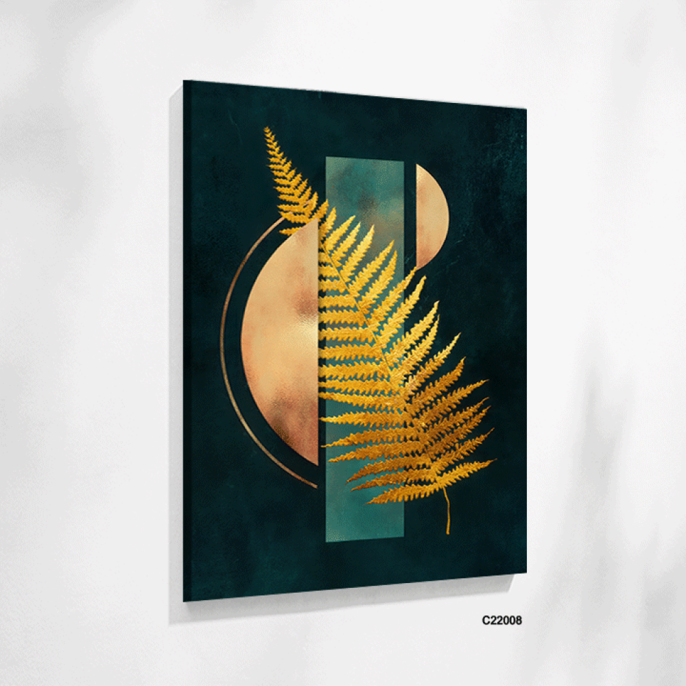 لوحة جدارية كانفس ، ريش وأشكال - تدرجات الذهبي والأخضر مع الأسود والبيج