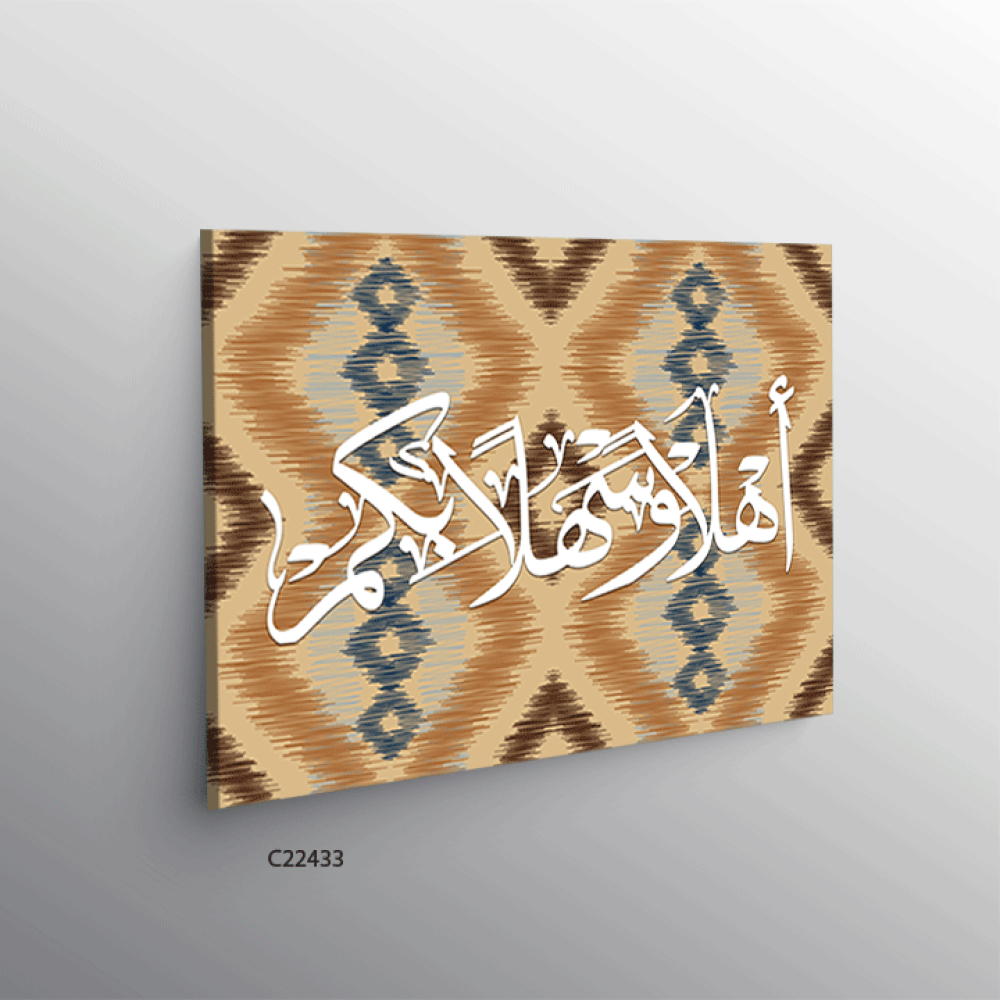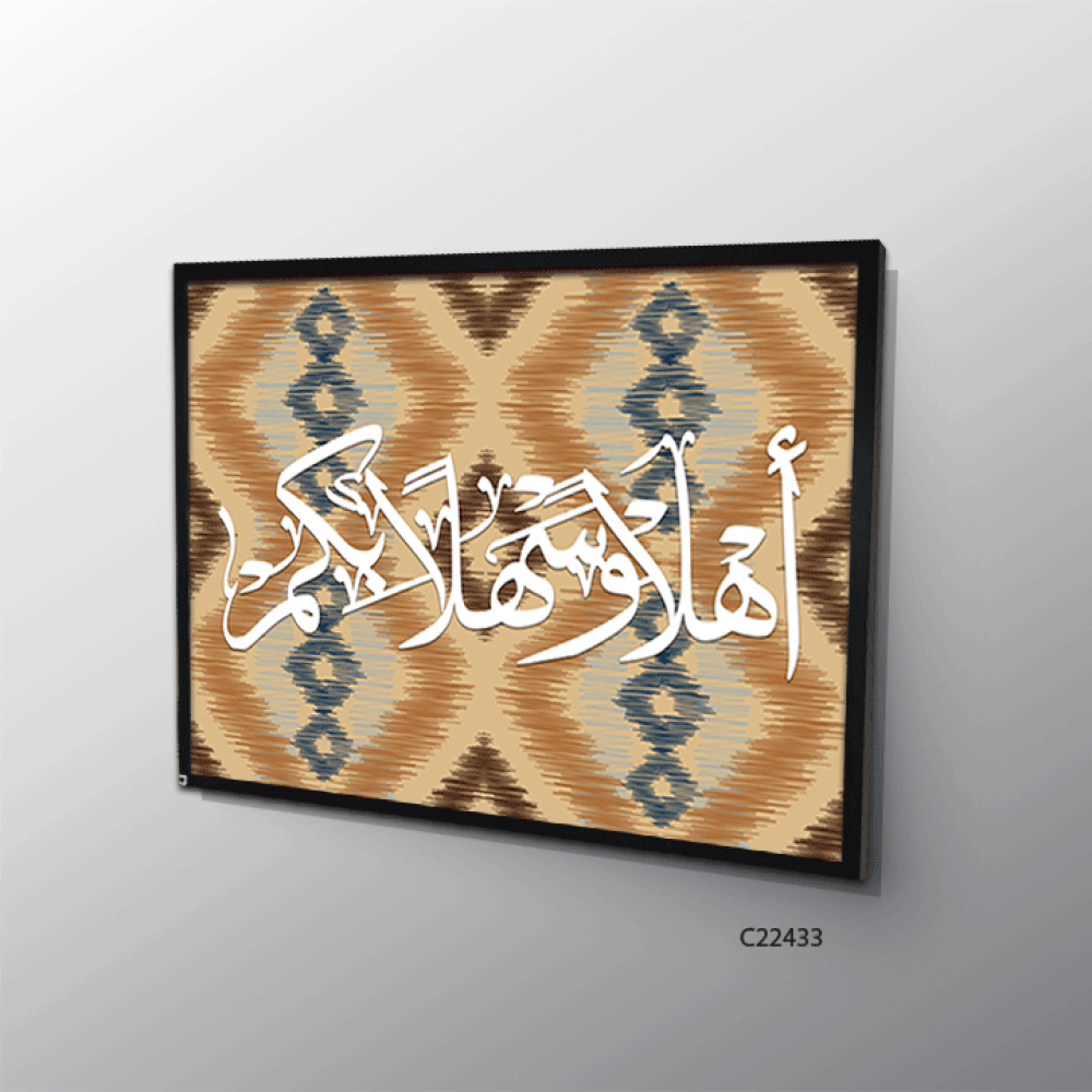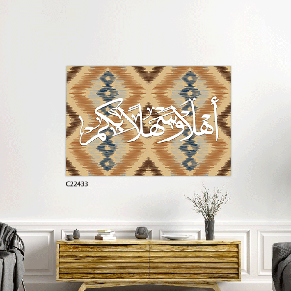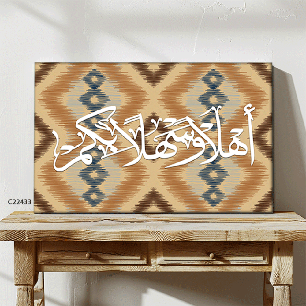 لوحة جدارية كانفس (اهلا وسهلا بكم ) نقوش بيج وبني وكحلي