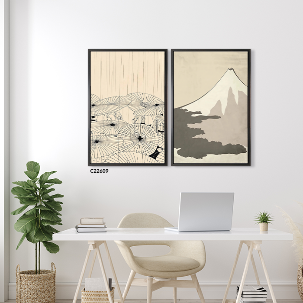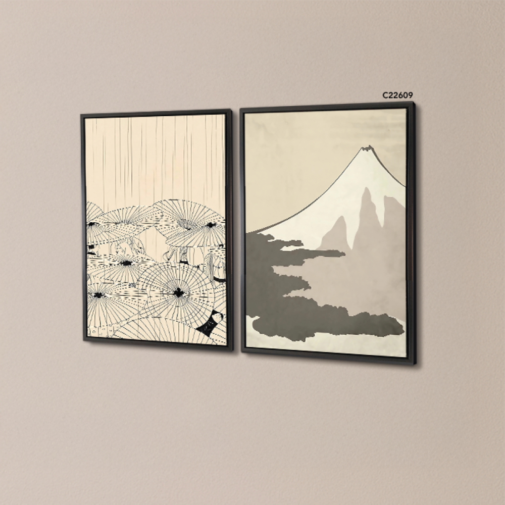 لوحة جدارية كانفس تجسد جبل الفوجي ومظلات تقليدية ورقية يابانيه بتدرجات البيج والبني