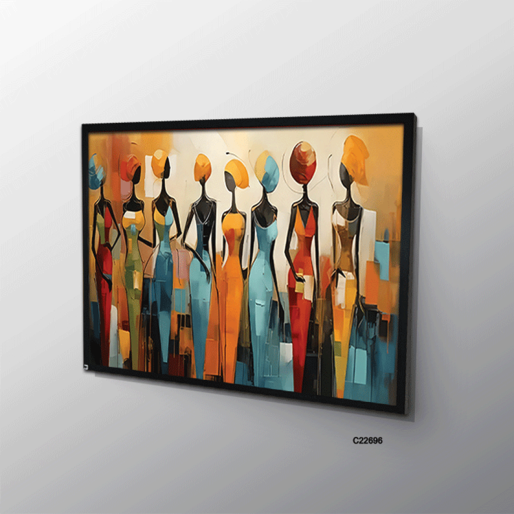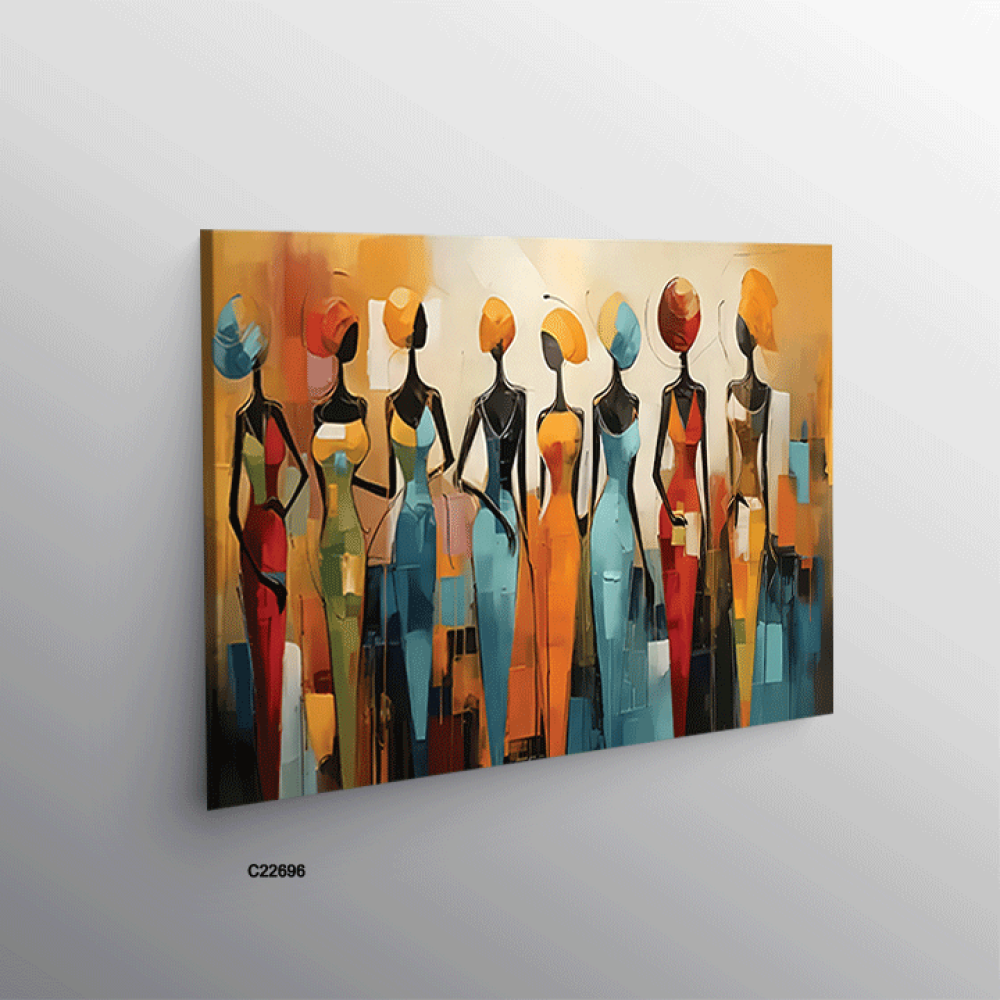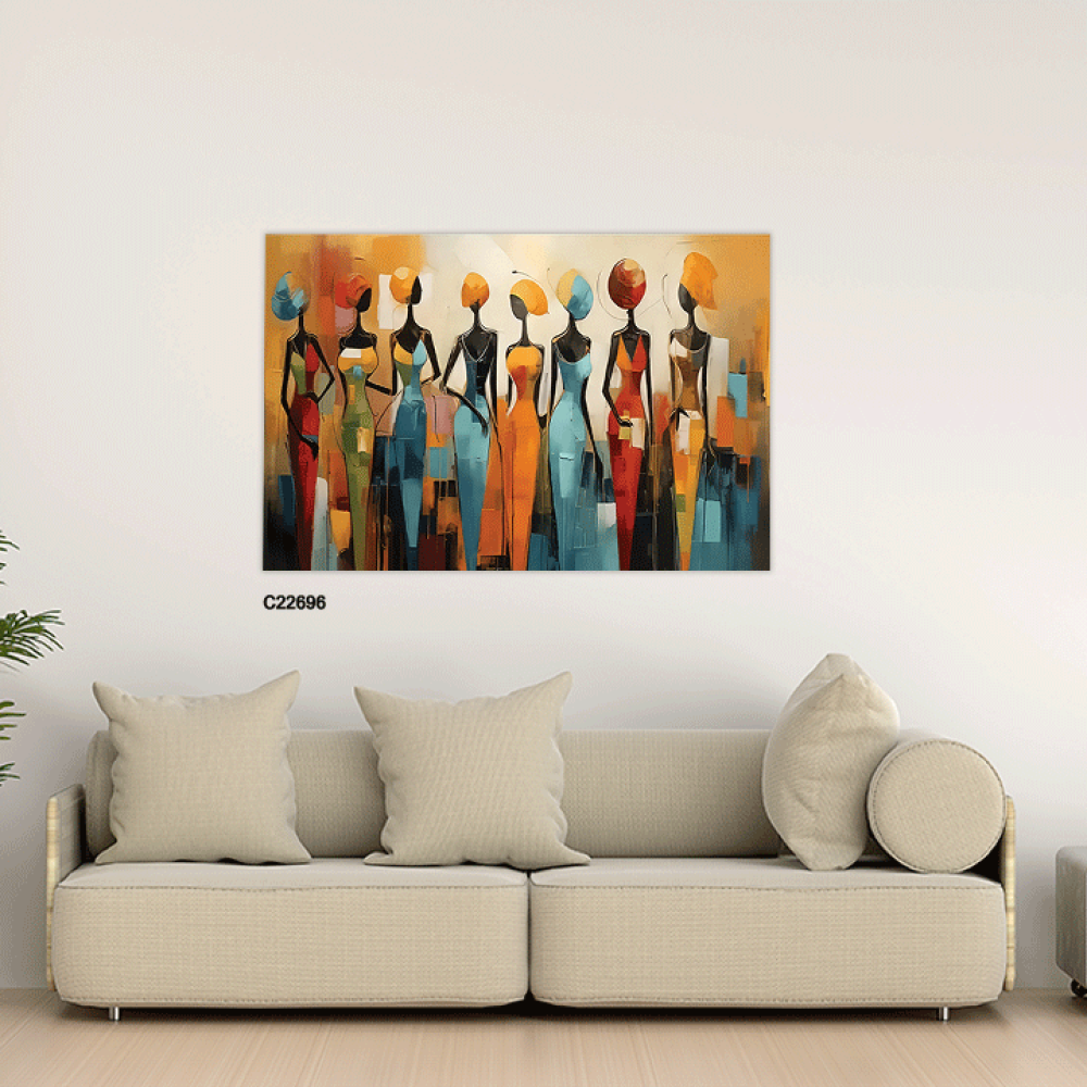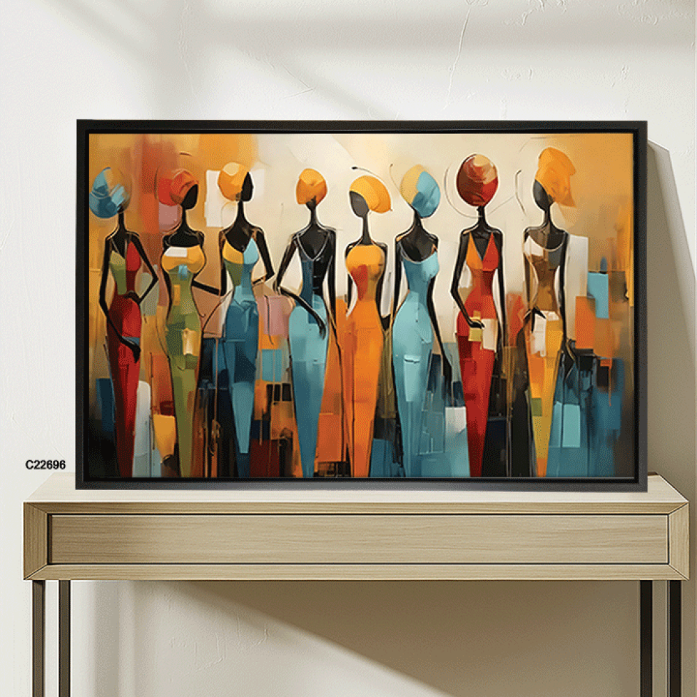 لوحة جدارية أنيقة تُصوّر سيدات أفريقيات يرتدين ملابس تقليدية غنية بالألوان يغطي رؤوسهن أقمشة ملتفة بعناية تتناسق مع ألوان أثوابهن، حيث تتدرج بين الأصف...