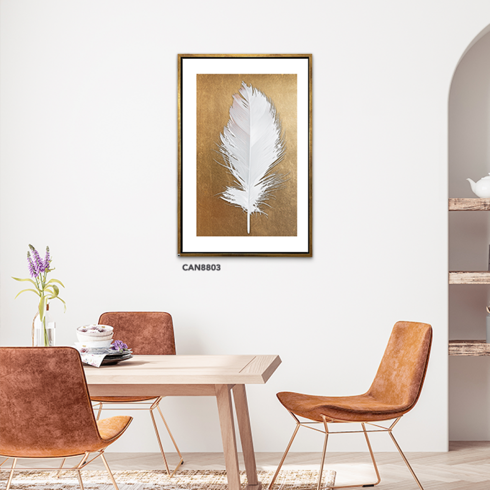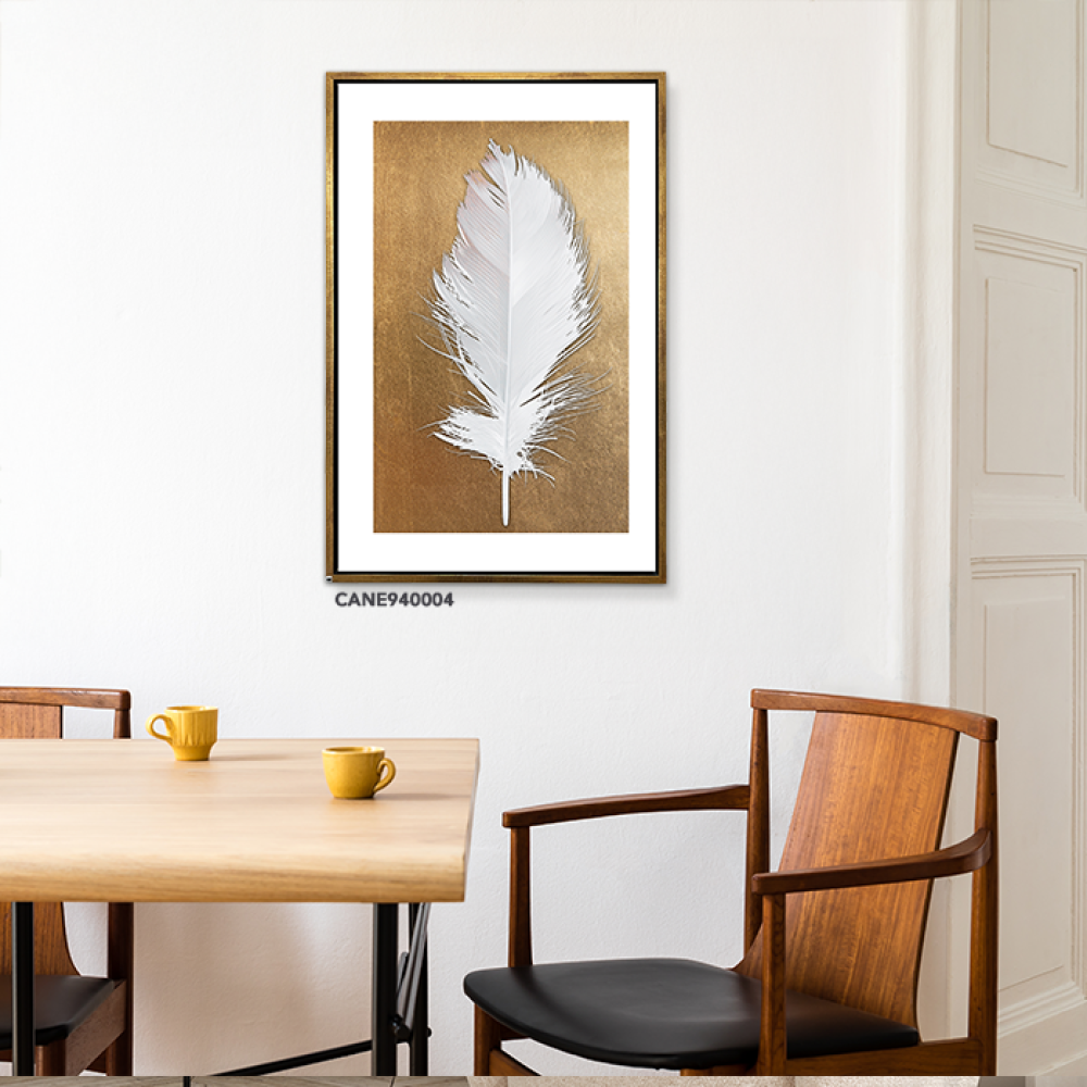 تأتي هذه اللوحة بتصميم يصور ريشة رقيقة باللون الأبيض على خلفية بتدرجات الذهبي بما يضفي الجمال والفخامة على أي مكان تٌضع فيه. ستكون إضافة مثالية إلى غرف النوم وغرف المعيشة.