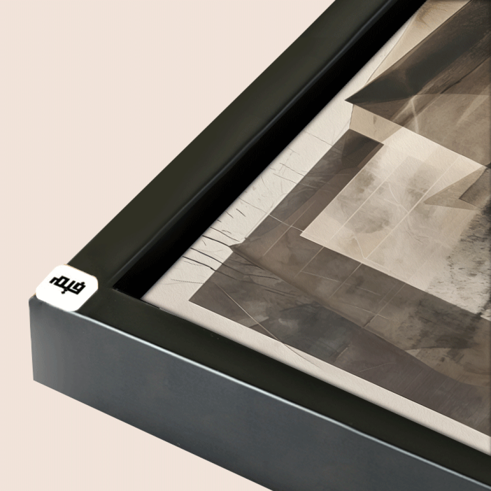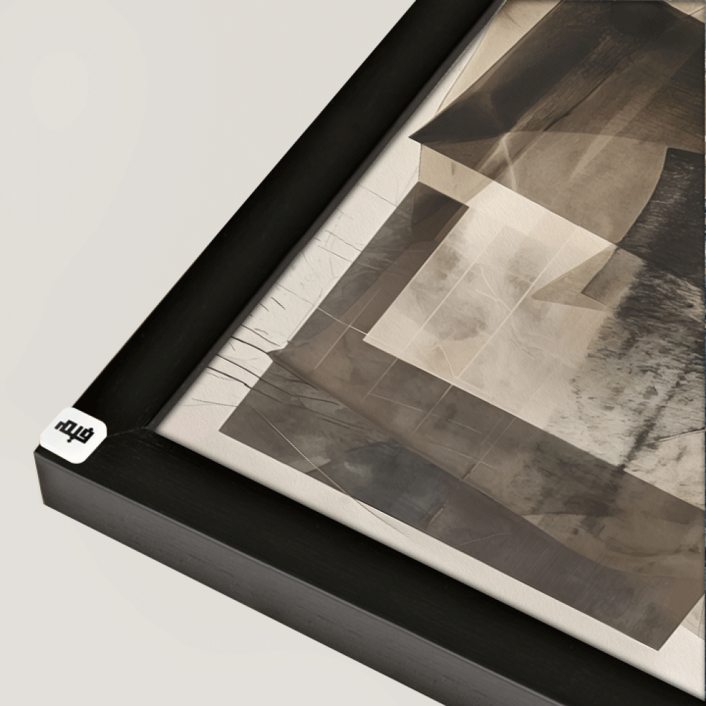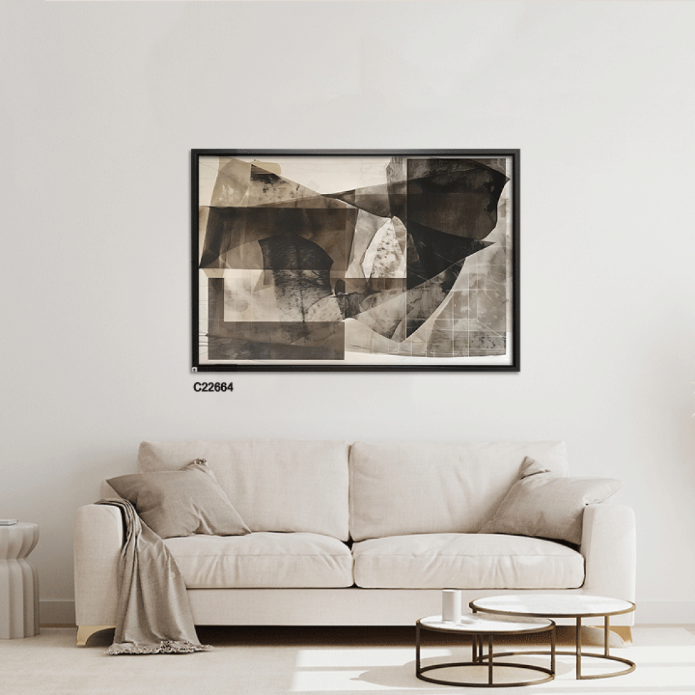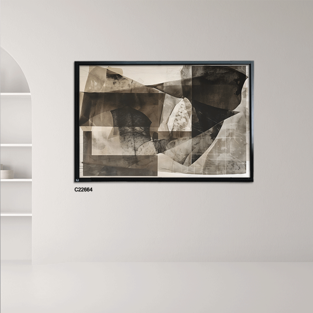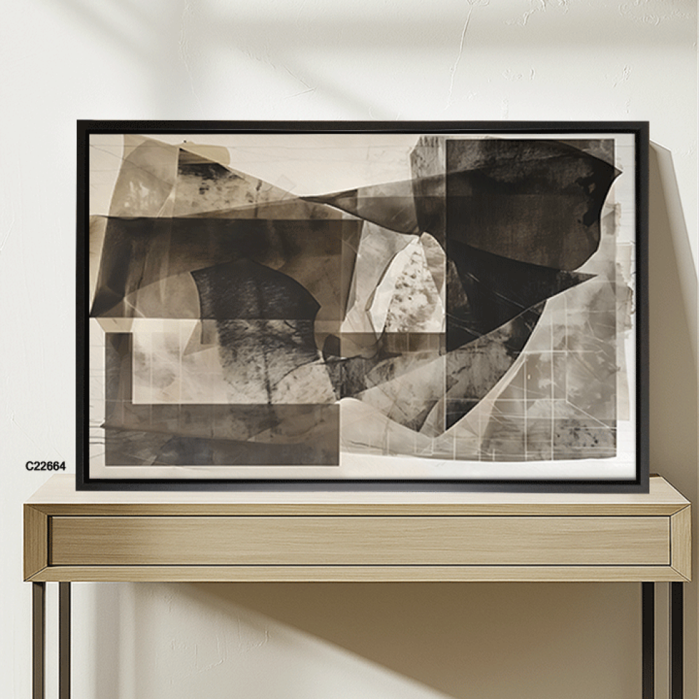 لوحة جدارية تجريدية بتدرجات الأسود والرمادي، تتميز بتداخل الأشكال الهندسية والخطوط الشفافة التي تتقاطع مع مناطق معتمة، مما يخلق إحساسًا بالحركة والعمق. تمتزج العناصر المتراكبة بانسيابية، بينما تضيف الخلفية الفاتحة تباينًا يُبرز التكوينات الداكنة. الطابع الحديث والتوازن بين الضوء والظل يجعل هذه اللوحة مثالية للمساحات العصرية التي تبحث عن لمسة فنية أنيقة ومتوازنة.