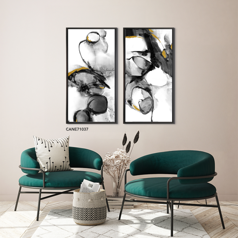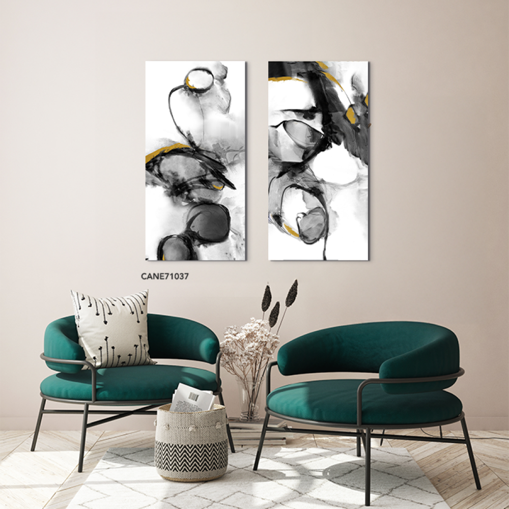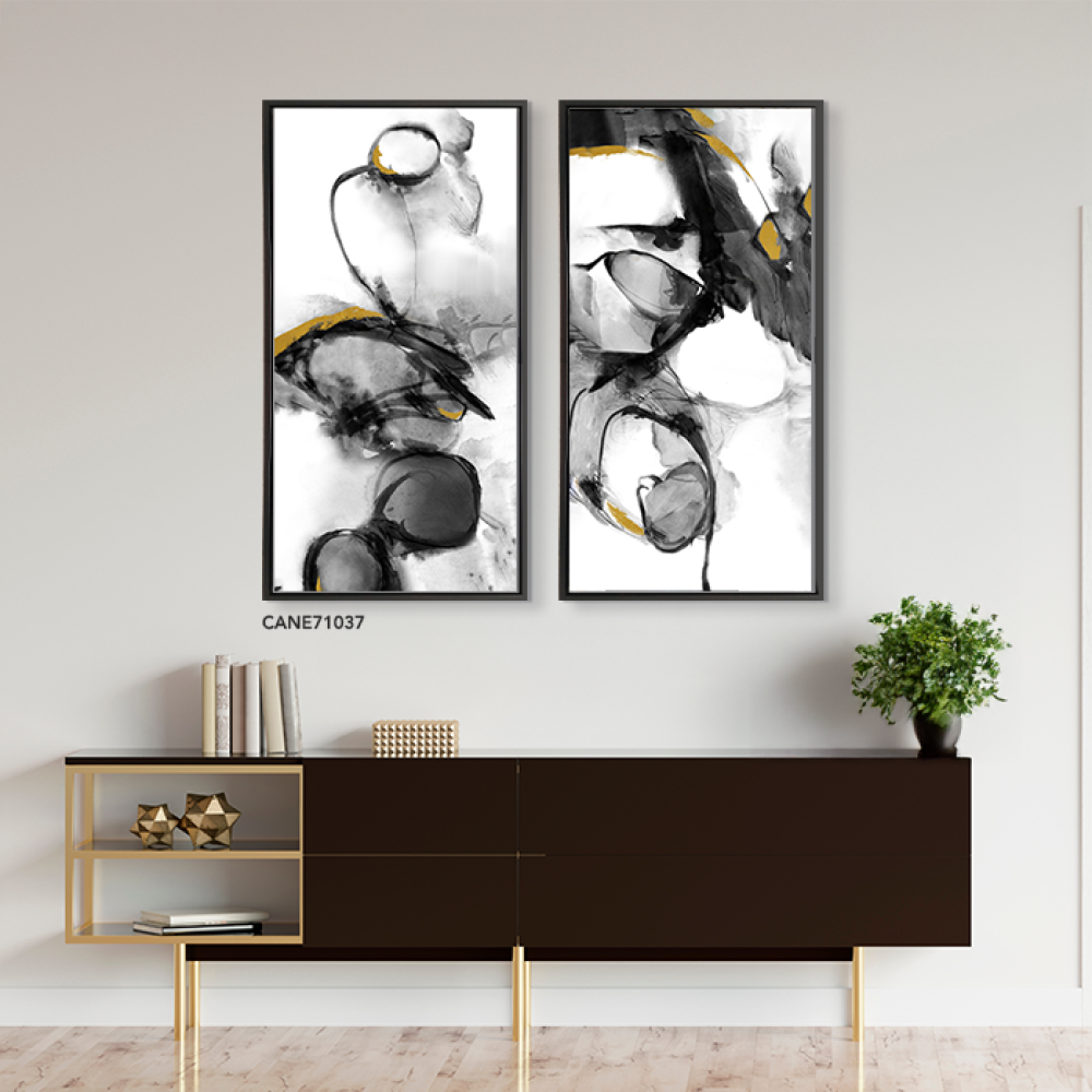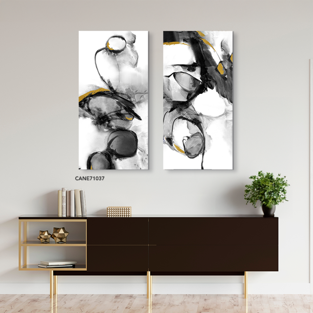 لوحة جدارية كانفس مقسمة ، أشكال دخانية - تدرجات الذهبي والأسود مع الابيض - فن تجريدي