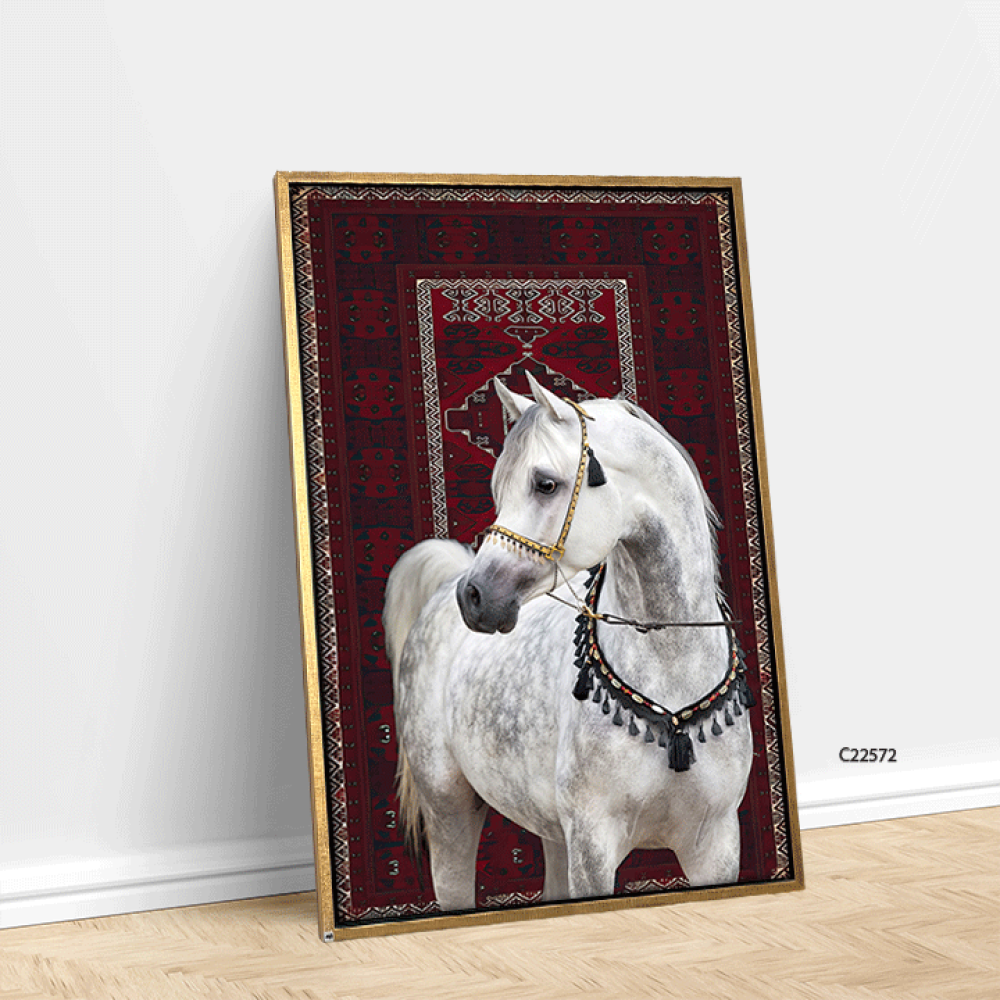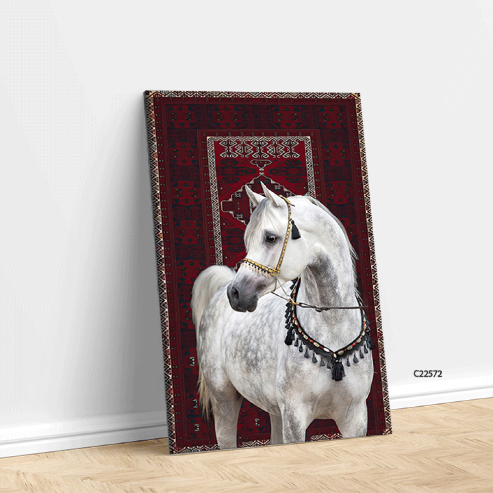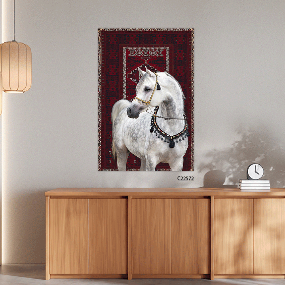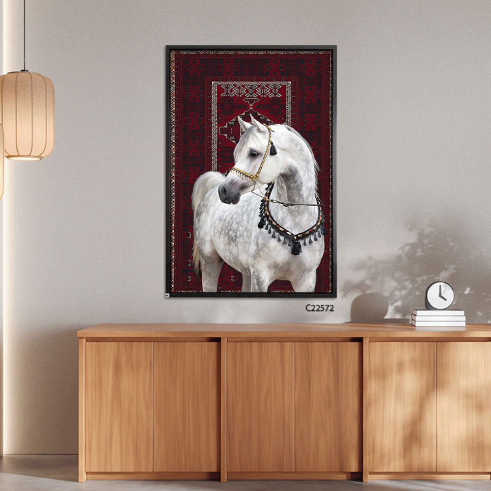 امنح مساحتك لمسة من الفخامة مع لوحة خيل عربي ابيض، حيث يجسد الحصان العربي الأصيل قوته ورشاقته بملامح استثنائية، مرتديًا لجامًا مزخرفًا بتدرجات الأحمر ...