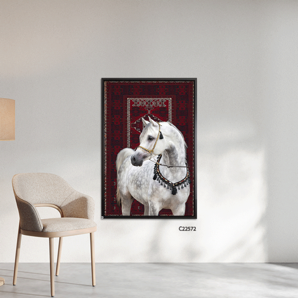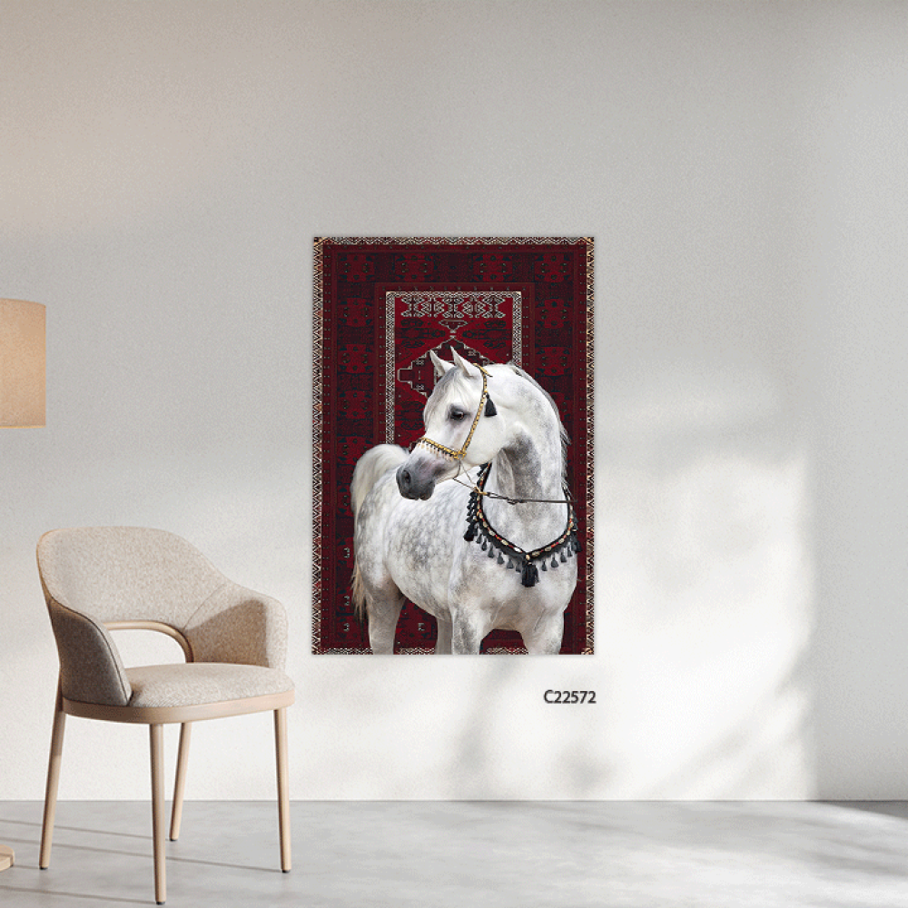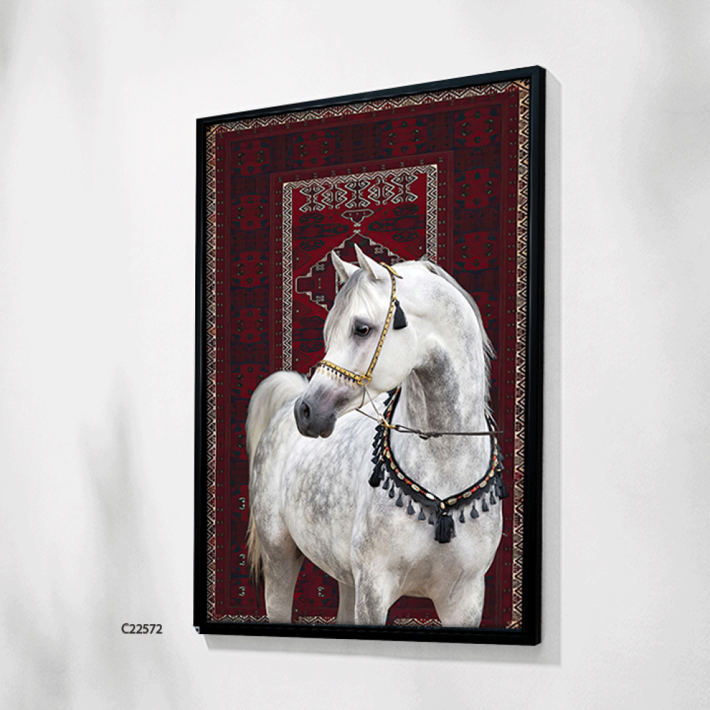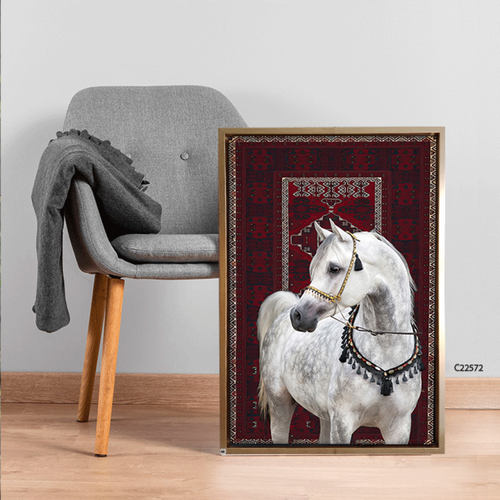 امنح مساحتك لمسة من الفخامة مع لوحة خيل عربي ابيض، حيث يجسد الحصان العربي الأصيل قوته ورشاقته بملامح استثنائية، مرتديًا لجامًا مزخرفًا بتدرجات الأحمر ...