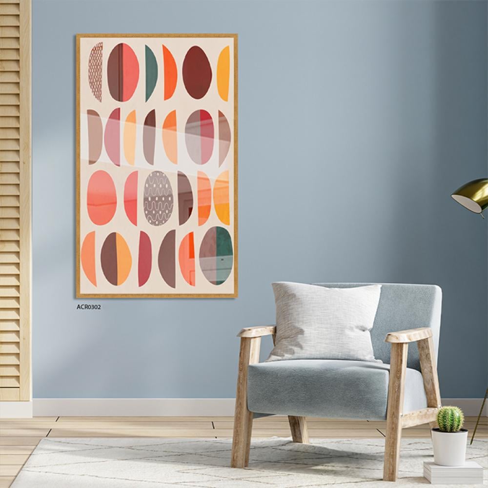 لوحة فنية جدارية اكريليك تتميز بتصميم يضم أنصاف دوائر، وتدرجات اللون البرتقالي والأخضر والبني مع الأصفر. تفاصيل التصميم تجمع بين الألوان بشكل جميل ومت...