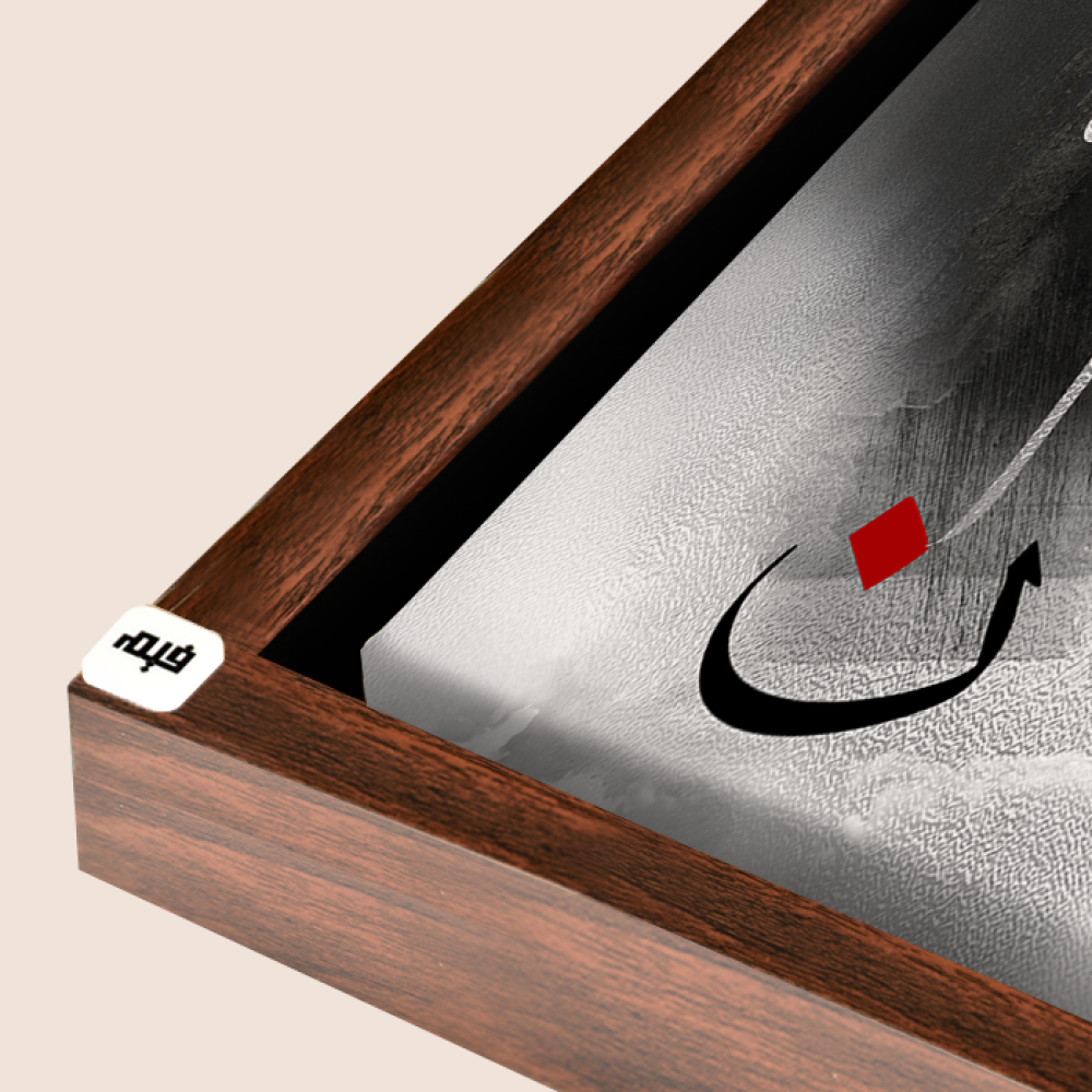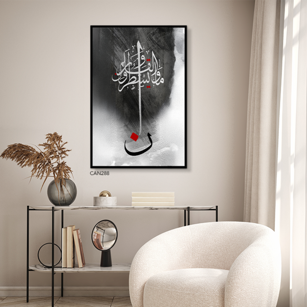 لوحة فنية جدارية كانفس ،آية قرآنية (ن والقلم ومايسطرون) - درجات الأسود والرمادي مع الأبيض والأحمر