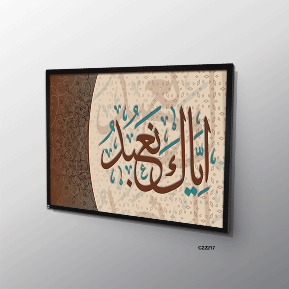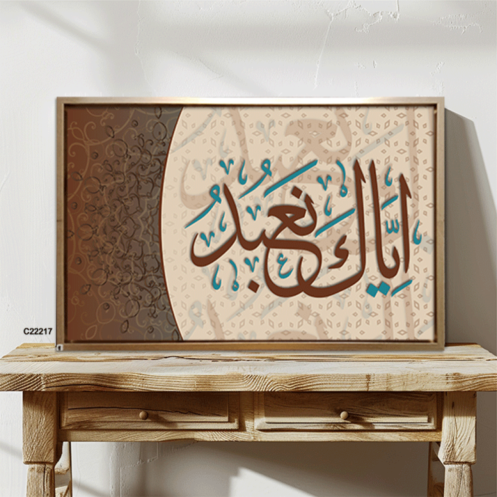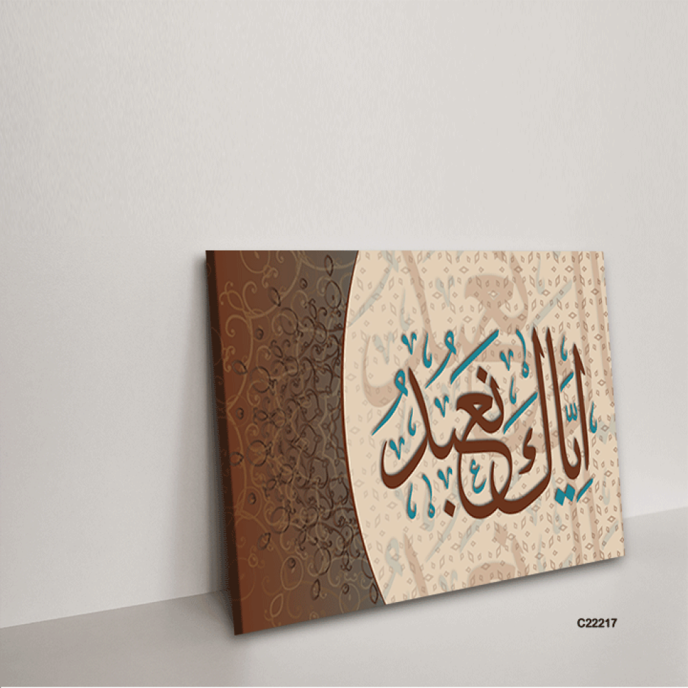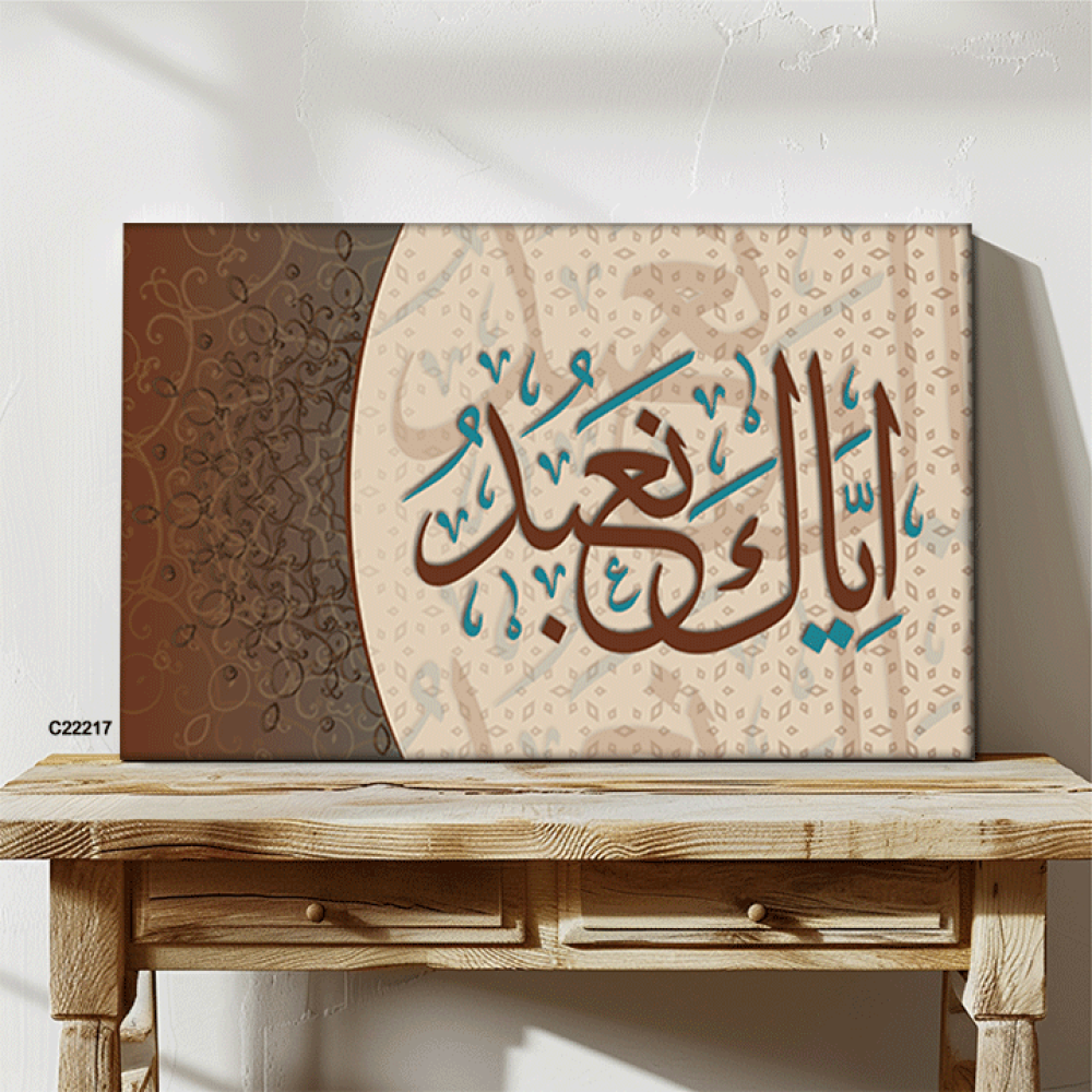لوحة فنية جدارية كانفس ، آيات قرانية ( اياك نعبد ) - درجات البني مع البيج والأخضر التيفاني