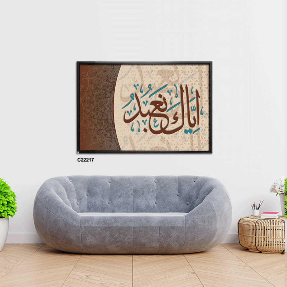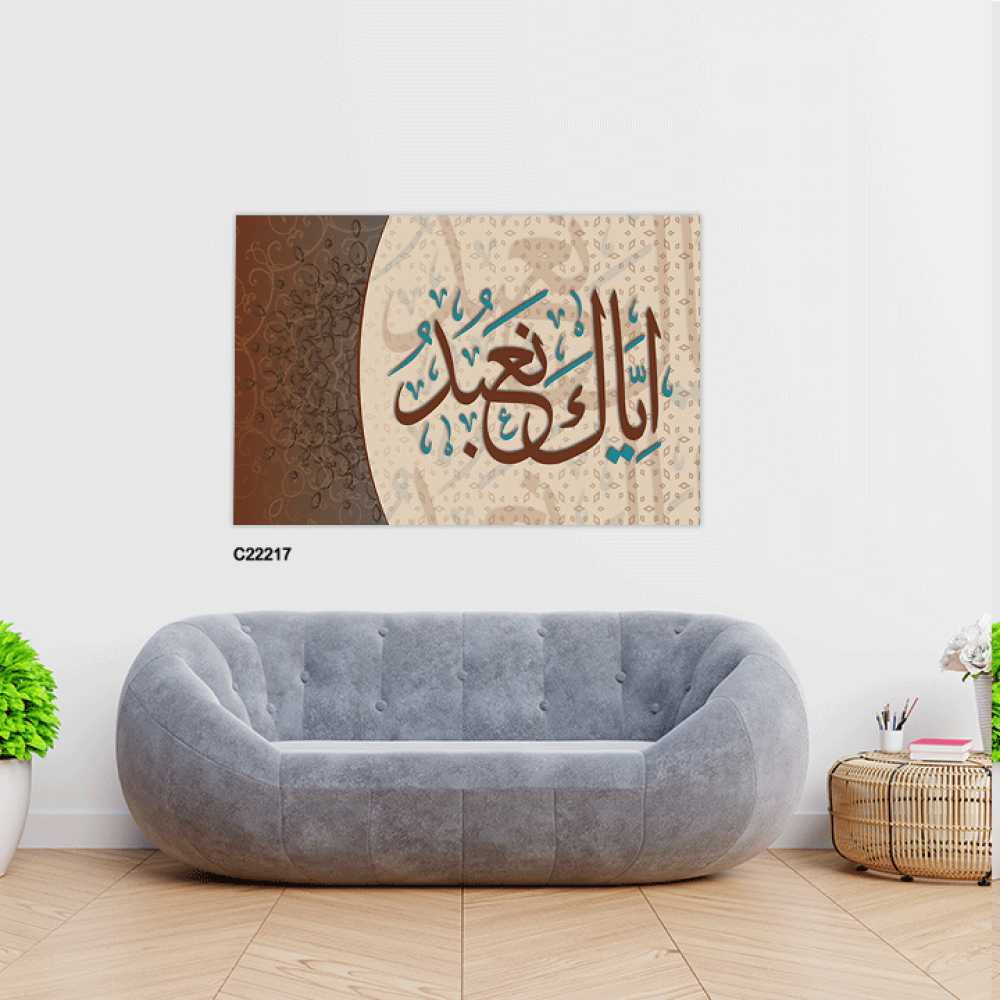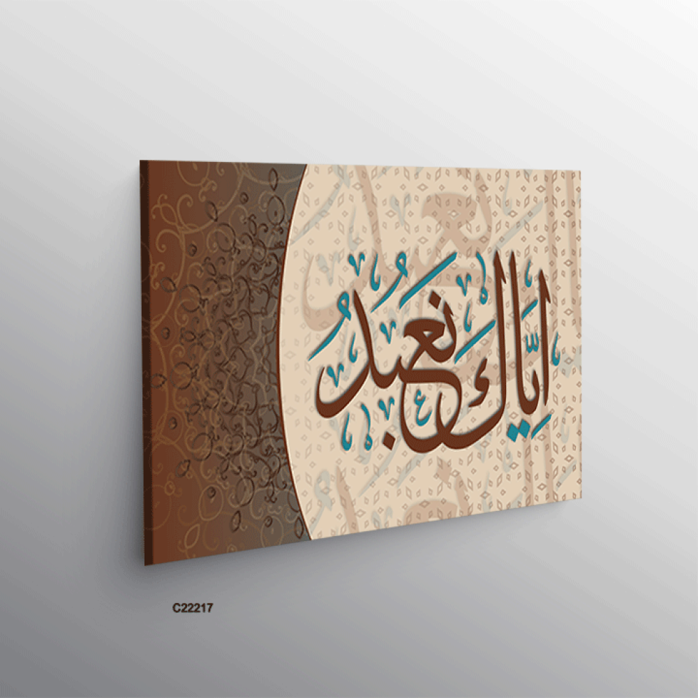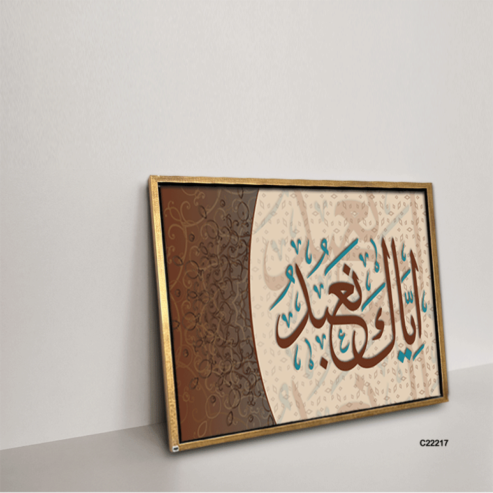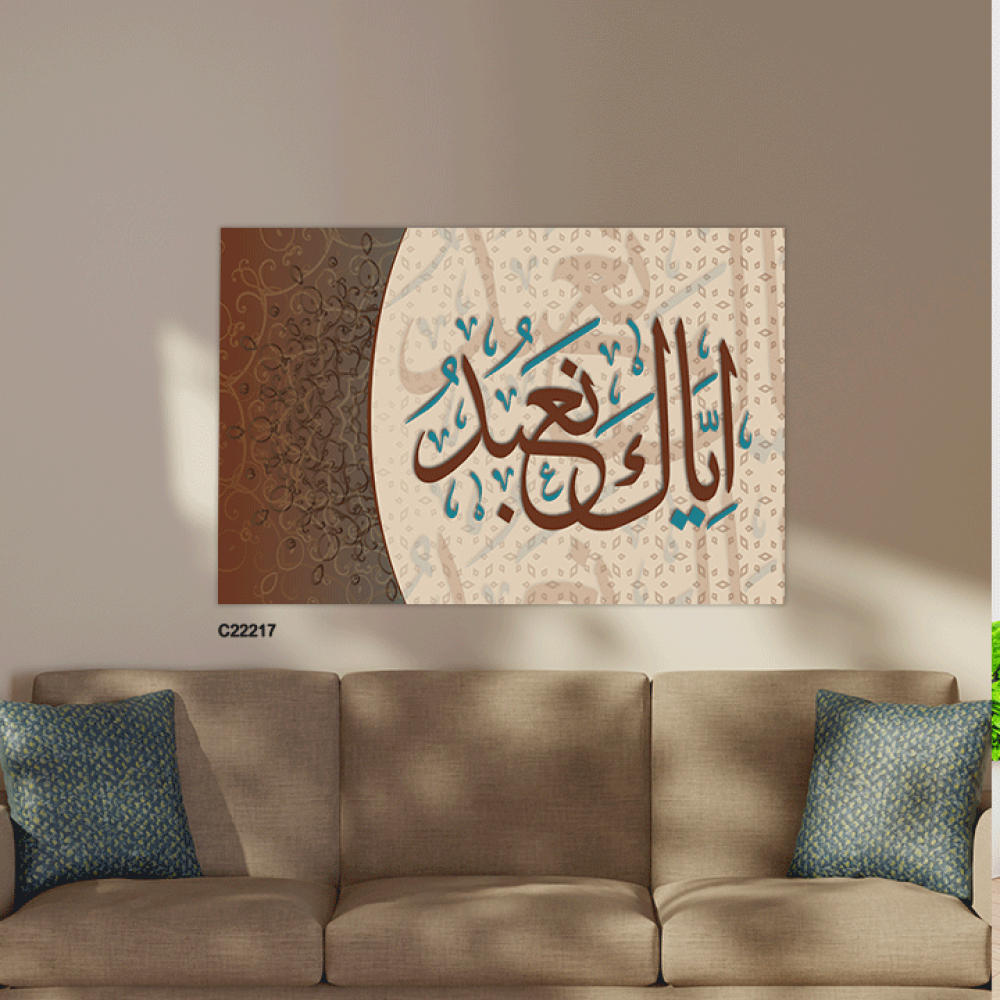 لوحة فنية جدارية كانفس ، آيات قرانية ( اياك نعبد ) - درجات البني مع البيج والأخضر التيفاني