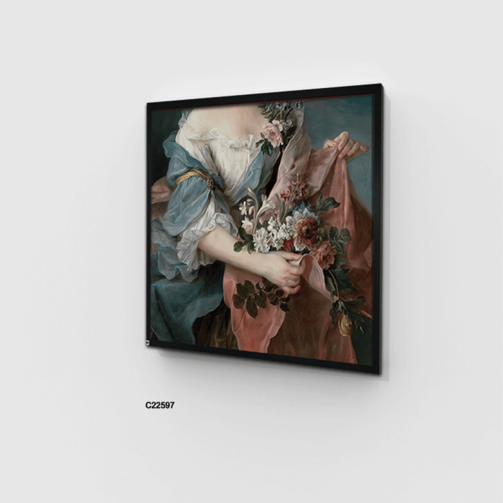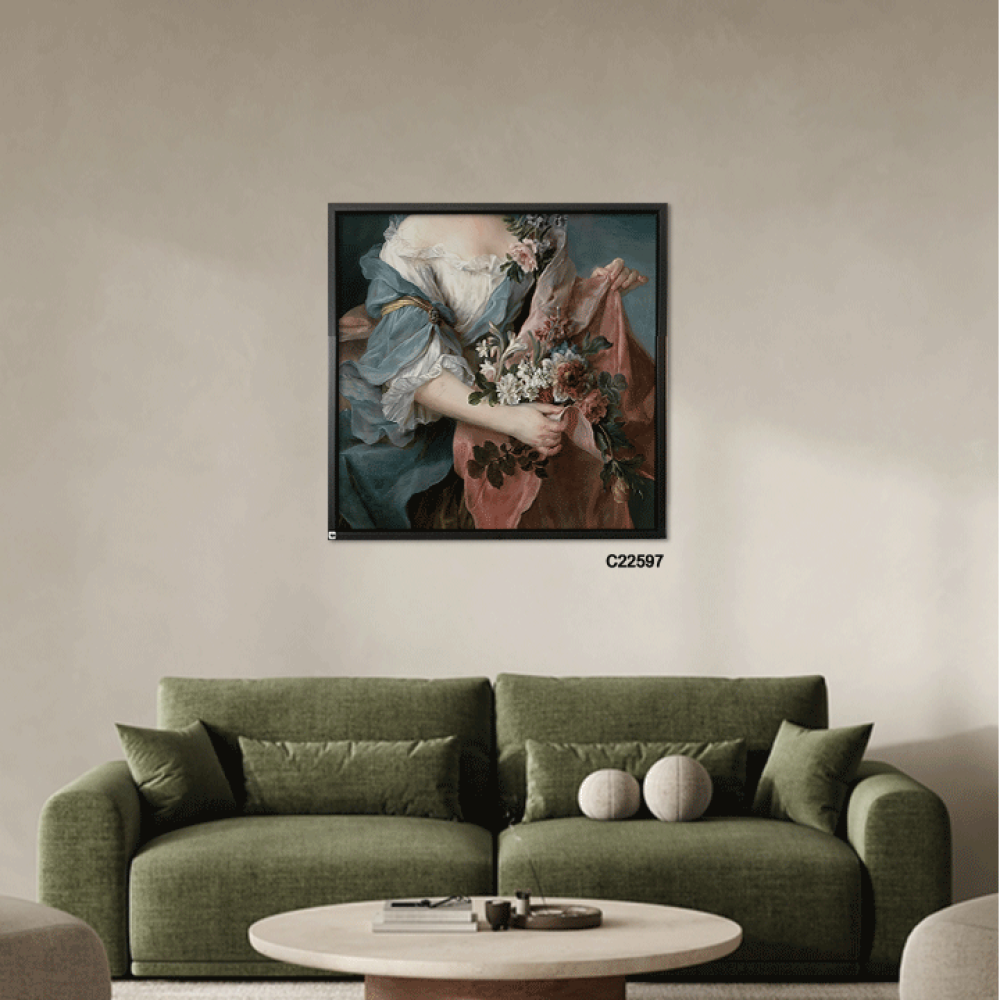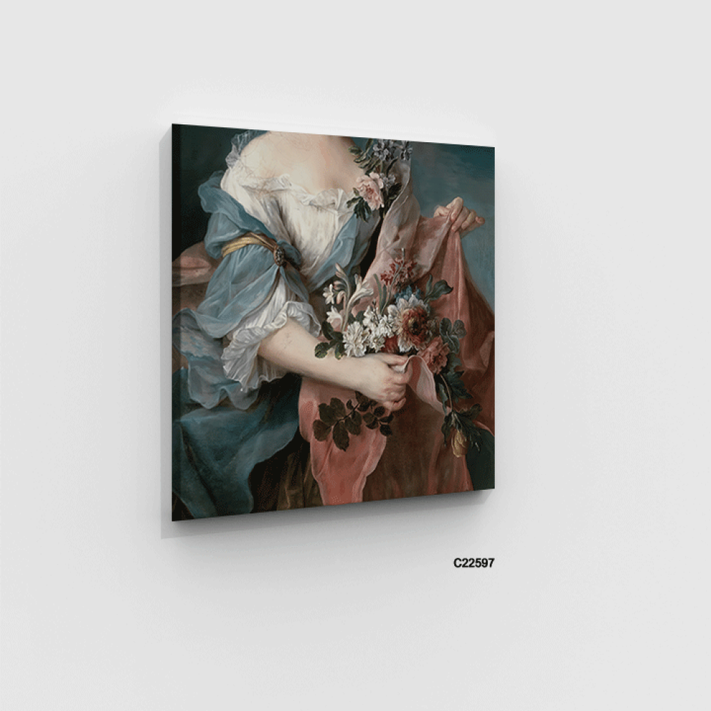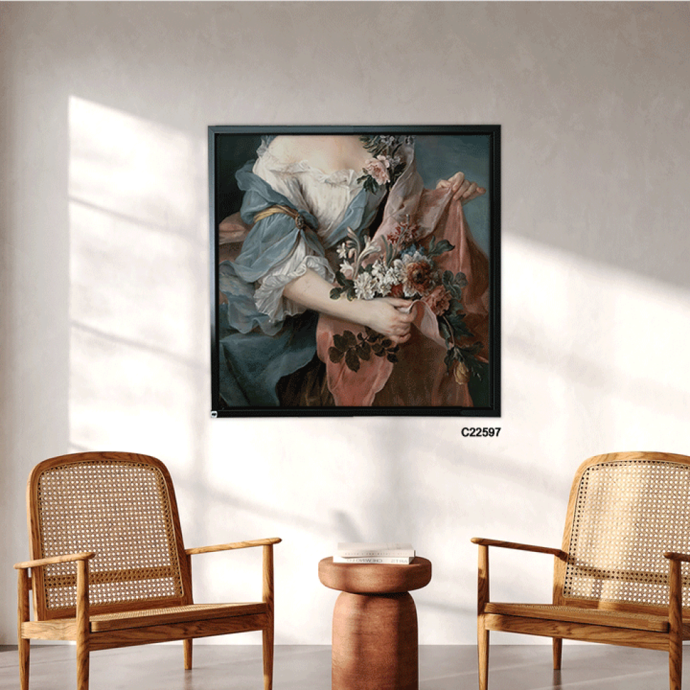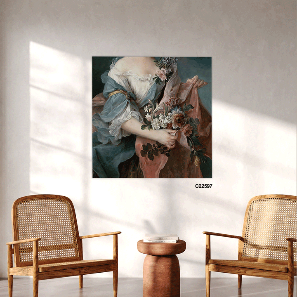 تُعرض اللوحة الجدارية على الكانفس تصميمًا فنيًا ساحرًا يجسد فتاة تحمل الأزهار والورود، بتدرجات أنيقة من الأزرق والبيج والوردي والأبيض والذهبي. هذا الع...