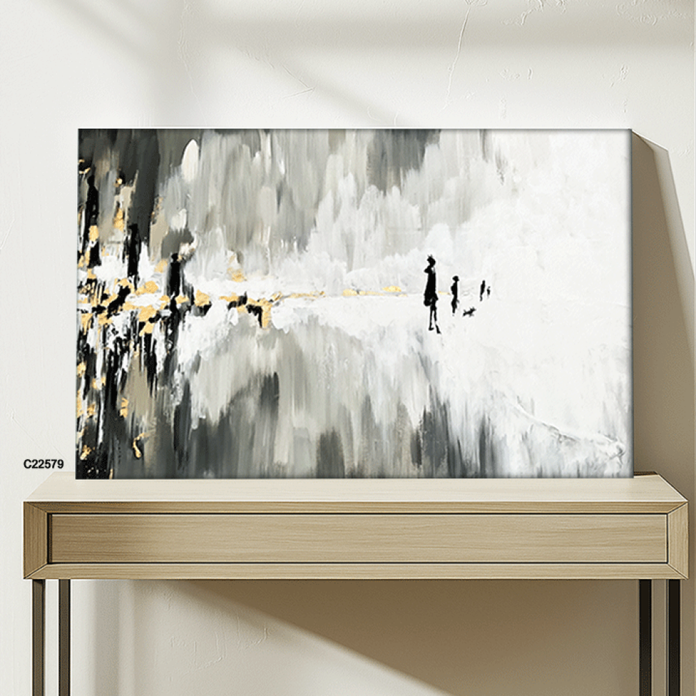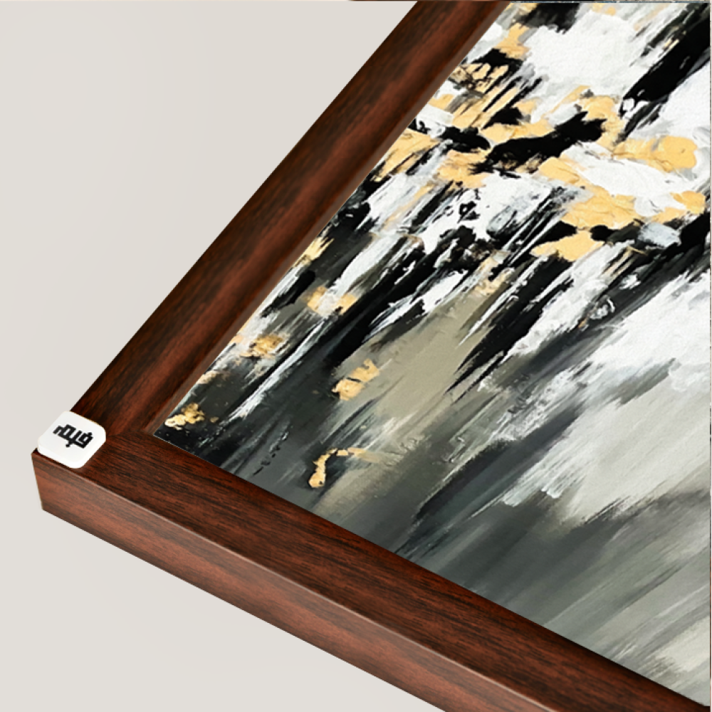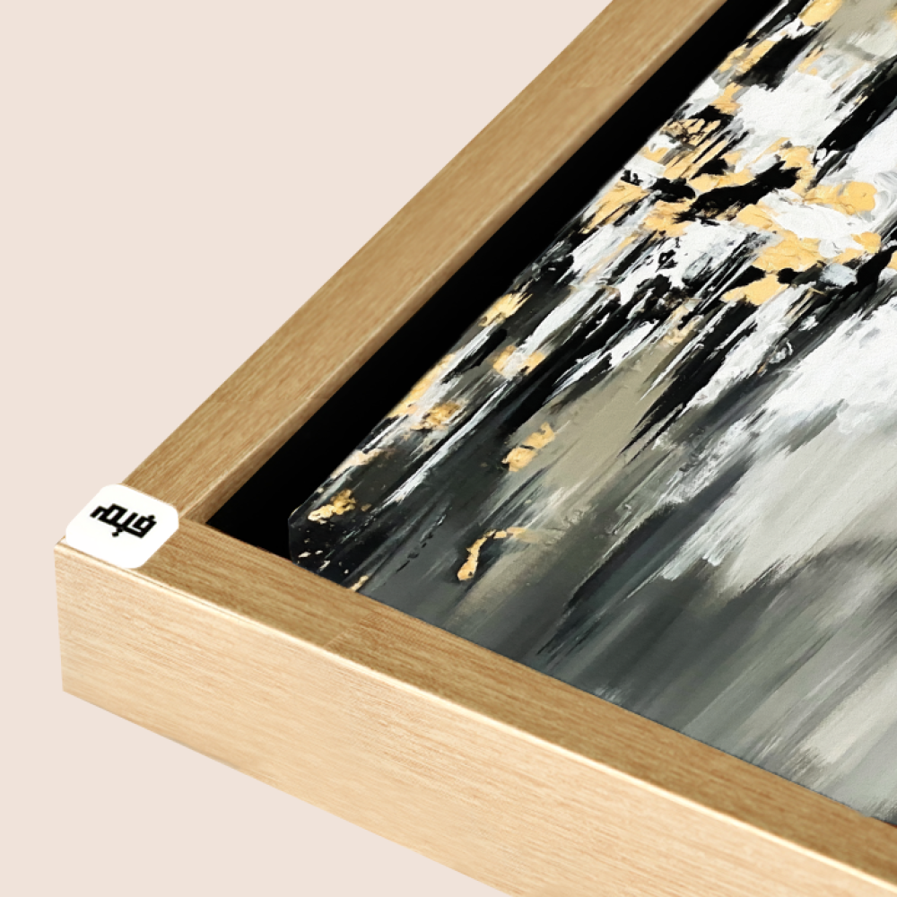 تُظهر اللوحة الجدارية على الكانفس تصميمًا فنيًا معاصرًا يجسد أشكالًا عشوائية متداخلة بتدرجات رائعة من الذهبي والأسود والأبيض والرمادي. يُضفي هذا المزي...