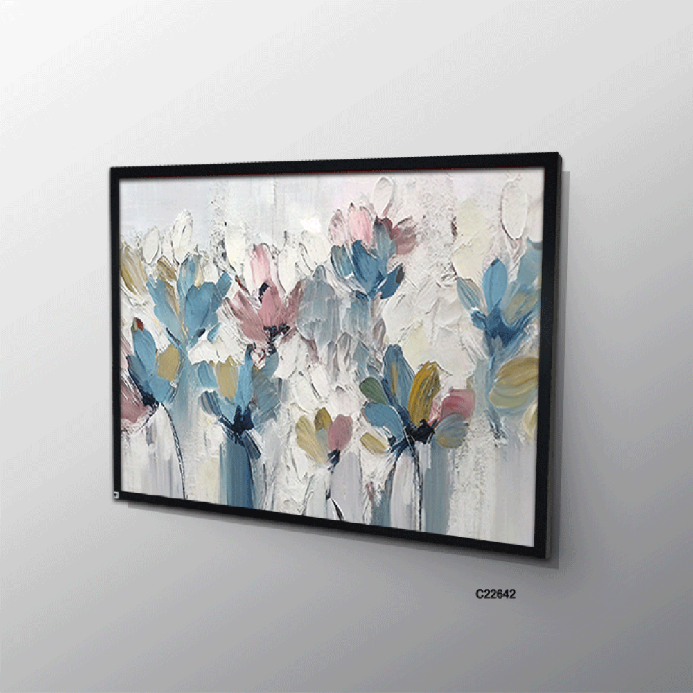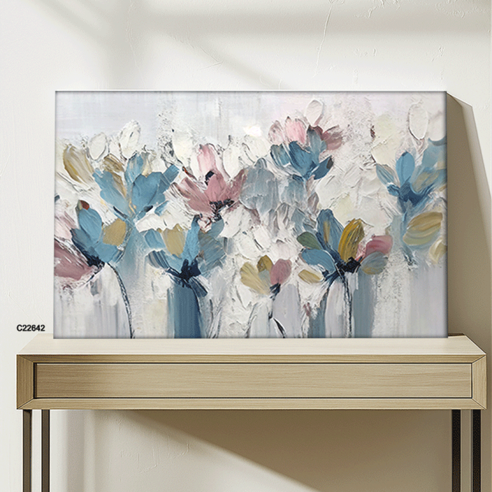 لوحة جدارية كانفس تصور ورودًا بأسلوب تجريدي باستخدام تدرجات من الأزرق، الوردي، والرمادي. الأزهار تتخذ أشكالًا غير محددة بدقة، مع لمسات ناعمة وضربات فر...