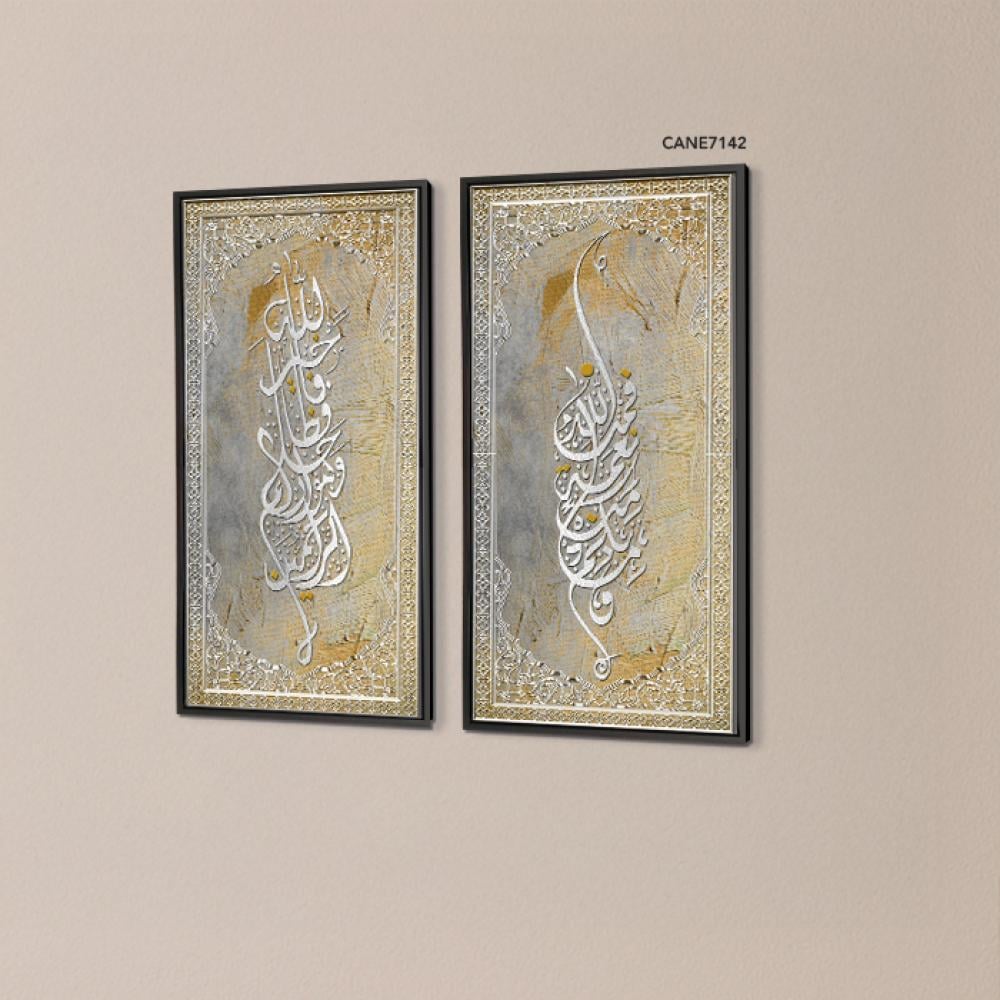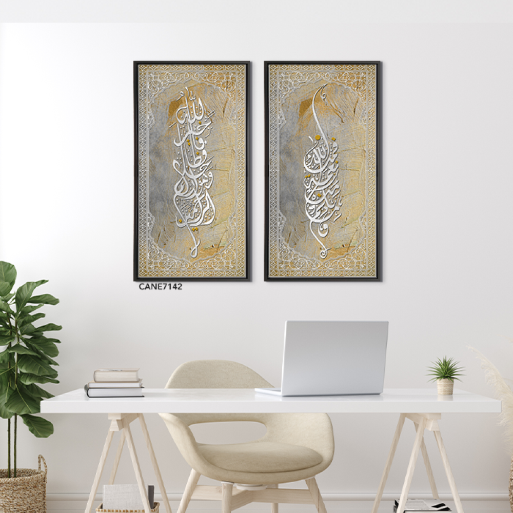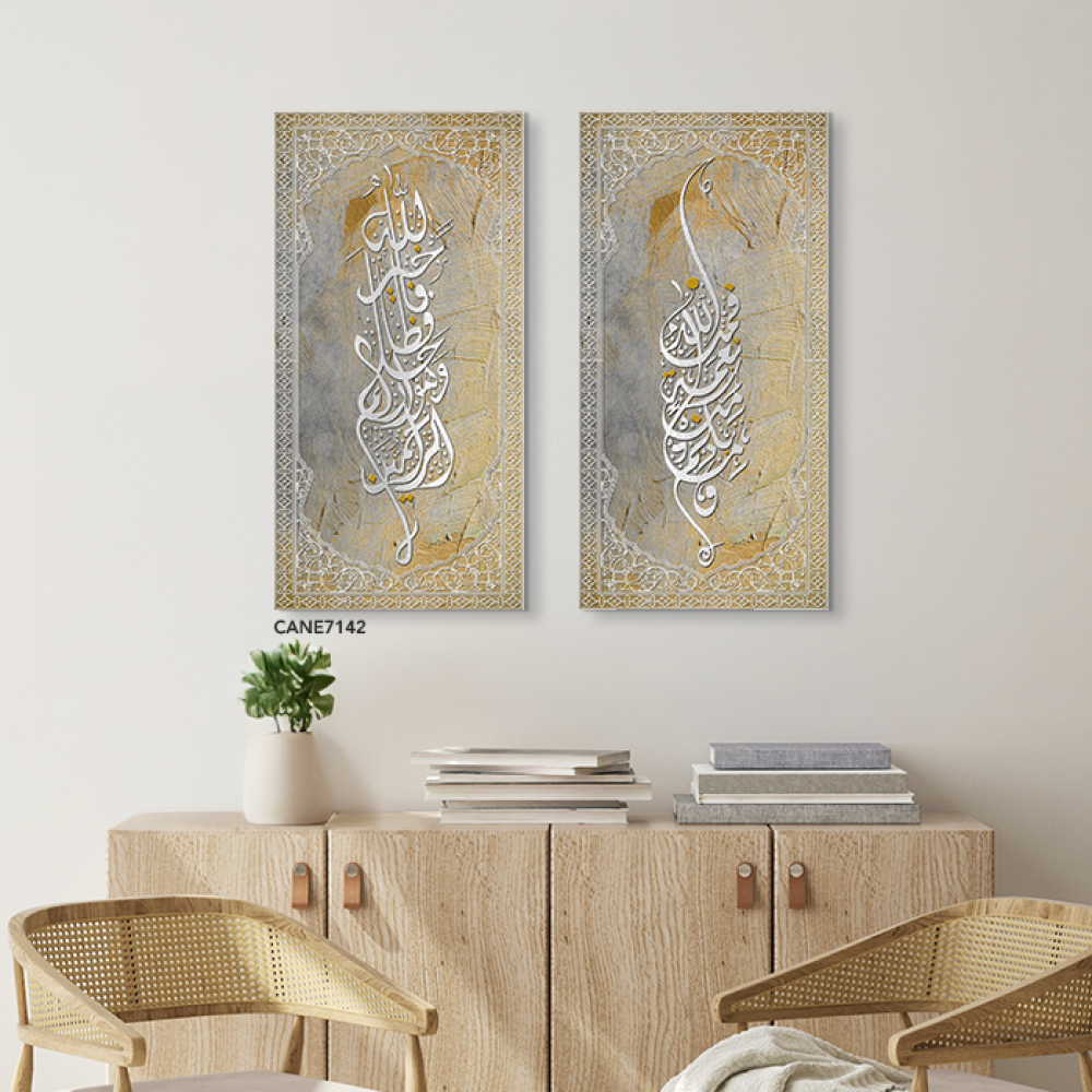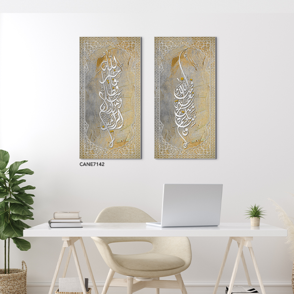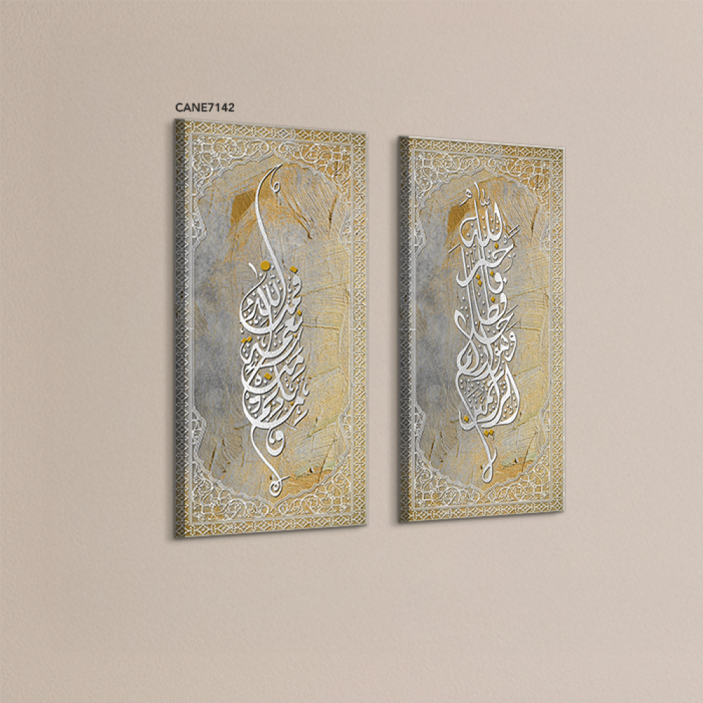 لوحة جدارية كانفس مقسمة ، آية قرأنية (الله خير حافظ - فما بكم من نعمة فمن الله) - درجات الذهبي والفضي مع البيج - خط عربي ونقوش