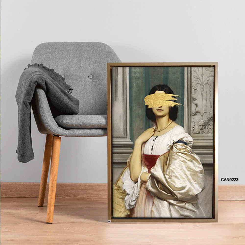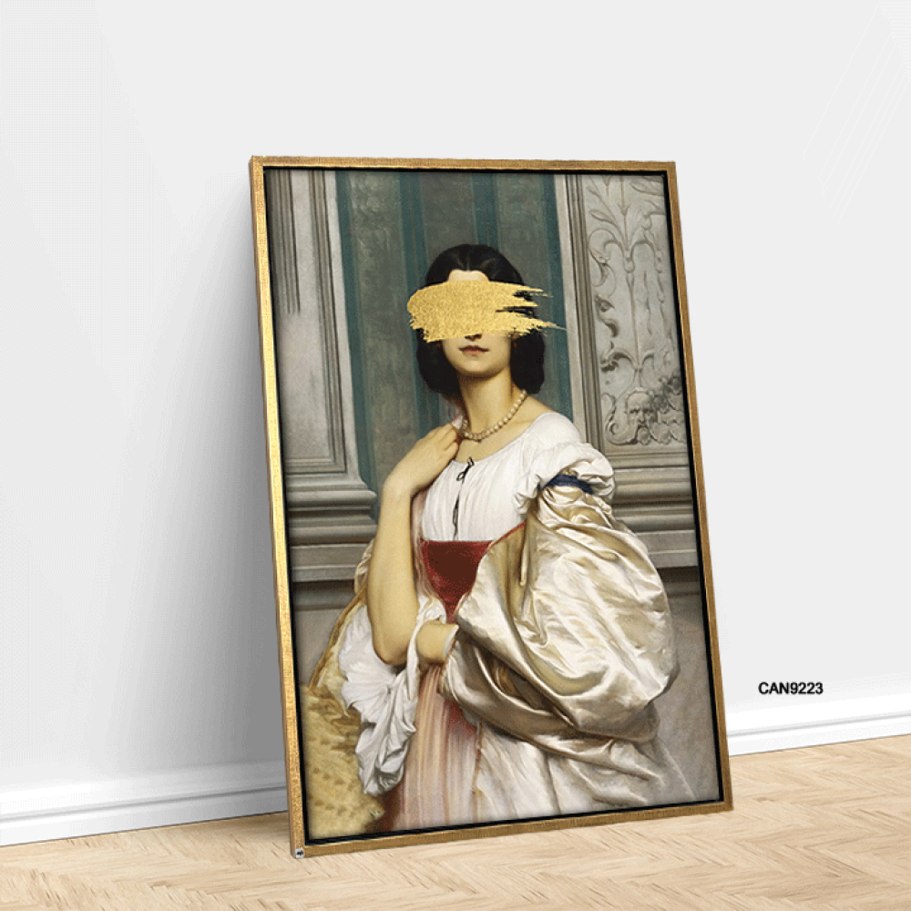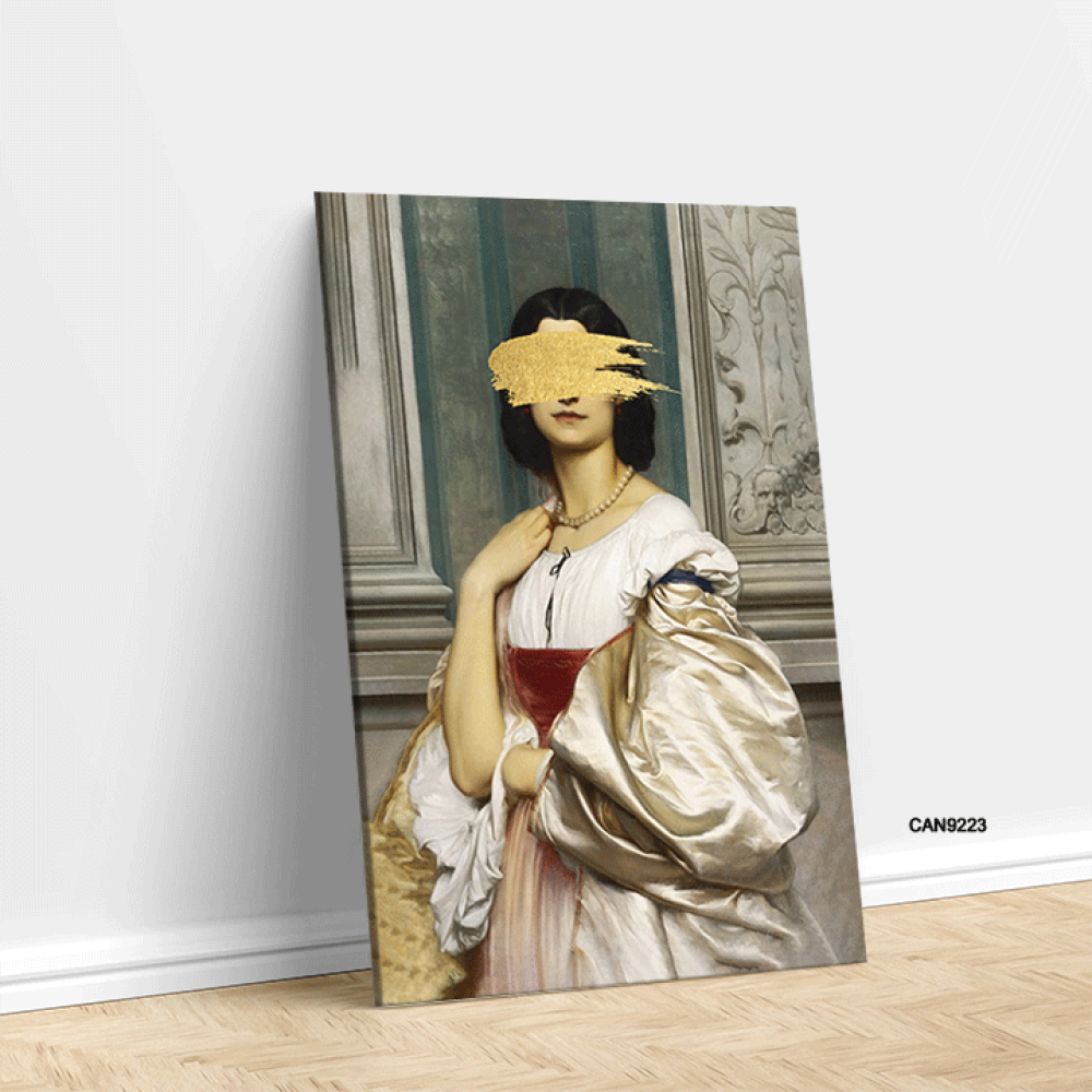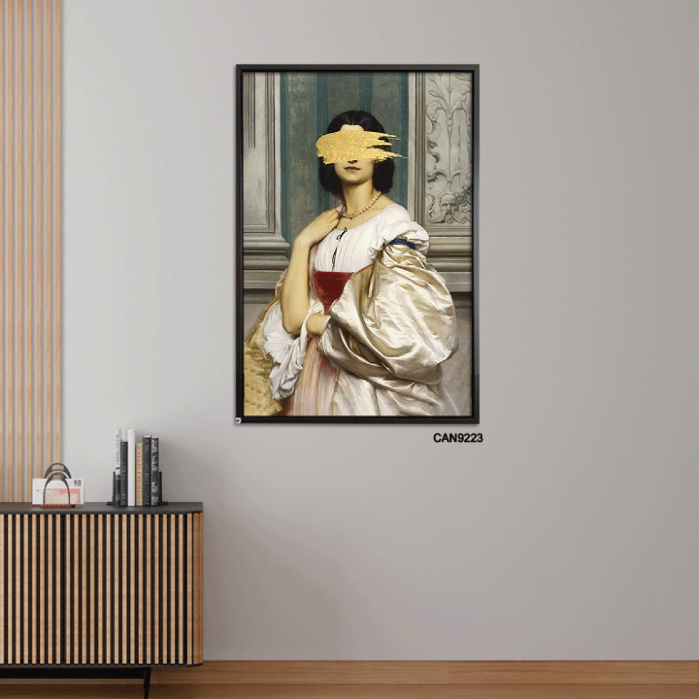 تتميز اللوحة بتصميم كلاسيكي يصور سيدة أنيقة بزي من العصور القديمة، بألوان متناغمة تشمل البيج، الزيتي، الأبيض، والأحمر، مما يمنح المكان الذي توضع فيه جاذبية فنية فريدة. تعتبر هذه اللوحة إضافة مثالية لغرف النوم وغرف المعيشة..