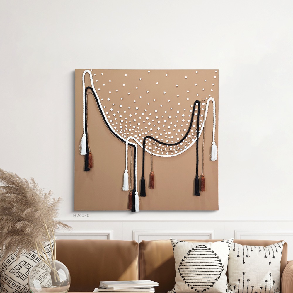 لوحة يدوية بتصميم مبتكر تجمع بين الإبداع والأناقة، تتميز بتصميم فني مبتكر يدمج المواد الطبيعية مع لمسات حرفية مميزة. خلفية اللوحة المحايدة تبرز التفاص...