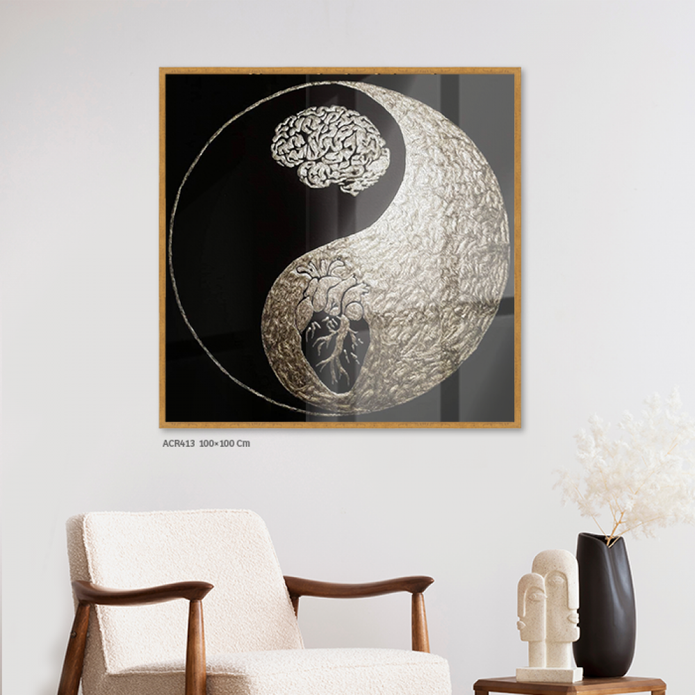 لوحة جدارية أكريليك يتضمن مفهوم اليين واليانغ ( العقل ، والقلب ) ، حيث يُظهر دائرة بالألوان الأسود والفضي