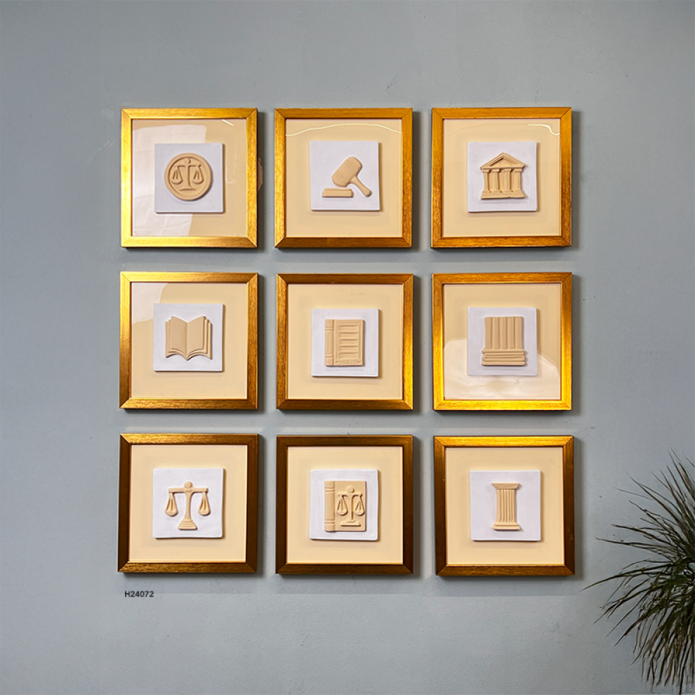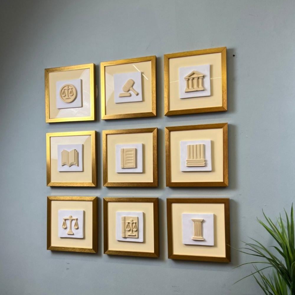 تشكيلة مميزة من تسع لوحات فنية مصممة بعناية لتجسّد رموزًا قانونية كلاسيكية بأسلوب نحتي ناعم. تتوزع الرموز – مثل الميزان، القاضي، الكتب، والأعمدة – على خلفيات بيضاء بارزة، داخل إطارات مربعة أنيقة بلون ذهبي مطفي يمنح القطع طابعًا فاخرًا ومتناسقًا.تضفي هذه المجموعة طابعًا مؤسسيًا أنيقًا، وتُعد مثالية لتزيين مكاتب المحاماة، قاعات الاجتماعات- كود المنتج : H24072- سهلة التركيب لوجود حامل خلفي .- جاهزة للتركيب (يوجد مسامير او لاصق مرفقة مع الطلب) .-.- يمكن اختيار نوع وشكل الاطار حسب الطلب.- للتعديل على الألوان او المقاسيرجى التواصل واتس على 0556823009 .