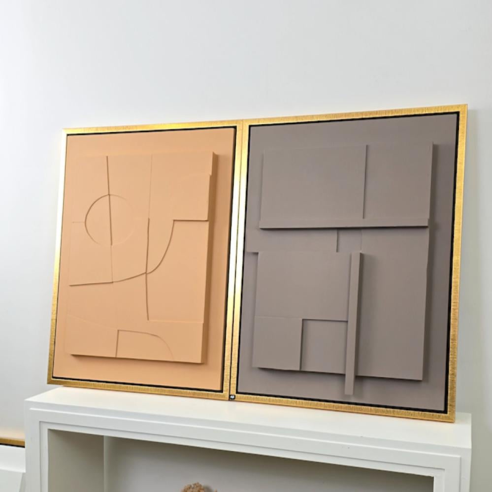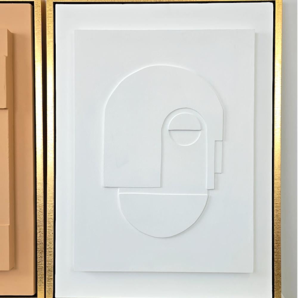 مجموعة من 3 لوحات جبسية بتصميم هندسي يصور اشكال متداخلة ووجه تجريدي . تتكون اللوحتين على اليمين واليسار من تقسيمات هندسية ناعمة وخطوط تندمج بتوازن ،ال...