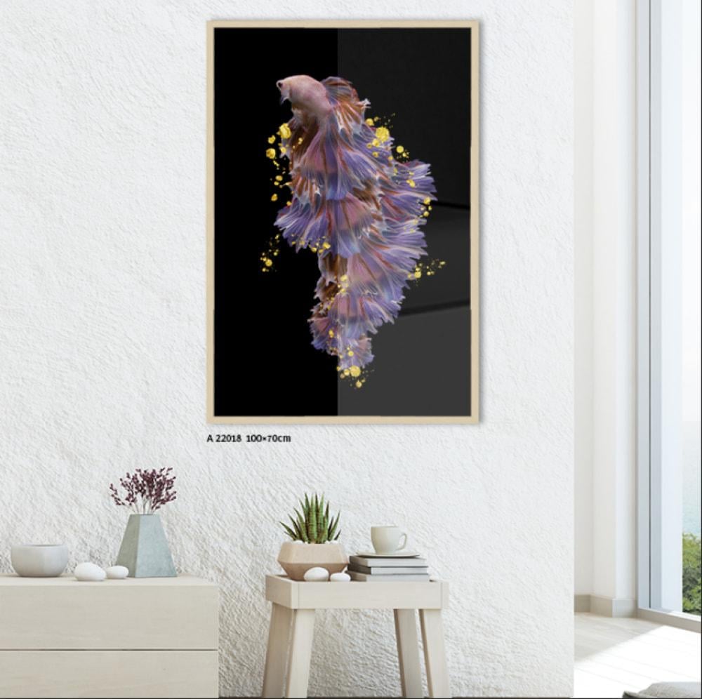 استمتع بإضافة لمسة من الفن والجمال البحري إلى مساحتك مع هذه اللوحة الجدارية الأكريليك التي تبرز تفاصيل سمكة ساحرة بتدرجات البنفسجي والذهبي والأسود. يج...
