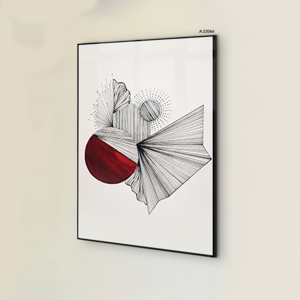 أضف لمسة فنية جريئة إلى مساحتك مع لوحة جدارية أكريليك بتصميم تشكيلي يجمع بين تدرجات الأبيض والأسود مع دائرة حمراء تضفي تميزًا وإشراقًا على التصميم. تج...