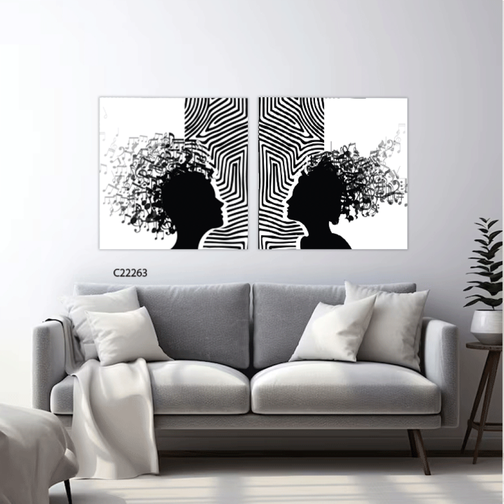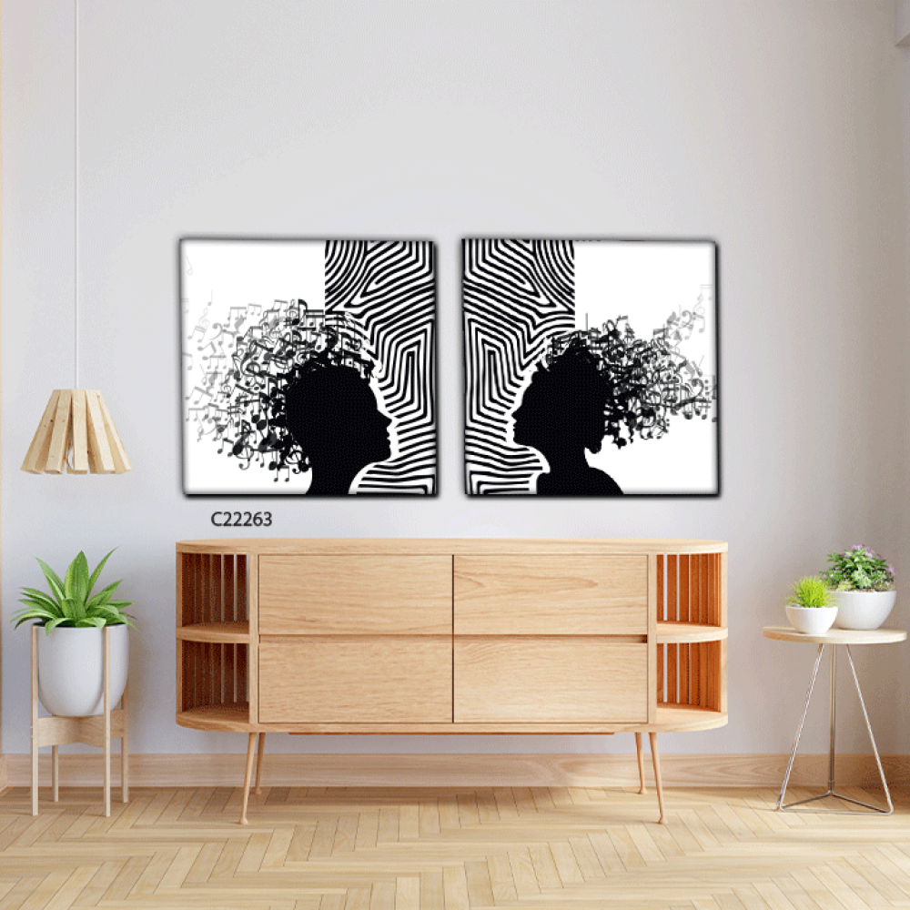 لوحة جدارية كانفس مقسمة وجوه اشخاص ونوتات موسيقى ابيض واسود
