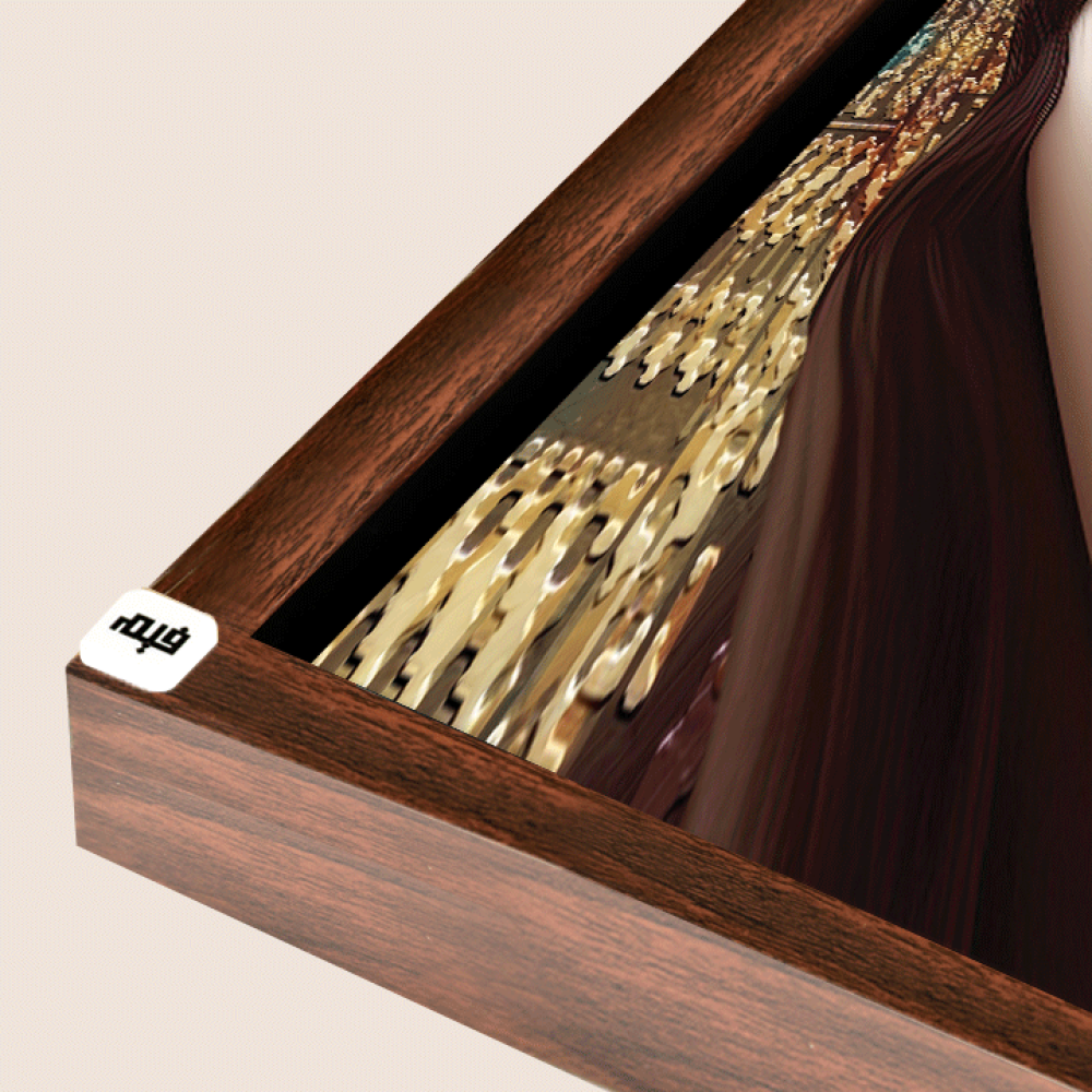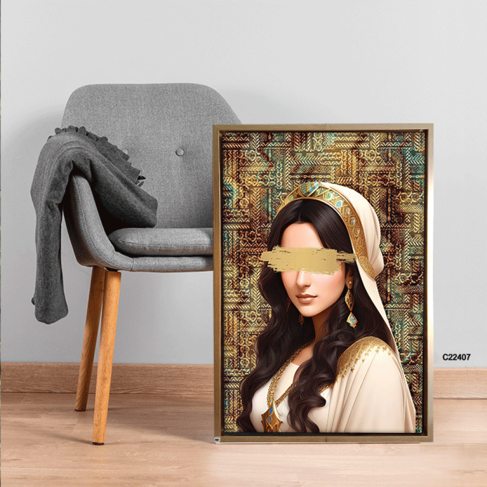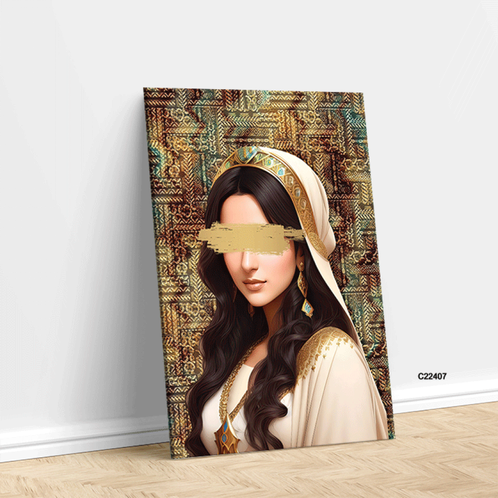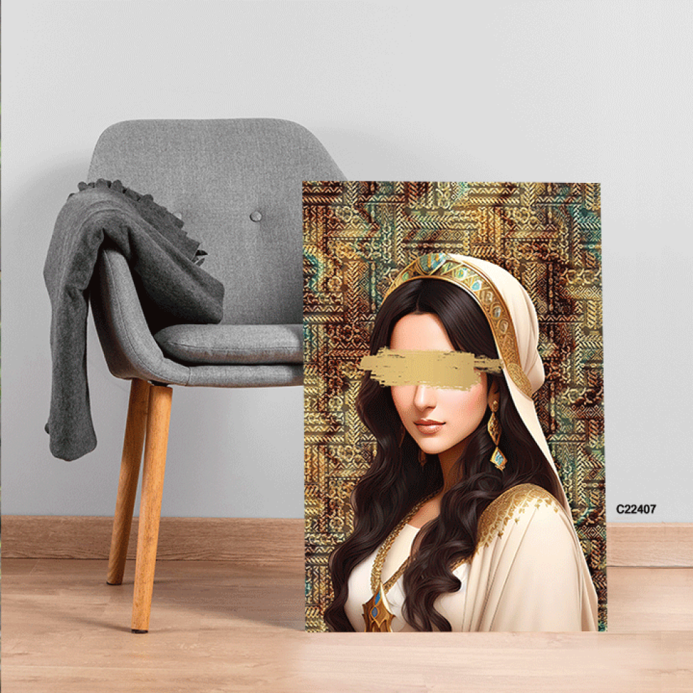 تتميز هذه اللوحة بتصميم مذهل لامرأة ترتدي رداء بيج، وشعرها الطويل يتدلى بانسيابية، متزينة بالحلي الذهبي وتدرجات التيفاني. تبرز خلفية اللوحة بالنقوش وا...
