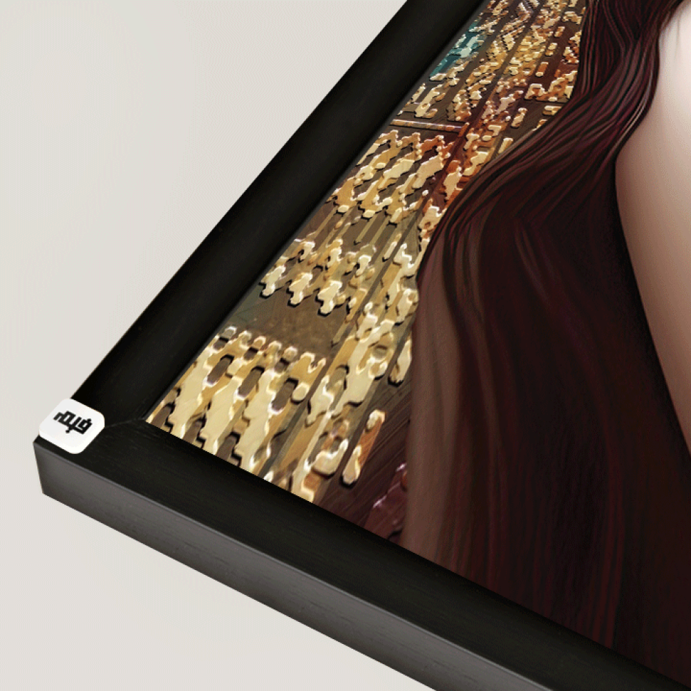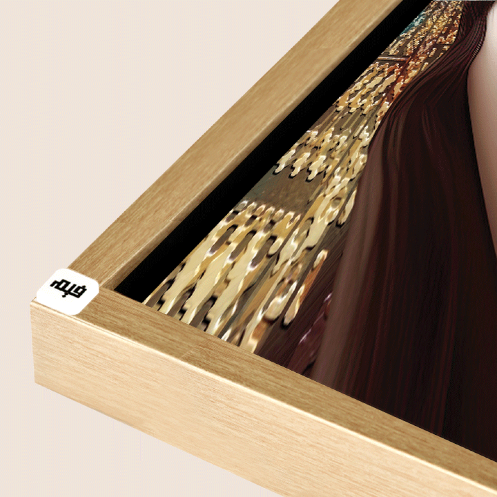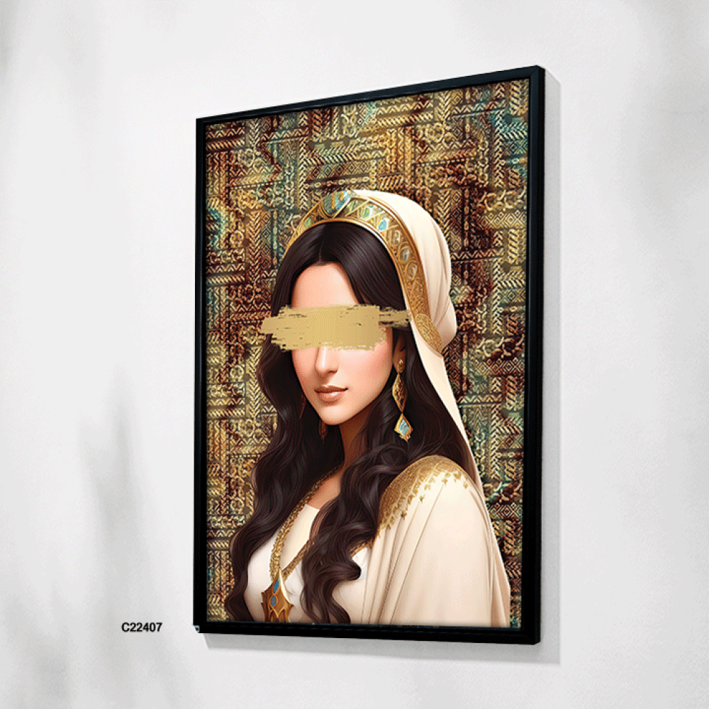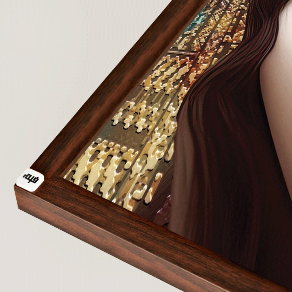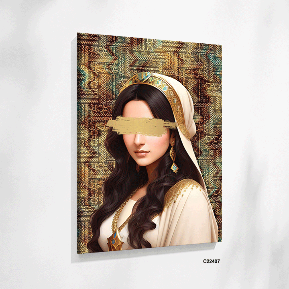 تتميز هذه اللوحة بتصميم مذهل لامرأة ترتدي رداء بيج، وشعرها الطويل يتدلى بانسيابية، متزينة بالحلي الذهبي وتدرجات التيفاني. تبرز خلفية اللوحة بالنقوش وا...