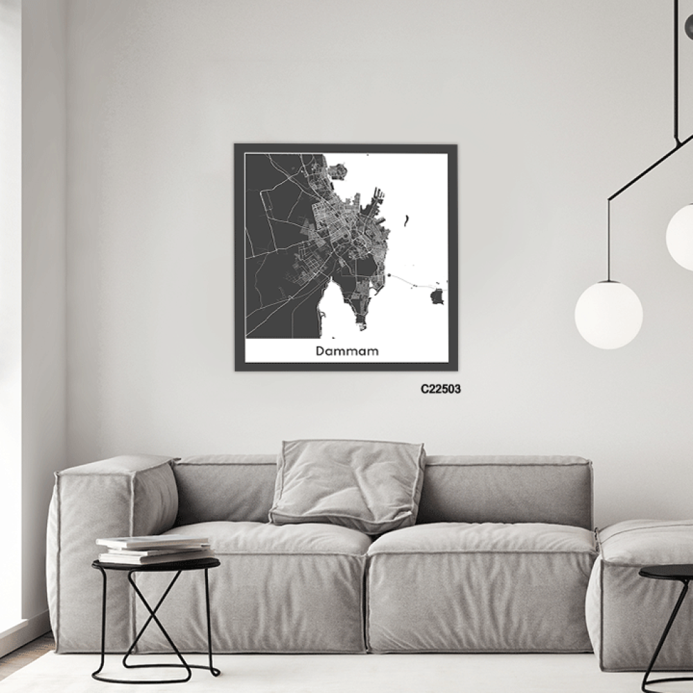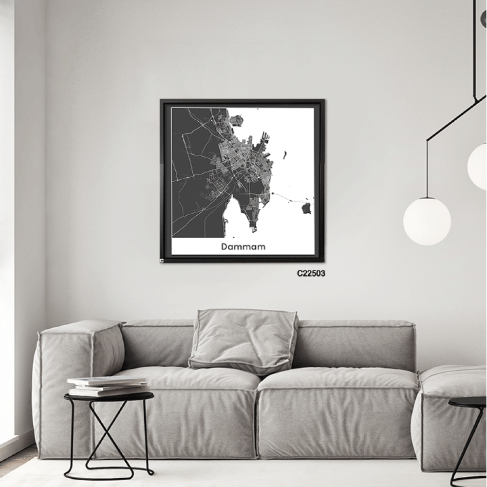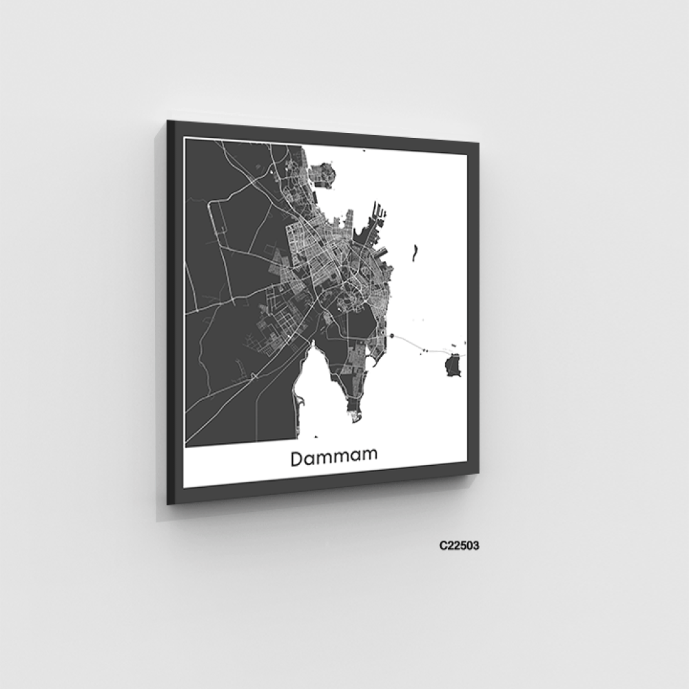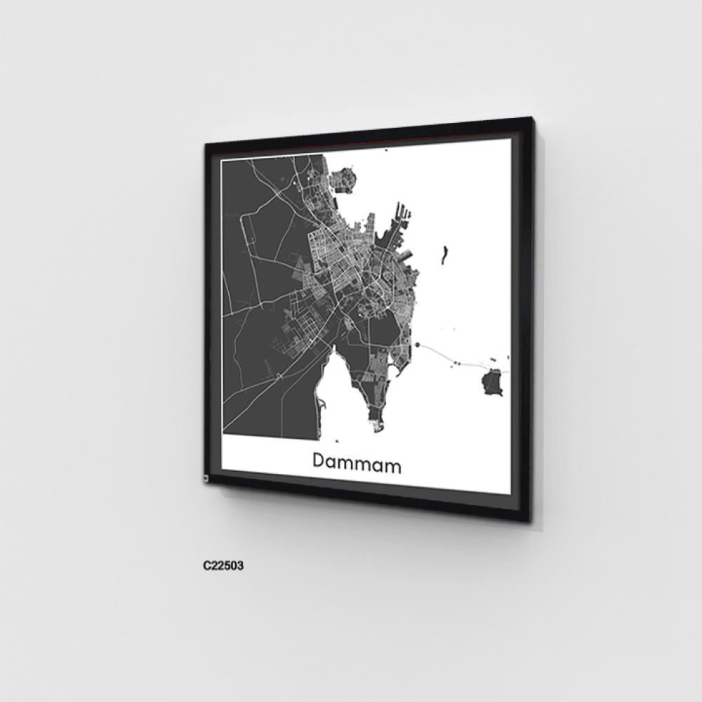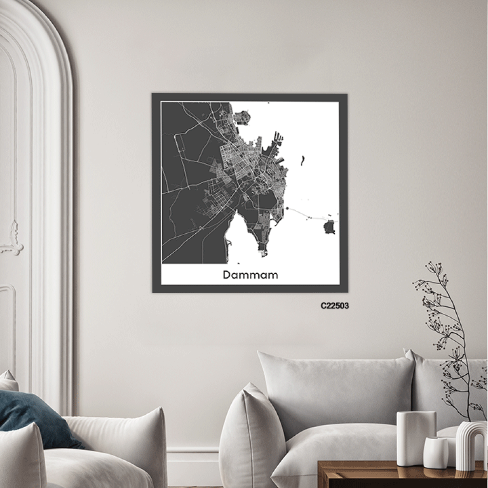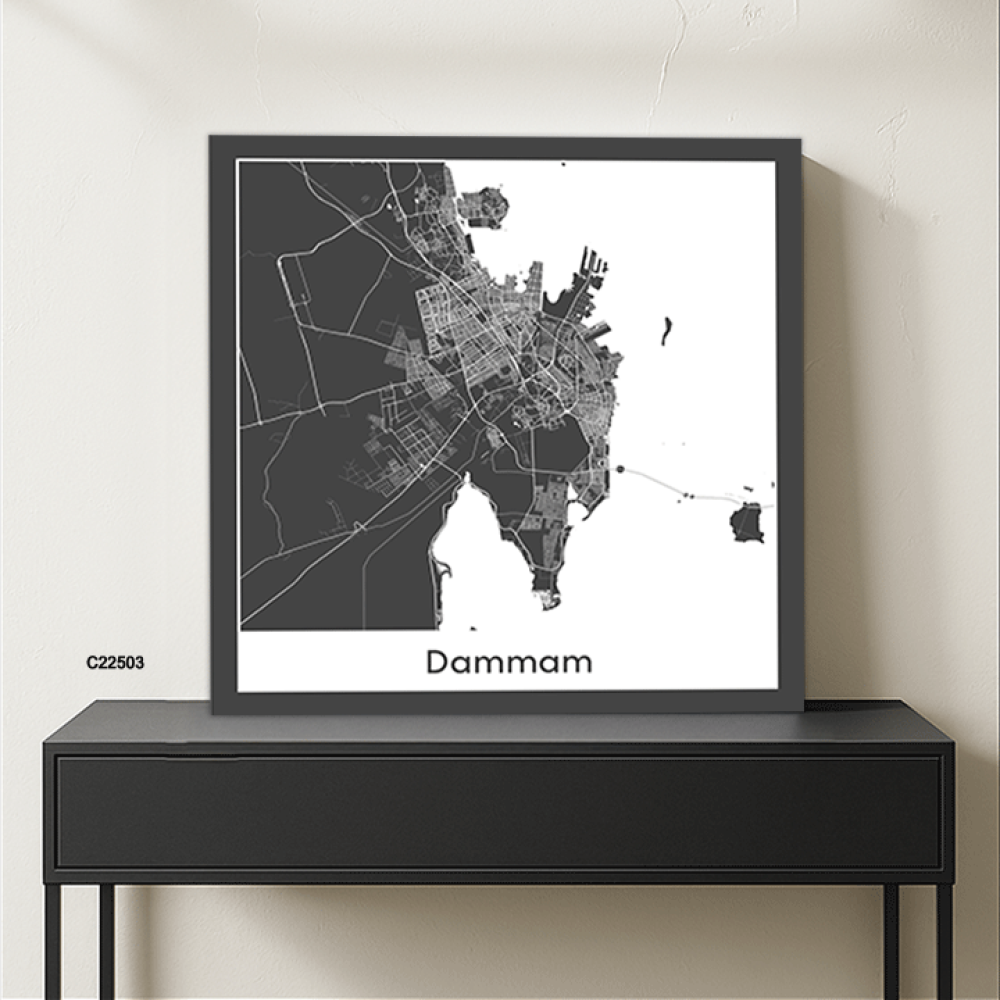 أضف لمسة من الحداثة والأناقة إلى ديكور منزلك أو مكتبك مع هذه اللوحة الجدارية الفنية التي تعرض خريطة مدينة الدمام بالأبيض والأسود. تُبرز هذه اللوحة تفا...
