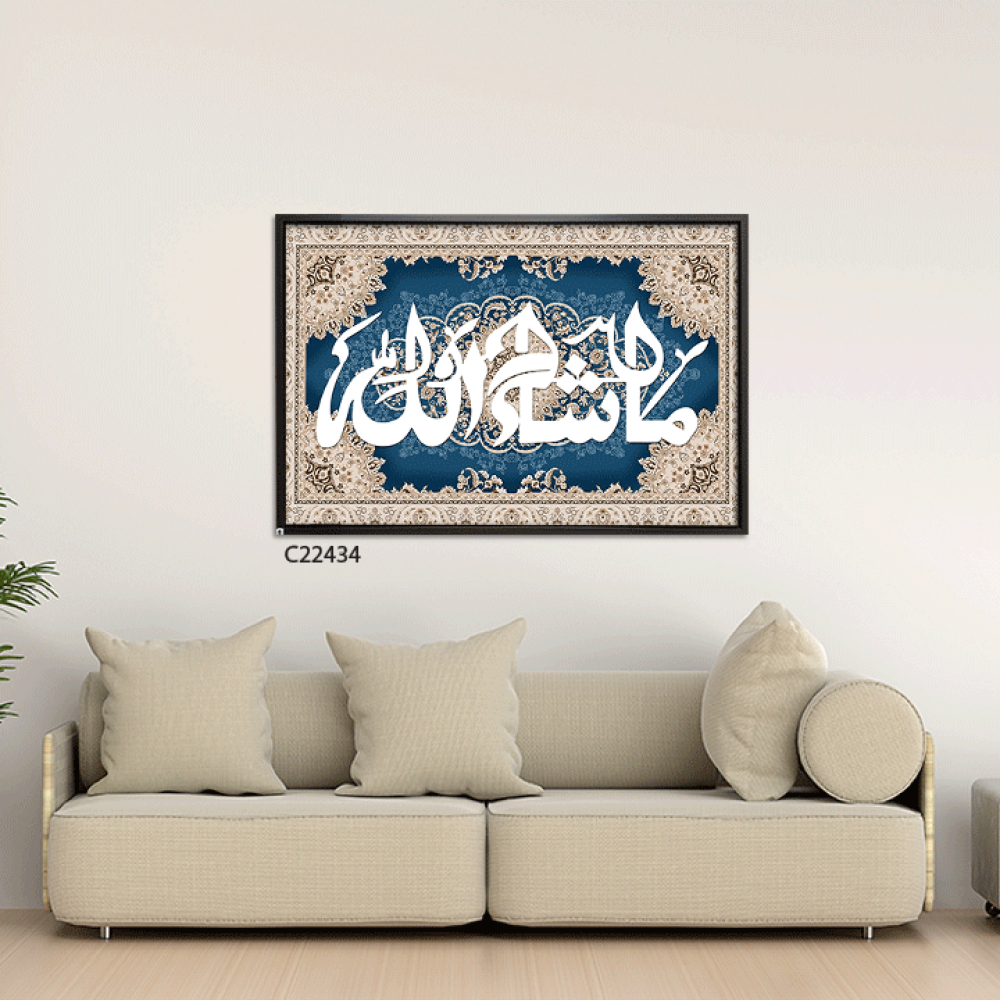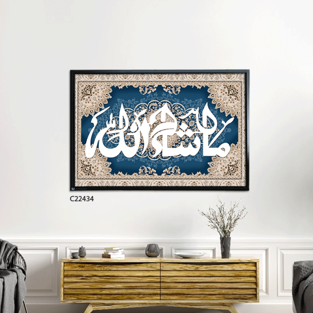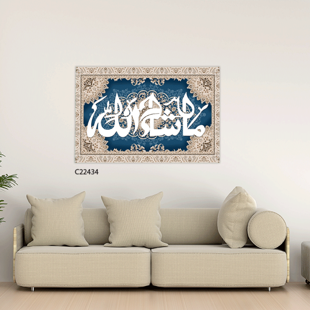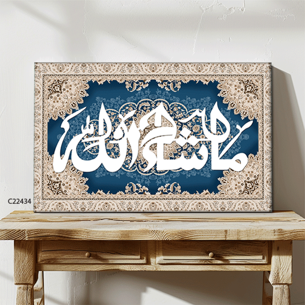 لوحة جدارية كانفس (ما شاء الله ) نقوش سجاد كحلي وبيج