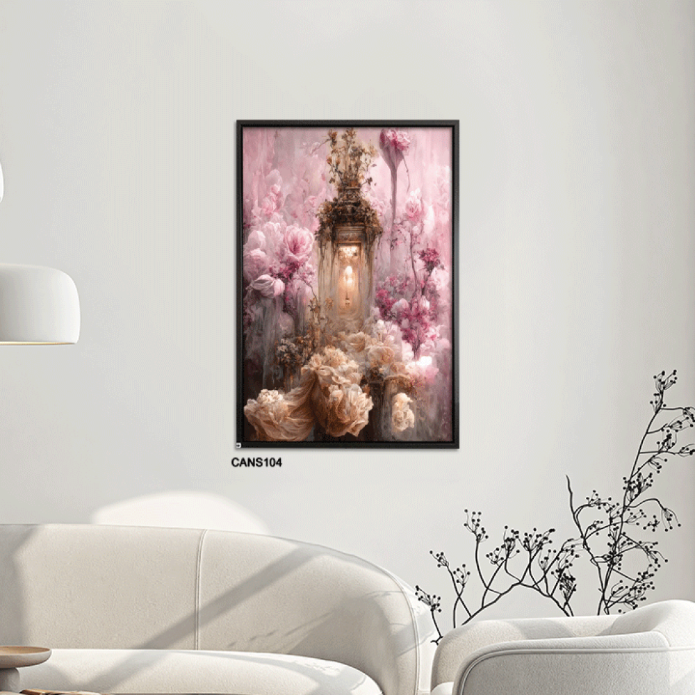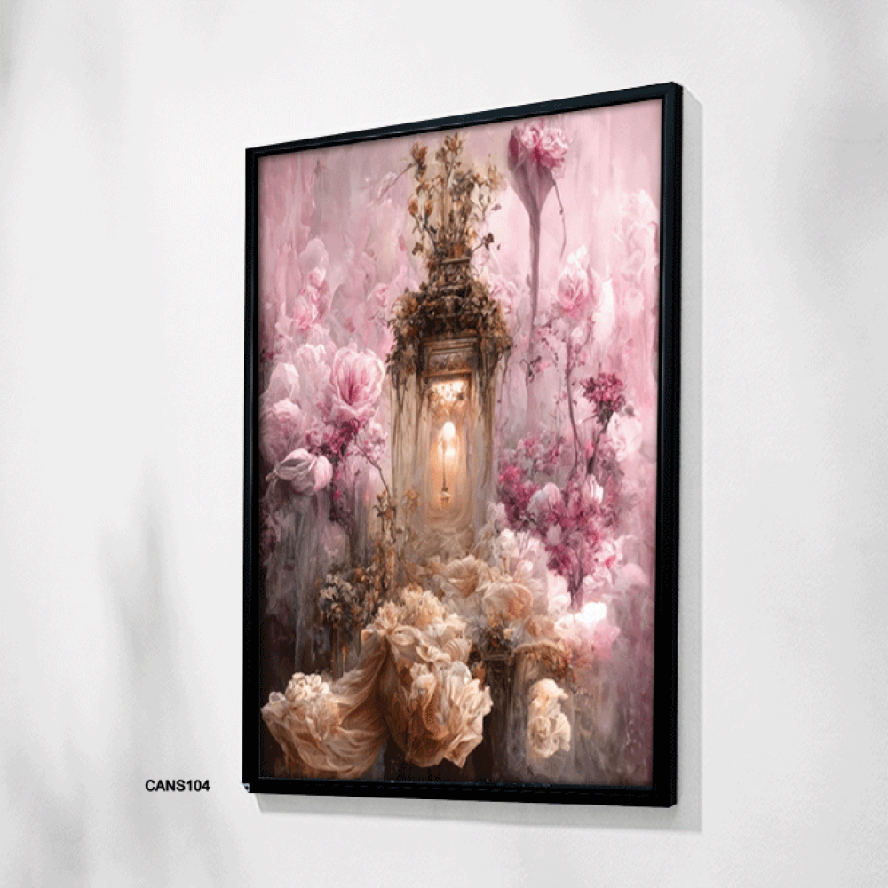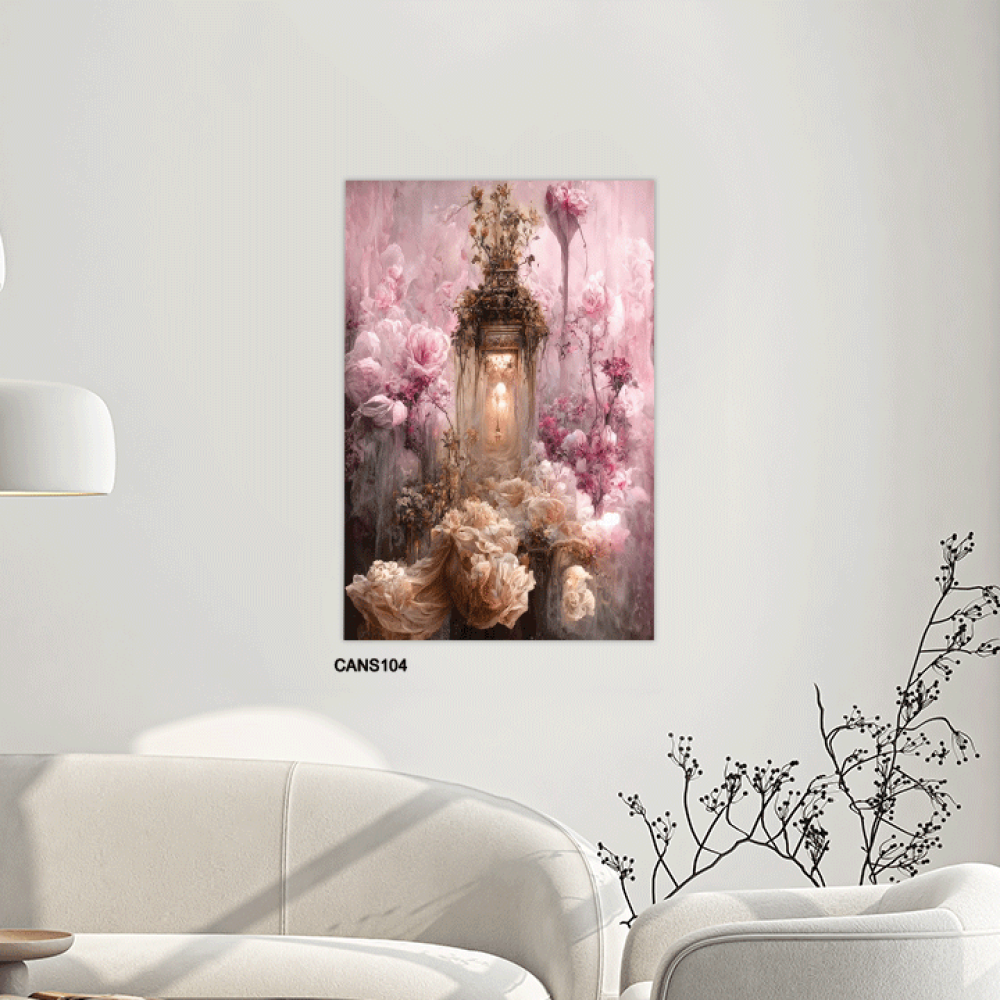أضف لمسة مبهجة لديكورك مع هذه اللوحة الجدارية الكانفس الرائعة. تتميز اللوحة بتصميم فني يظهر قصرًا محاطًا بورود بتدرجات الوردي و البيج مع البني، مما يض...