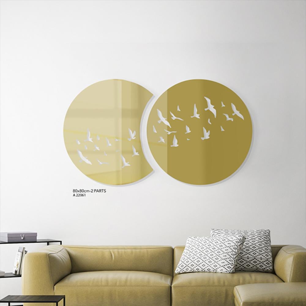 أضف لمسة من الجمال العصري إلى ديكور منزلك مع لوحة جدارية أكريليك مقسمة بتصميم يجمع بين الدوائر والعصافير بتدرجات اللون الذهبي. هذه اللوحة الفنية تتميز...
