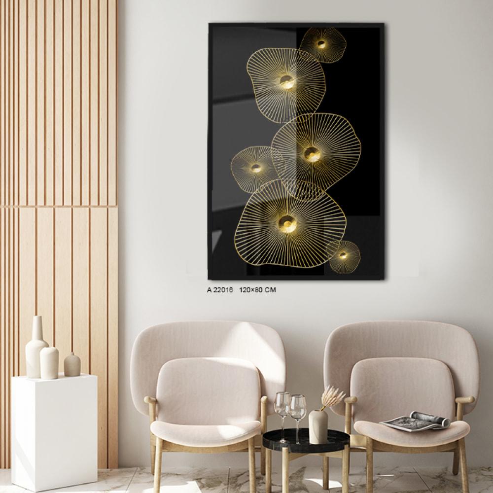 تتميز هذه اللوحة الفنية الجدارية الأكريليك بتصميم مبتكر يتناغم فيه شكل الدوائر مع تدرجات الألوان الذهبية والأسود، مما يضفي عليها لمسة من الفخامة والتم...