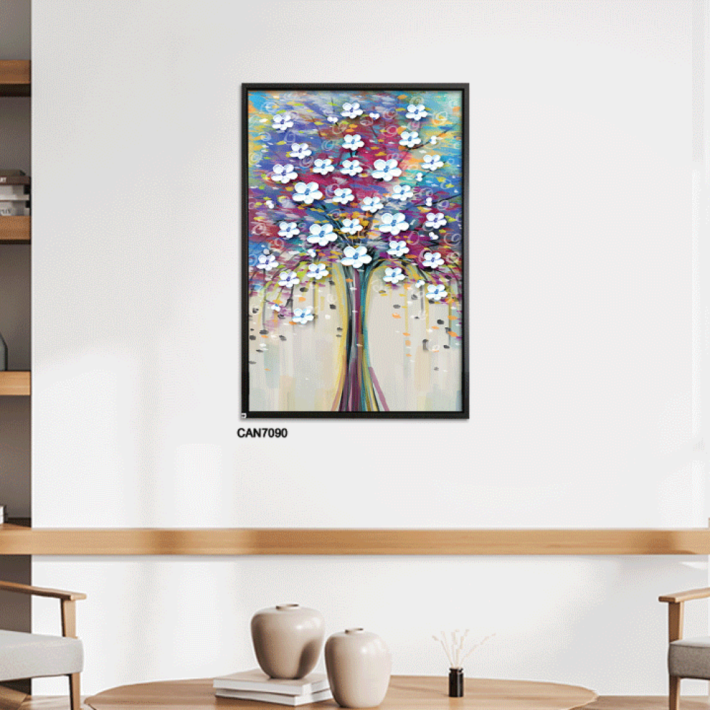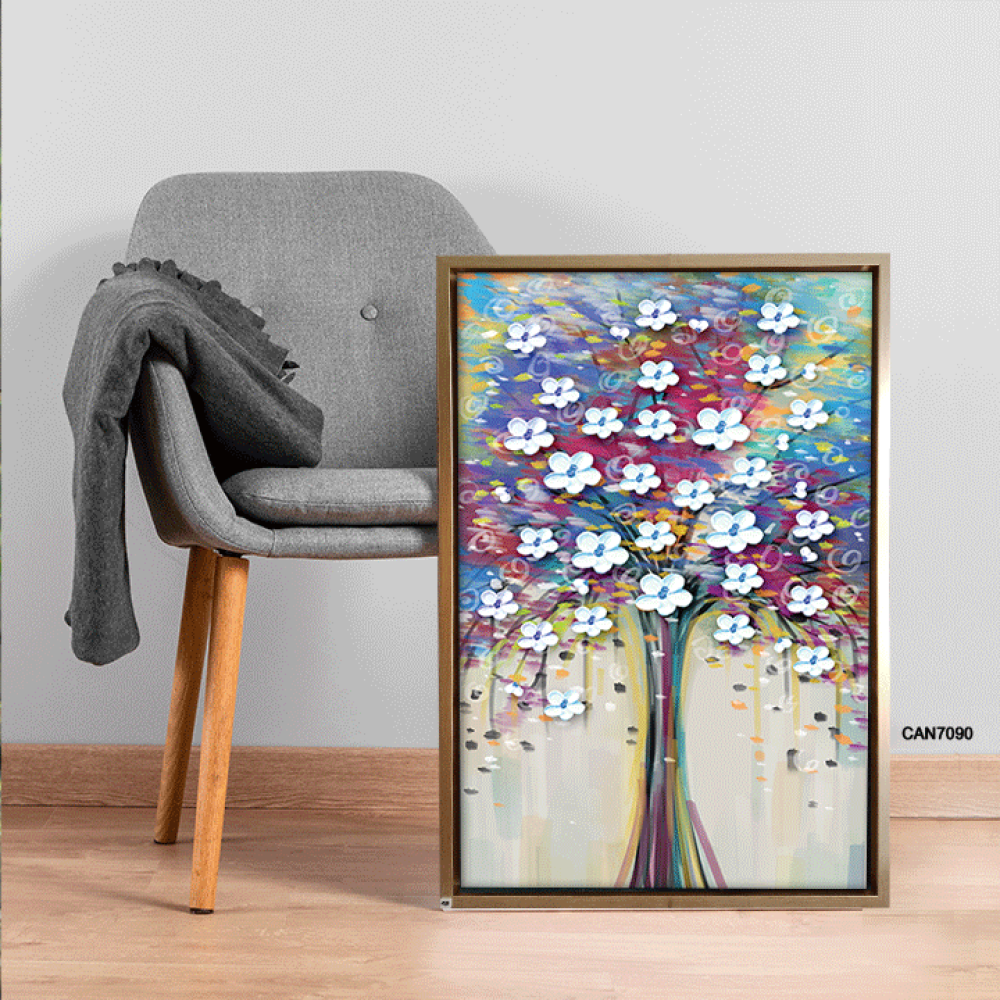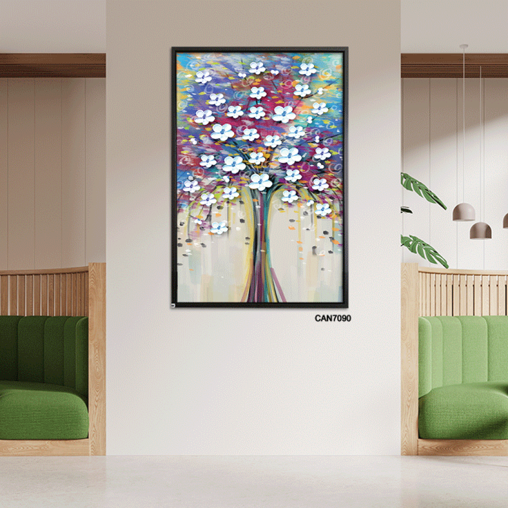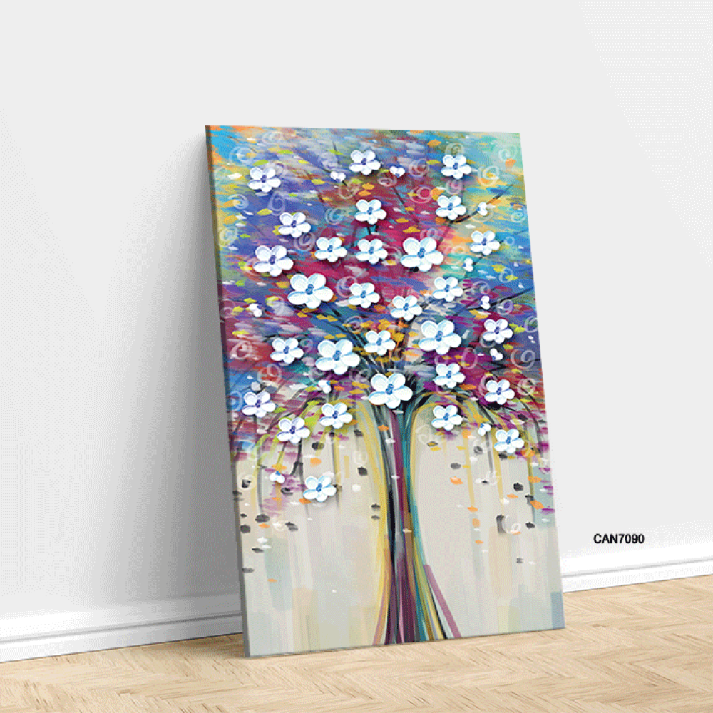 لوحة فنية جدارية كانفس شجرة ملونة بألوان زاهية وورد بيضاء
