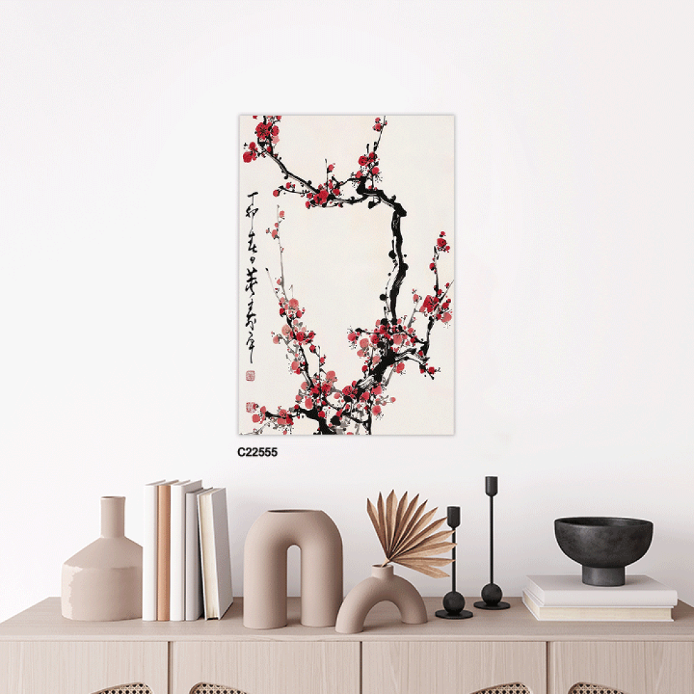أضف لمسة فنية وثقافية مميزة إلى ديكور منزلك مع لوحة كانفس التي تصور فرع شجرة مزهر بتدرجات الأحمر والأسود، مستوحاة من الطابع الصيني التقليدي.مميزات لوح...